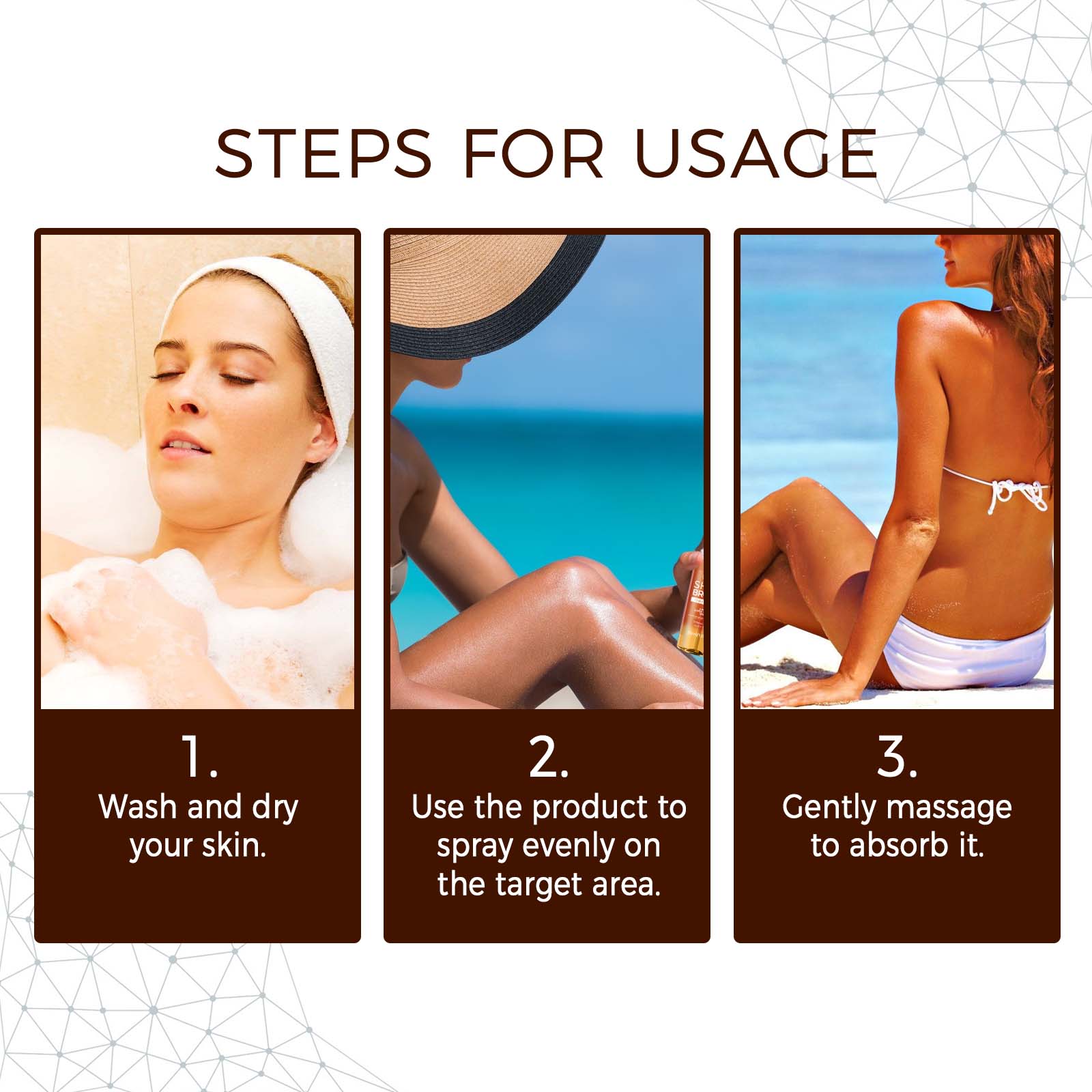 我们的助黑喷雾含有向日葵籽油、榛籽油、核桃籽油。它有助于帮助立即打造美丽的肤色,深色和自然的棕褐色。它的使用方法很简单:洗净擦干皮肤,使用本品均匀喷于目标部位,轻轻按摩吸收即可。使用后清爽不油腻,快速吸收,拥有自然舒适的古铜肤色。