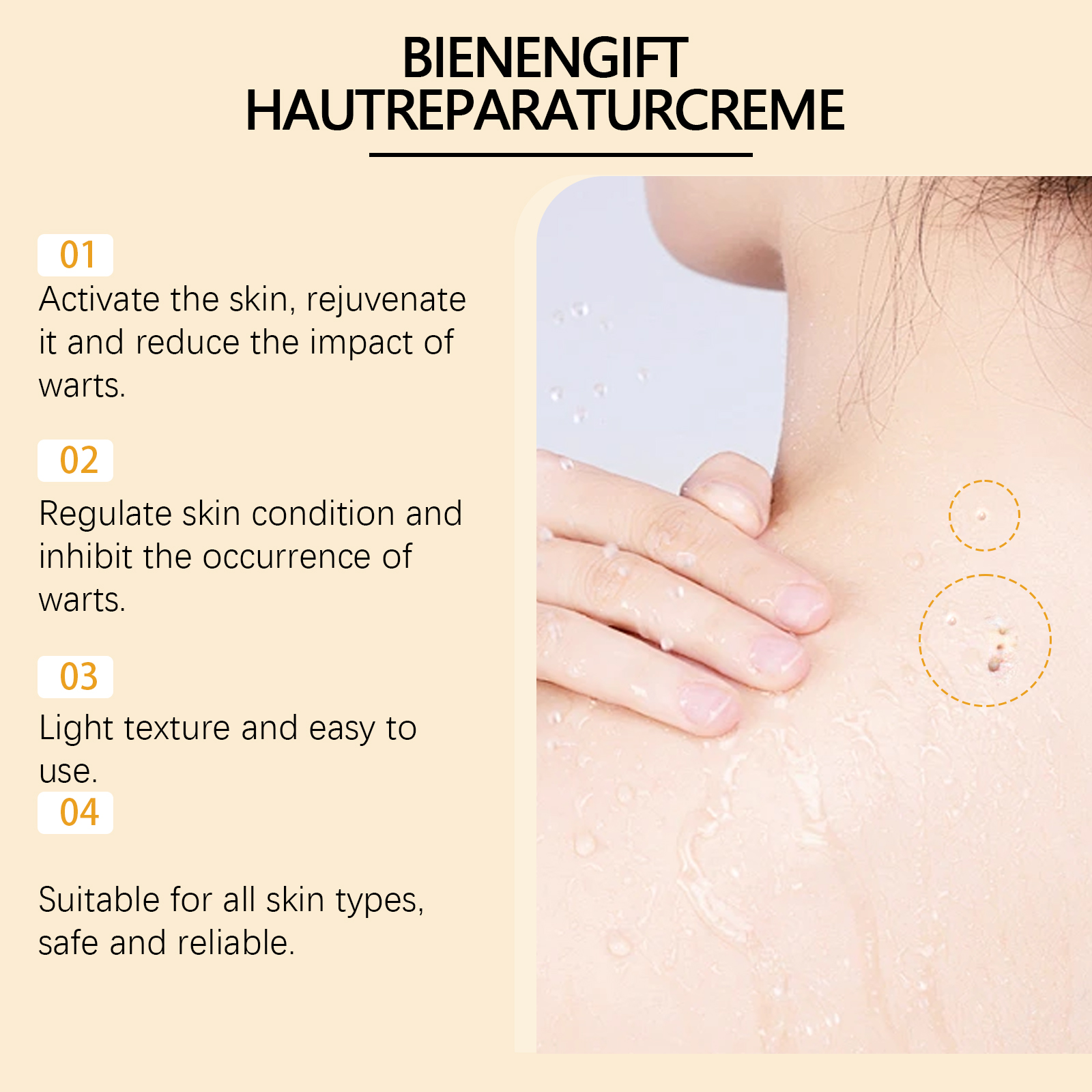 我们的皮肤护理霜含有矿油、甘油硬脂酸酯。它可以抑制瑕疵的再生,长期使用后使肌肤更加均匀。它的使用方法很简单:清洁皮肤,取适量霜体轻轻涂抹于疣和痣上,然后均匀涂抹,等待吸收。并且采用便携式设计,携带方便,随时随地享受专业护理。