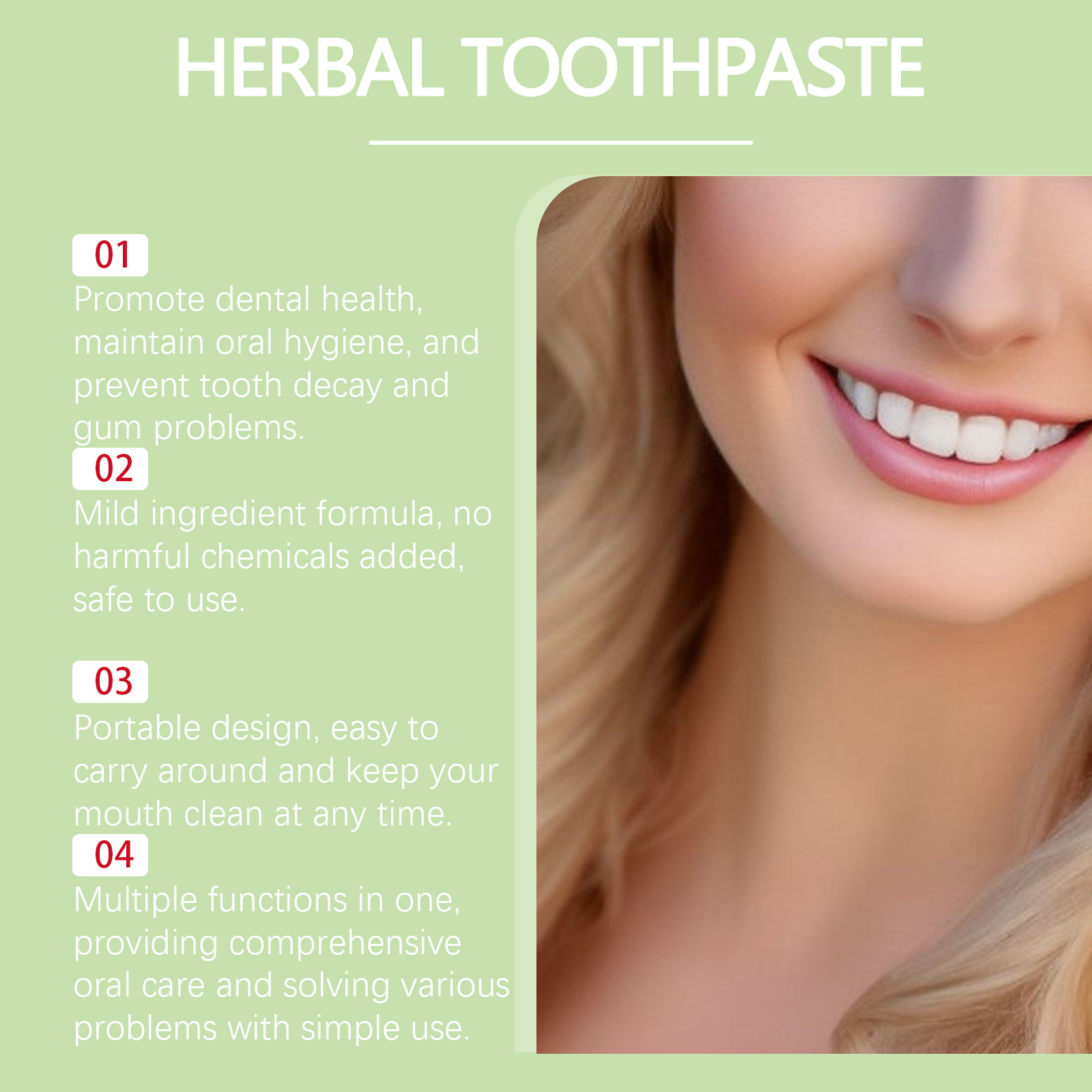 我们的芦荟清洁牙膏含有甘油、薄荷提取物、芦荟叶提取物。它可以美白牙齿,显着改善牙齿的光泽。有效去除牙齿表面的黄斑和污渍。它的使用方法很简单:1.取适量本品涂在牙刷上;2.用正确的刷牙方法轻轻地刷牙3分钟。3.用清水彻底漱口。防止酸蚀,保护牙釉质,增强牙齿保护。美白牙齿,显着改善牙齿的光泽。