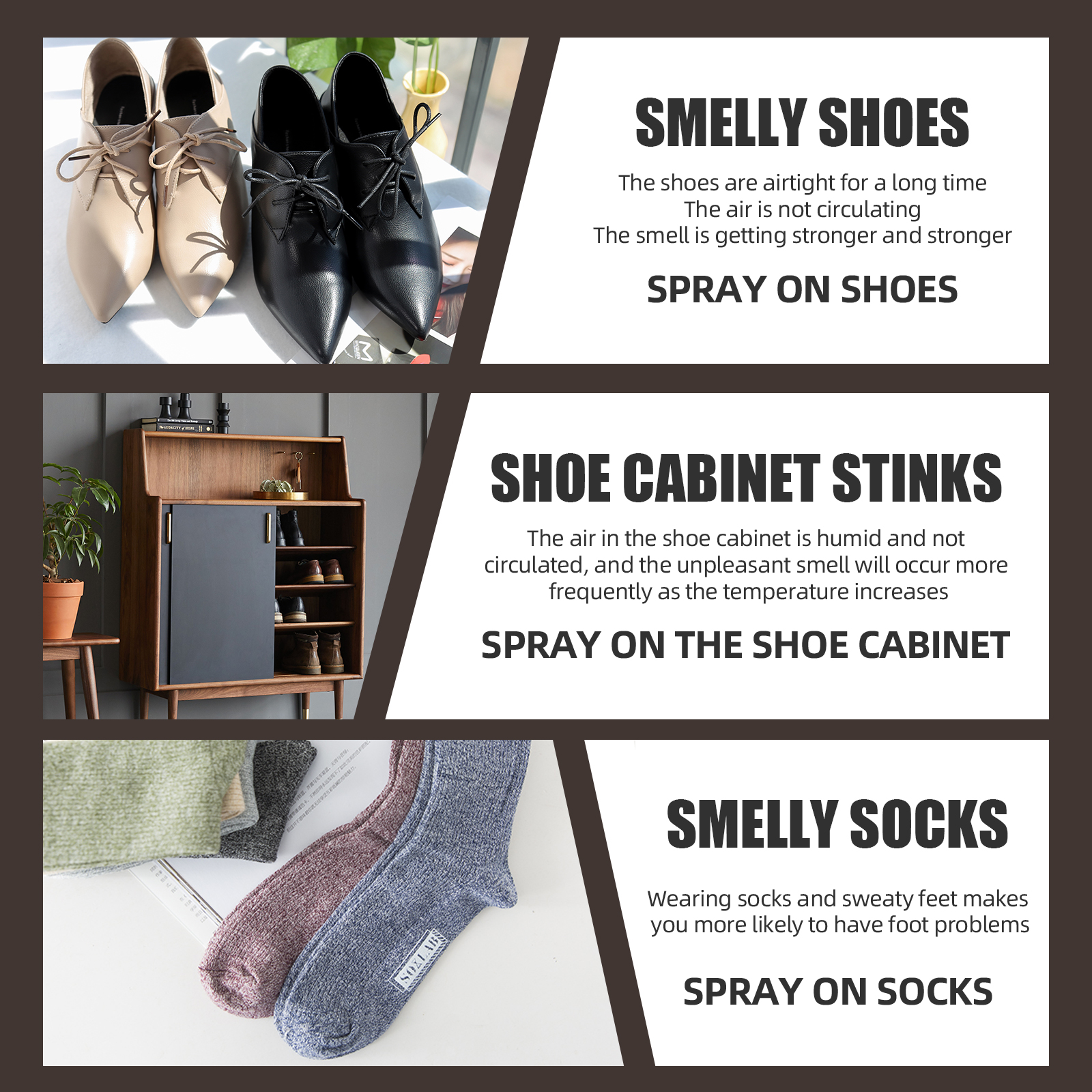 我们的鞋袜除臭剂含有氯化银、柑橘柠檬(柠檬)果提取物。它可以除去鞋子上的臭味,高效进行杀菌,让鞋柜和鞋子周围的空气变得清新。它的使用方法很简单:首先先摇一摇除臭剂,之后在袜子鞋上喷除臭剂,轻轻按压1-2次,干了就可以穿了。使用后彻底消除鞋子臭味,有效抵御细菌,让你鞋子上的味道彻底消失。