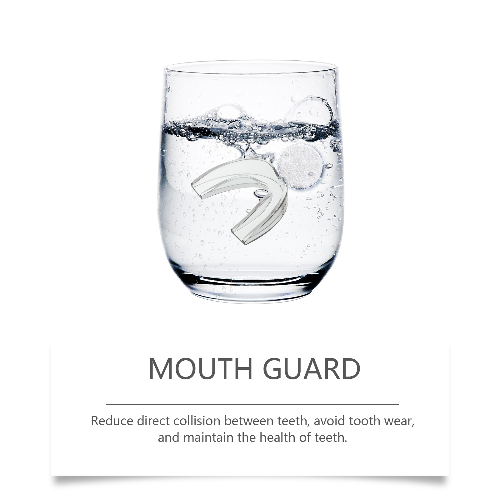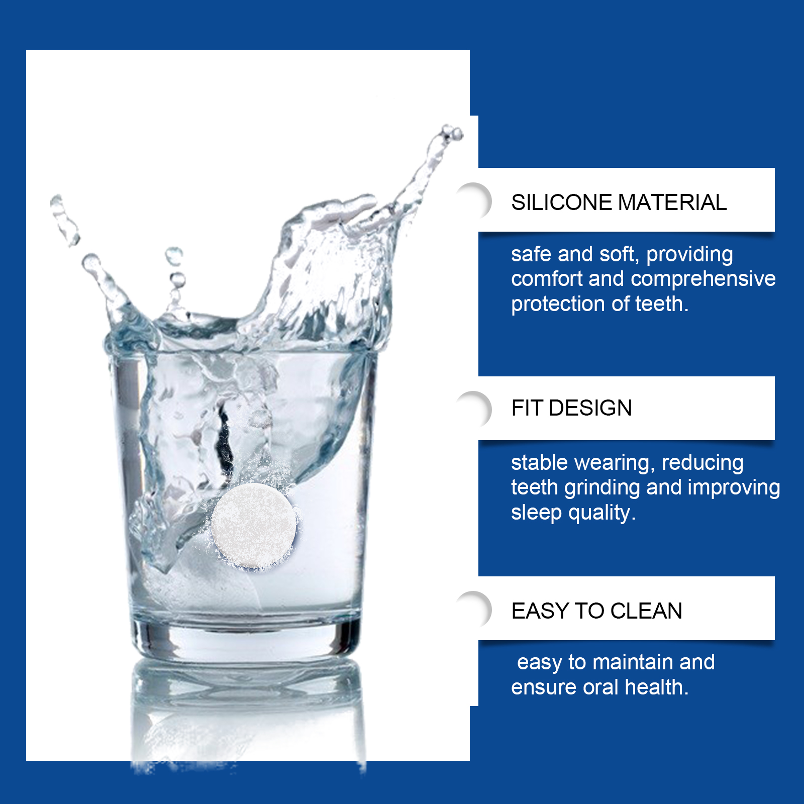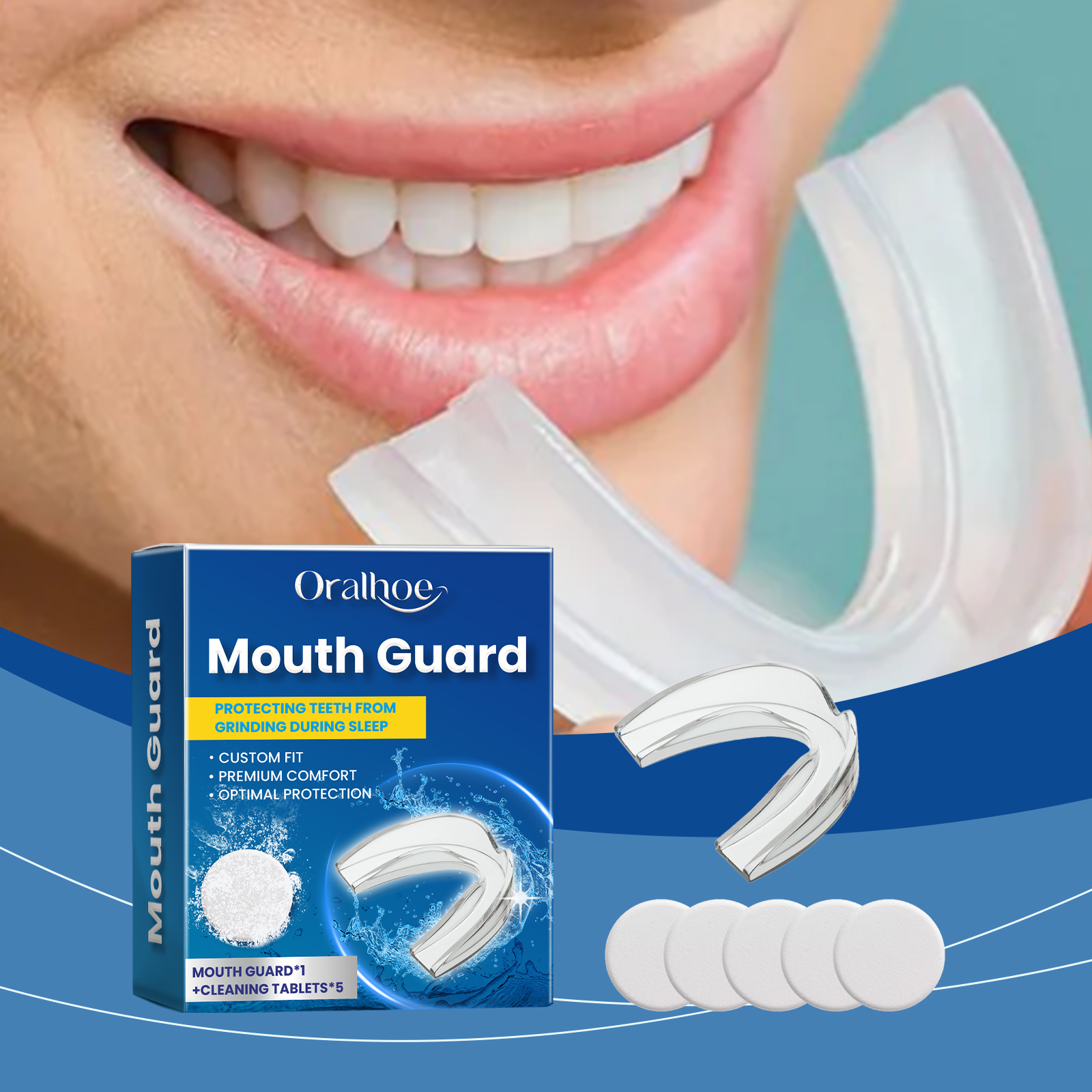 我们的夜间护齿套装含有EDTA 二钠、碳酸氢钠、月桂醇聚醚-7。它可以减少牙齿之间的直接碰撞,避免牙齿磨损,保持牙齿健康。它的使用方法很简单:1.睡觉前,轻轻将牙套套在上牙或下牙上,轻轻按压牙套边缘,使其紧贴牙齿,醒来后取下。2.将清洁片放入水中,等待其完全溶解。将用过的护齿器放入清洁液中浸泡5-10分钟。擦拭内部和外部表面,用流动的水彻底冲洗,直到所有残留物被清除。柔软硅胶,穿着舒适无异物感。专业设计,有效减少夜间磨牙的伤害。