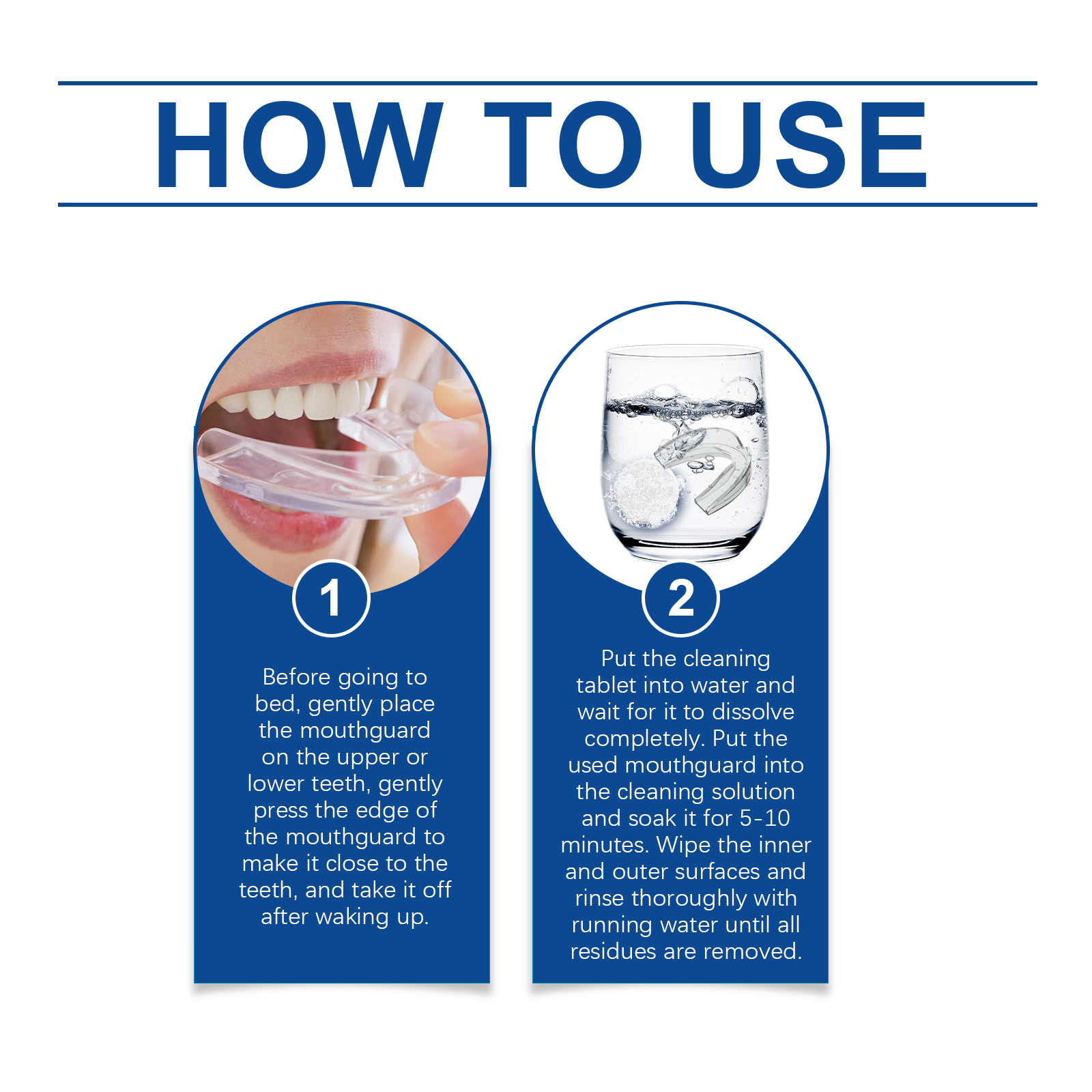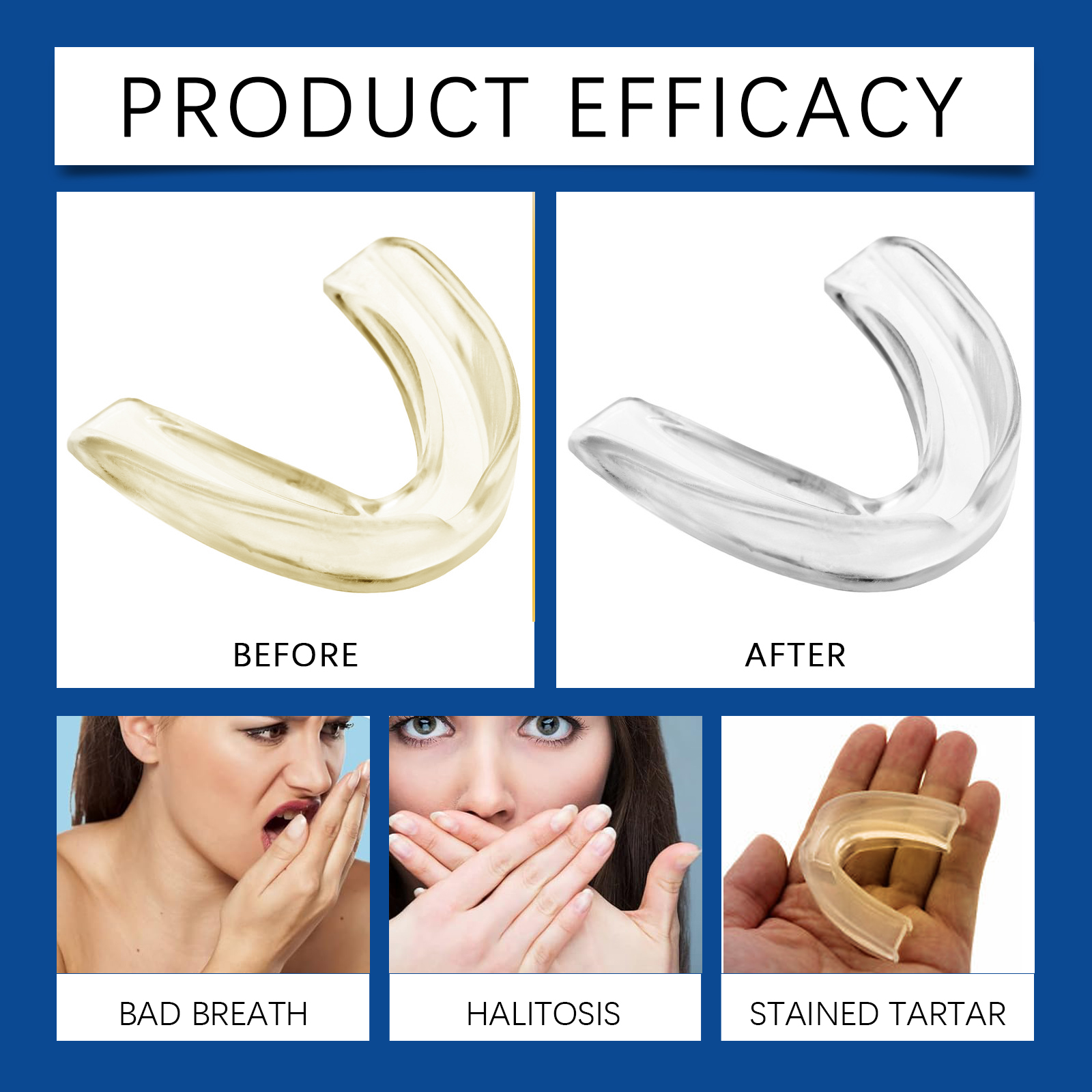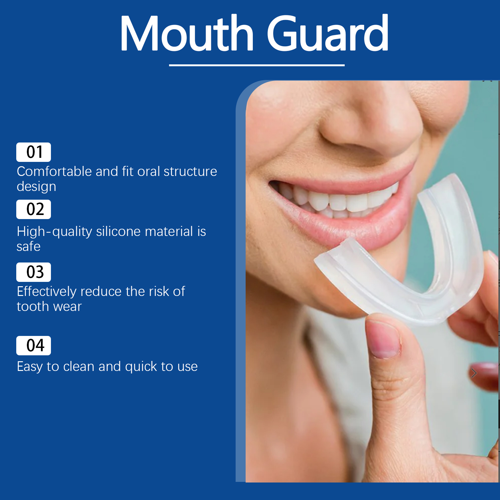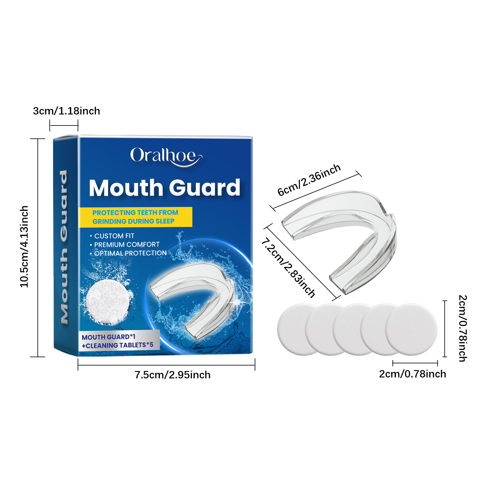 我们的夜间护齿套装含有EDTA 二钠、碳酸氢钠、月桂醇聚醚-7。它可以减少牙齿之间的直接碰撞,避免牙齿磨损,保持牙齿健康。它的使用方法很简单:1.睡觉前,轻轻将牙套套在上牙或下牙上,轻轻按压牙套边缘,使其紧贴牙齿,醒来后取下。2.将清洁片放入水中,等待其完全溶解。将用过的护齿器放入清洁液中浸泡5-10分钟。擦拭内部和外部表面,用流动的水彻底冲洗,直到所有残留物被清除。柔软硅胶,穿着舒适无异物感。专业设计,有效减少夜间磨牙的伤害。