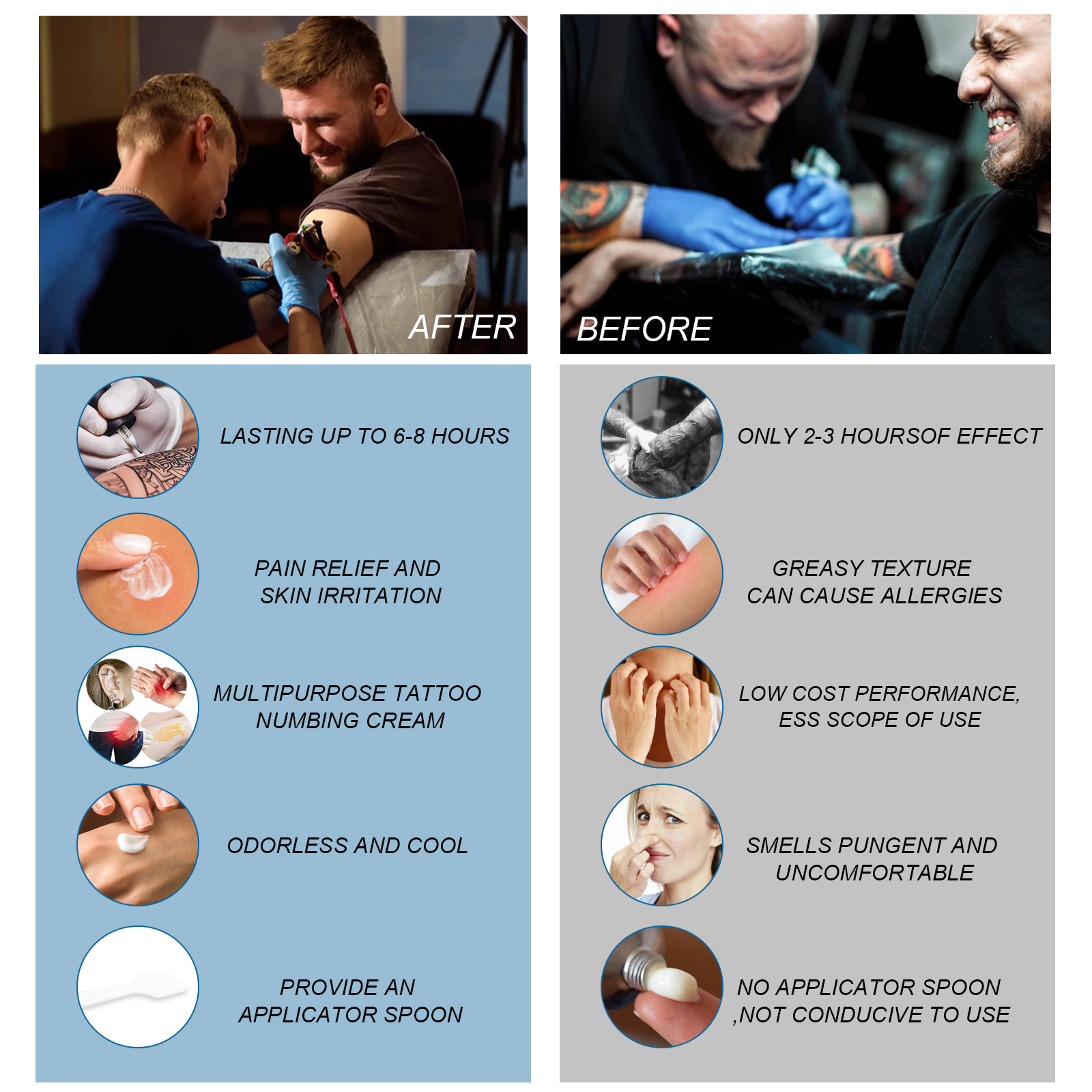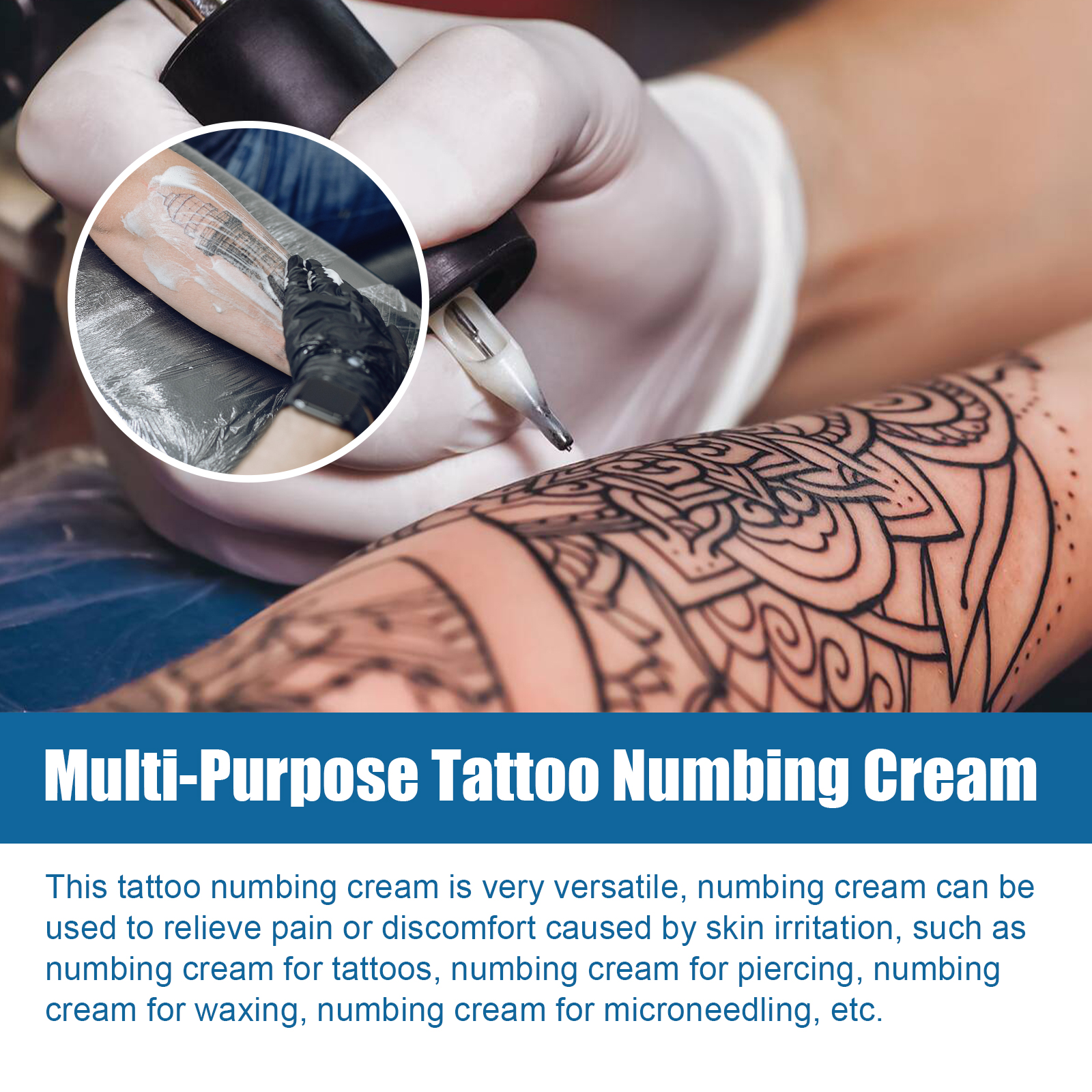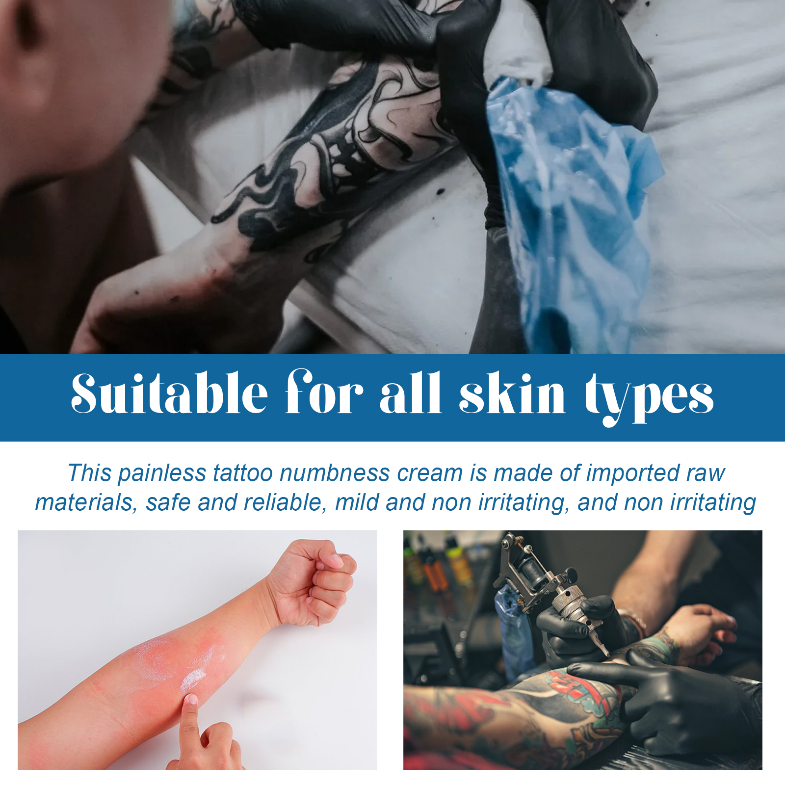 我们的纹身护理霜含有三乙醇胺、生育酚(维生素E)、透明质酸钠。它可以用来缓解皮肤刺激引起的疼痛或不适,减轻纹身的疼痛。它的使用方法很简单:取用肥皂和温水清洗特定部位,充分打开毛孔并擦干,在要纹身的地方涂上一层厚厚的本品,用保鲜膜紧包住涂敷区域,等待50-60分钟(包裹时间越长,麻木时间越长),去掉保鲜膜,擦去麻木膏,等待25分钟达到麻木的顶峰,就可以开始纹身工作了。减轻纹身疼痛,修护淡化纹身纹印。