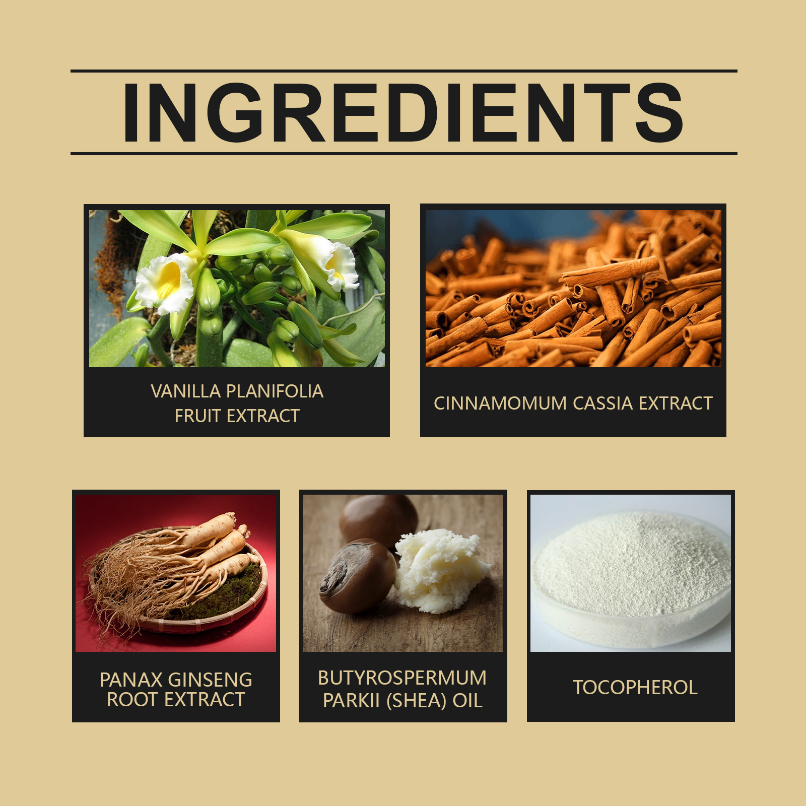 | 成分 | 香草提取物、肉桂提取物、人参根提取物 |