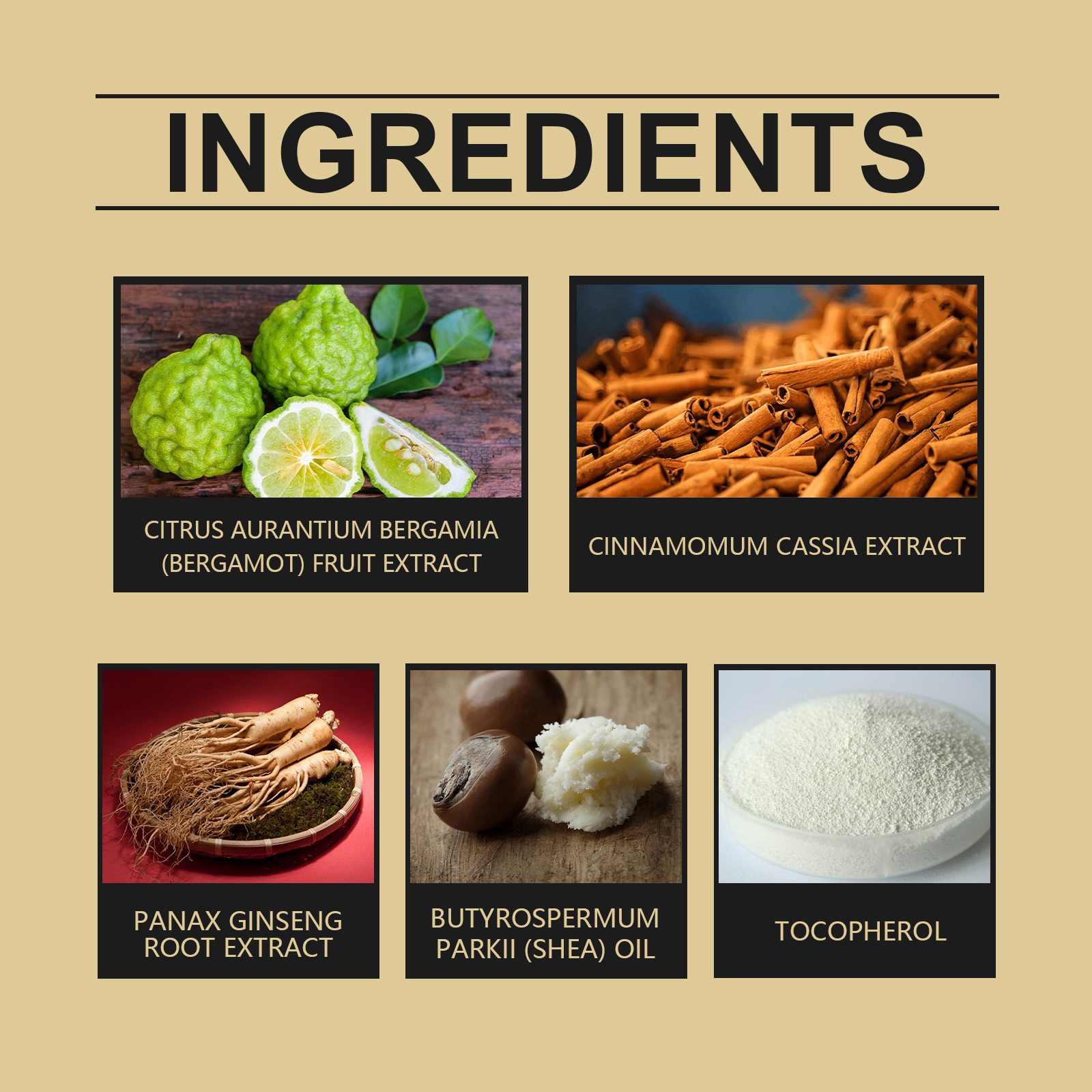 | 成分 | 佛手柑提取物、肉桂提取物、人参根提取物 |