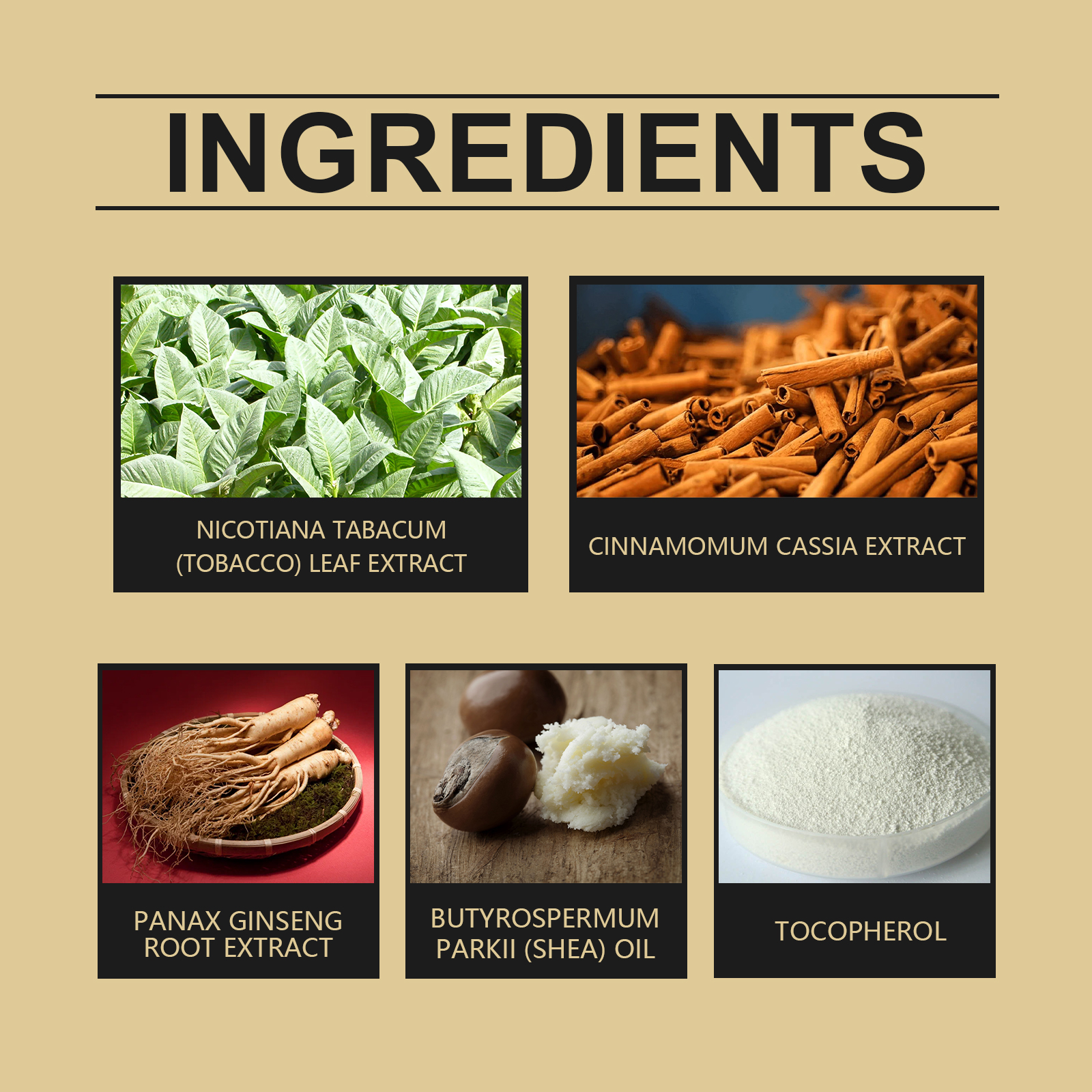 | 成分 | 烟草提取物、肉桂提取物、人参根提取物 |