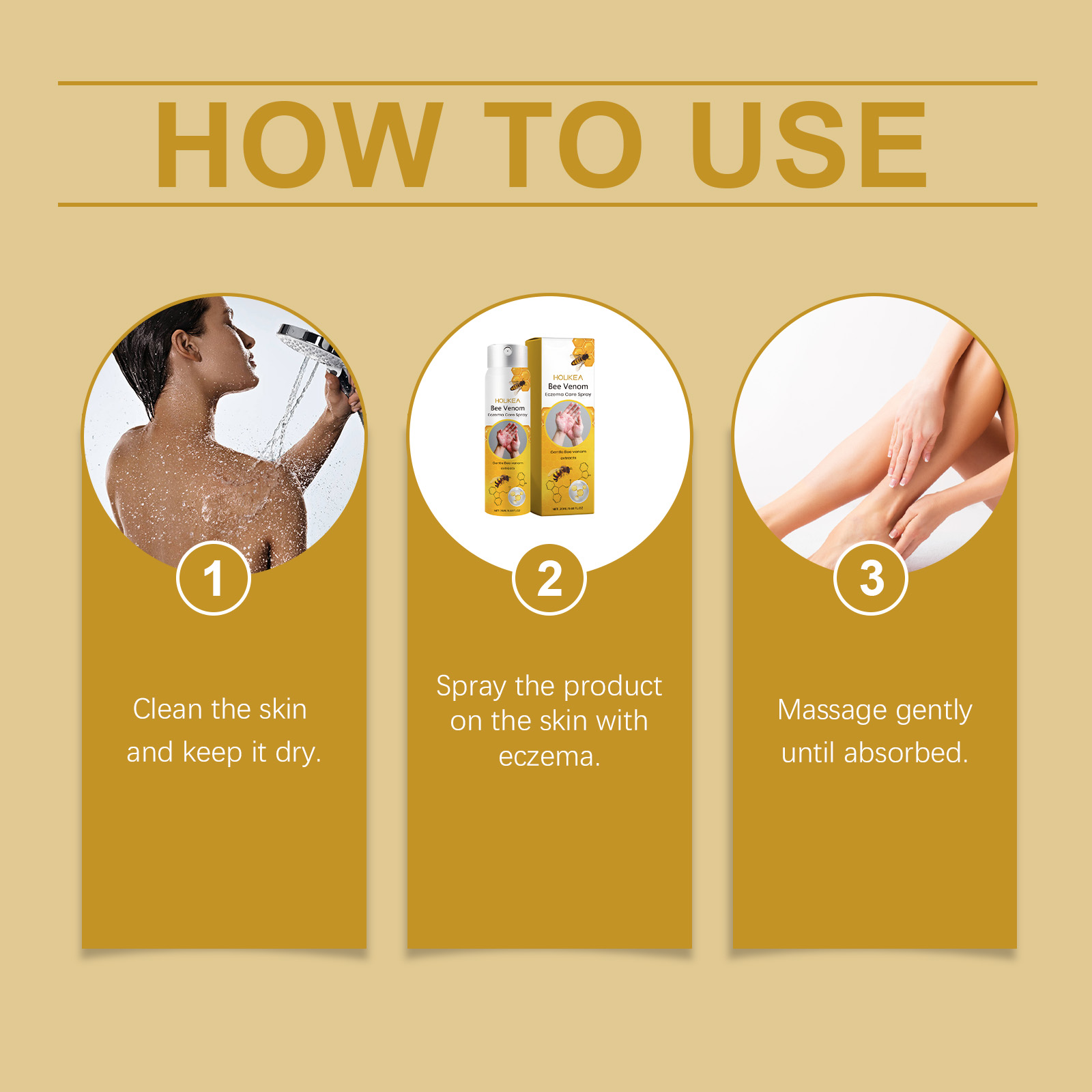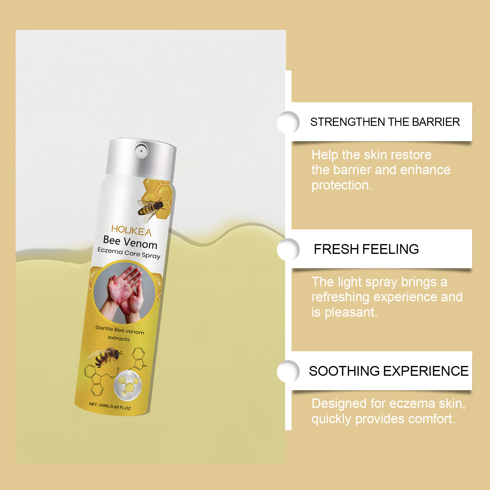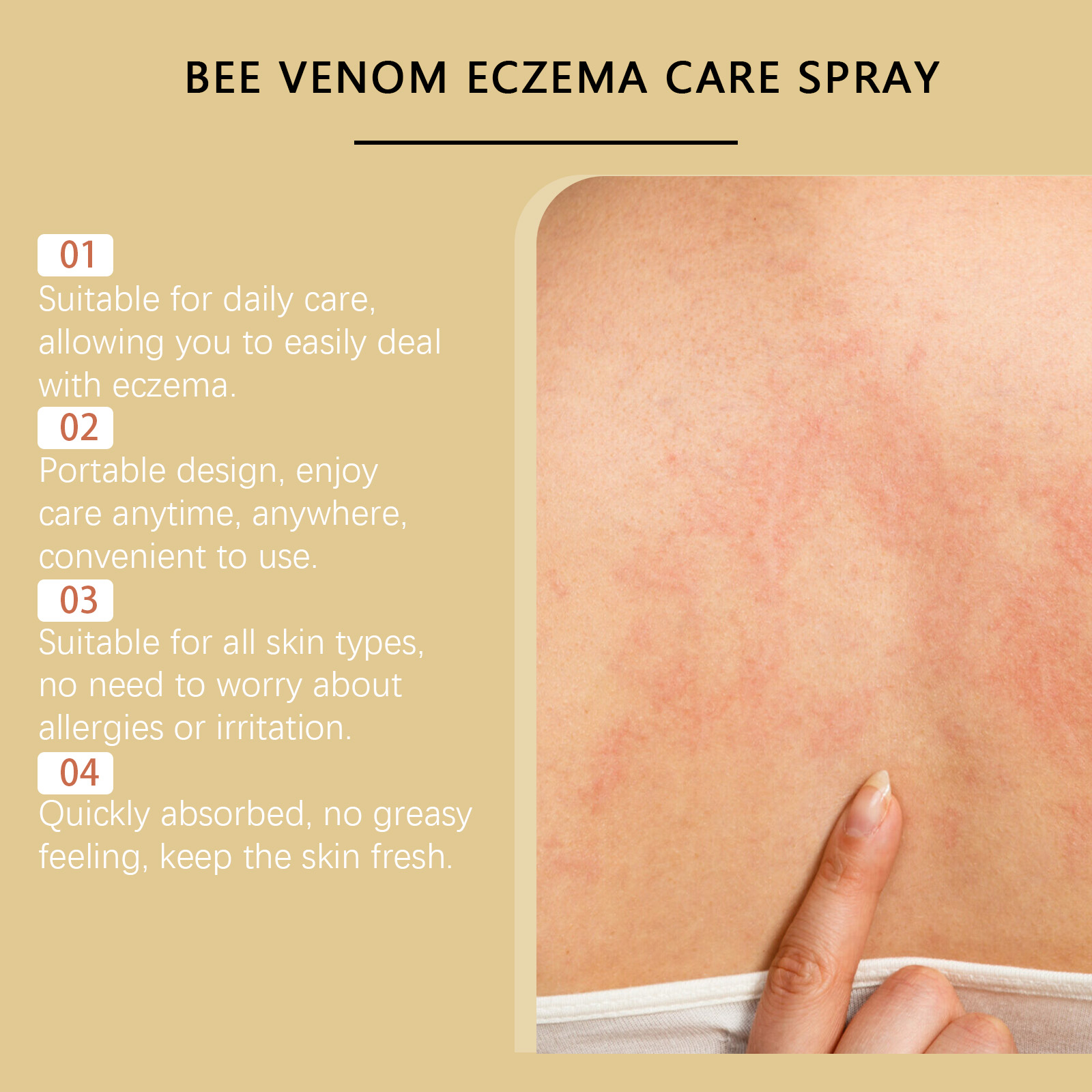 我们的蜂毒皮肤护理喷雾含有蜂毒、薄荷提取物、甘油。它可以为湿疹肌肤快速提供舒适感,可以有效减少肌肤反应,帮助肌肤保持平衡。它的使用方法很简单:清洁皮肤,保持皮肤干燥。将本品喷于有湿疹的皮肤上。轻轻按摩至吸收。并且可以它快速减少红肿和不适,帮助您恢复皮肤的平静和舒适。