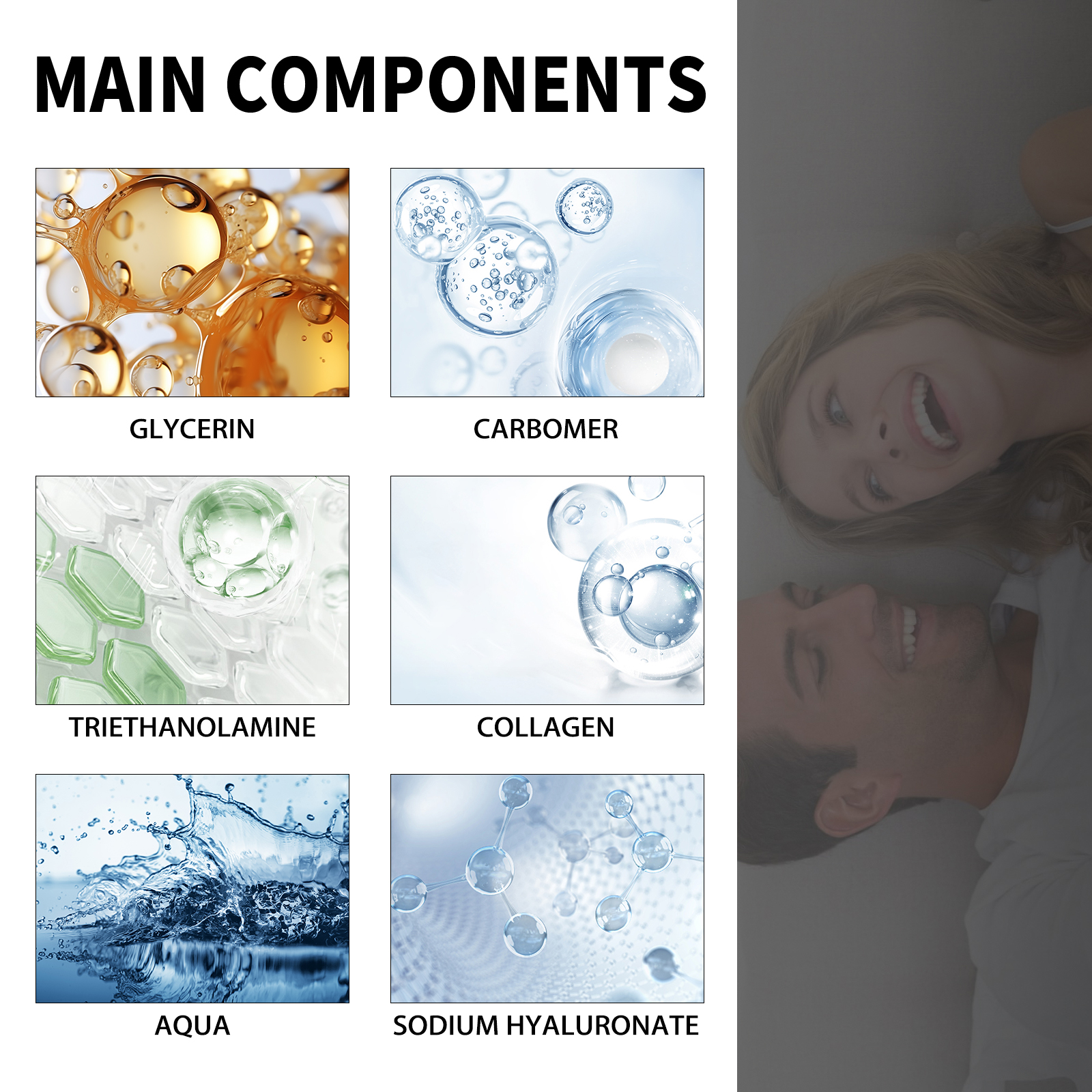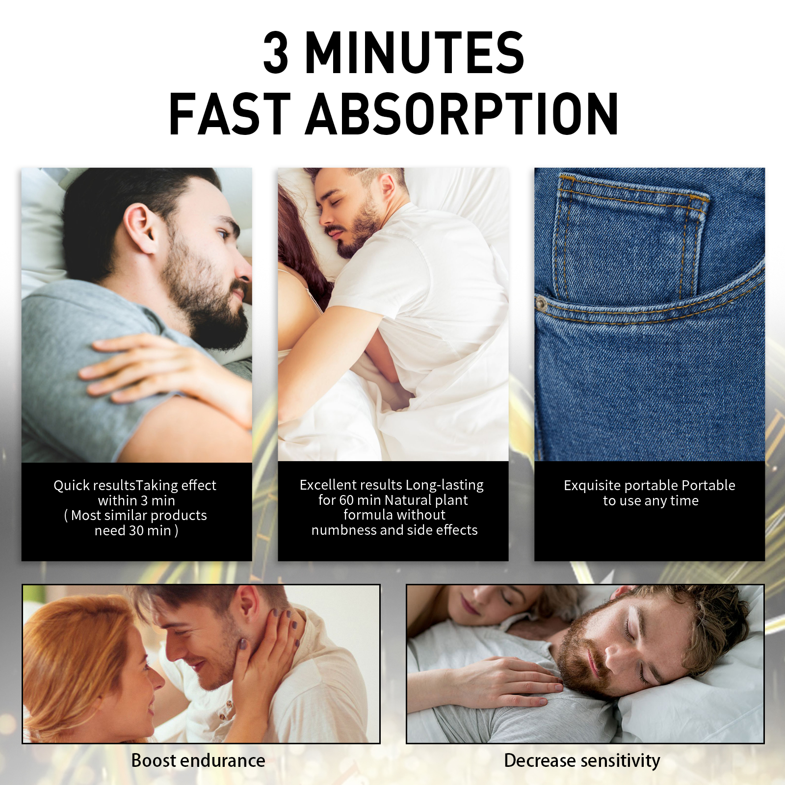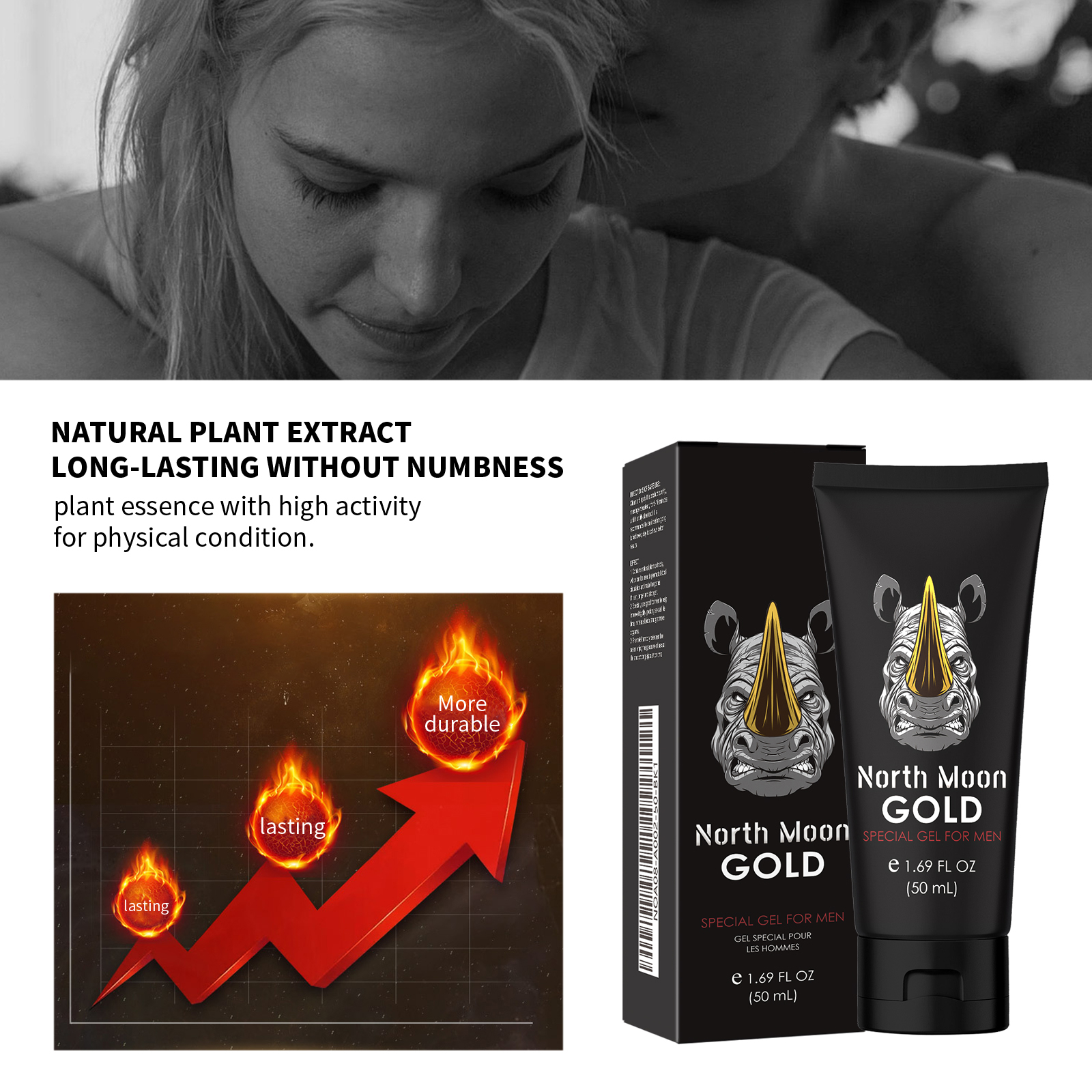 我们的男士保湿凝胶含有三乙醇胺、胶原、透明质酸钠。它见效快,3分钟内见效(大多数同类产品需要30分钟)效果卓越,长效60分钟,天然植物配方,无麻木感,无副作用。它的使用方法很简单:清洁均匀涂抹本品,反复按摩5-10分钟,直至完全吸收,建议每天睡前使用,效果更佳。并且可以便携式随时随地使用。