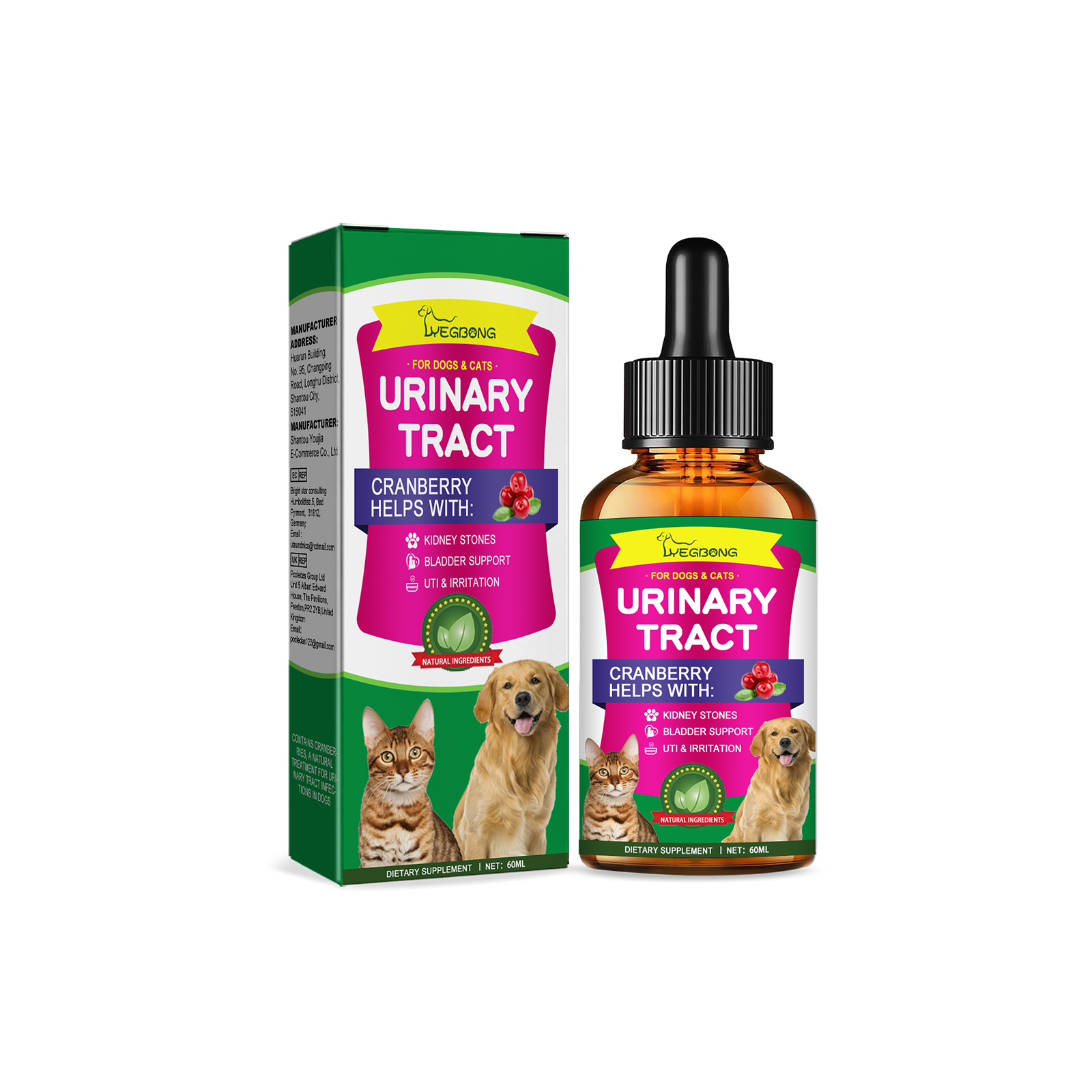 我们的宠物护理滴剂含有蔓越莓提取物、紫锥菊提取物、蒲公英根提取物。它可以有效地支持宠物的膀胱和尿道健康,有助于消除宠物膀胱结石,预防肾衰竭,促进整体健康。它的使用方法很简单:根据宠物的年龄和体重调整剂量。在食物或水中加入适量滴剂,或直接滴入宠物口中。建议每天使用1-2次,效果更佳。使用后可以用于治疗和预防宠物尿路感染、肾衰竭和膀胱结石,无副作用或损害健康器官。