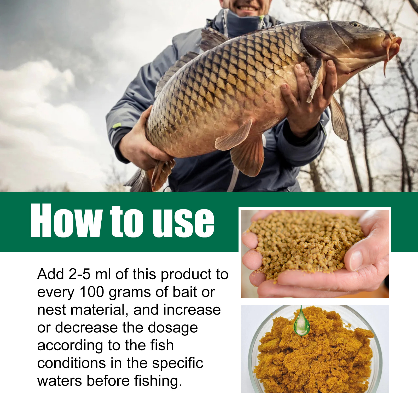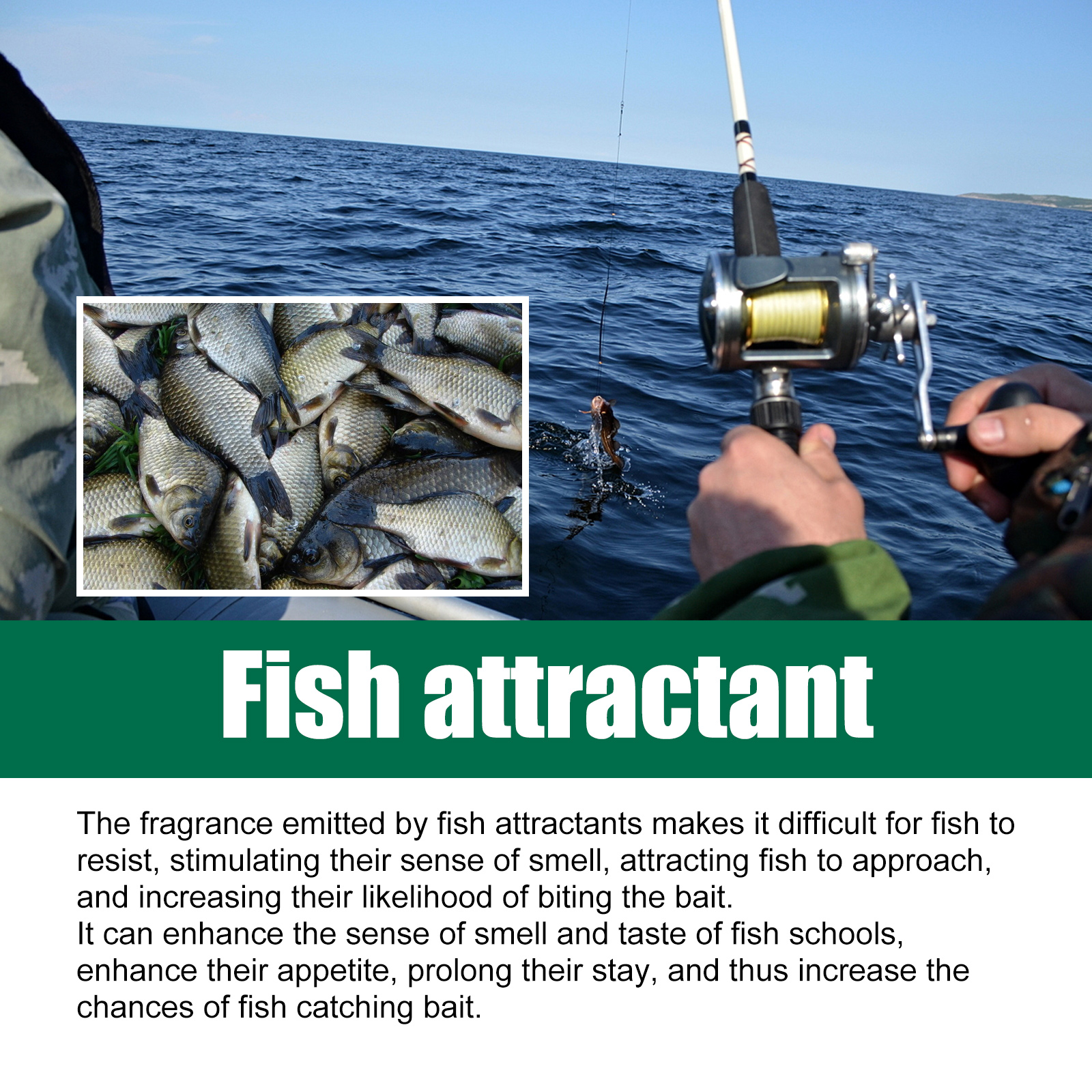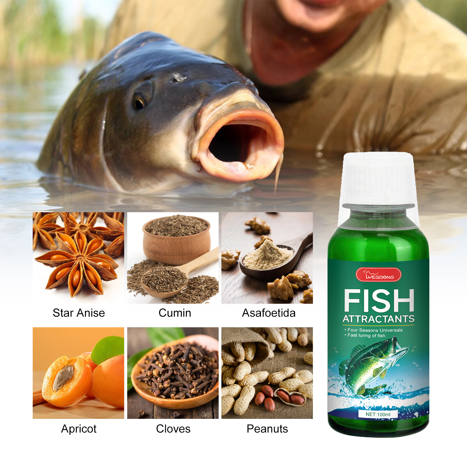 我们的鱼诱剂含有南杏、丁香、花生米。它可以散发出使鱼难以抗拒香味,刺激它们的嗅觉,吸引鱼靠近,增加它们咬饵的可能性。它的使用方法很简单:在每100克饵料或窝料中加入本品2-5毫升,捕捞前可根据具体水域的鱼况增减用量。使用后可以增强鱼群的嗅觉和味觉,增强它们的食欲,延长它们的停留时间,从而增加鱼类捕捉诱饵的机会。