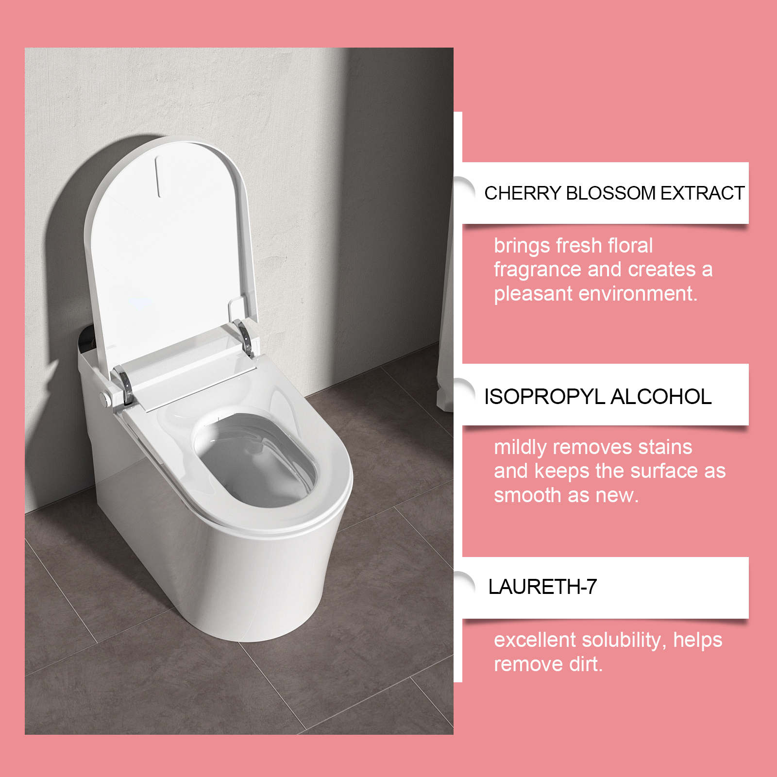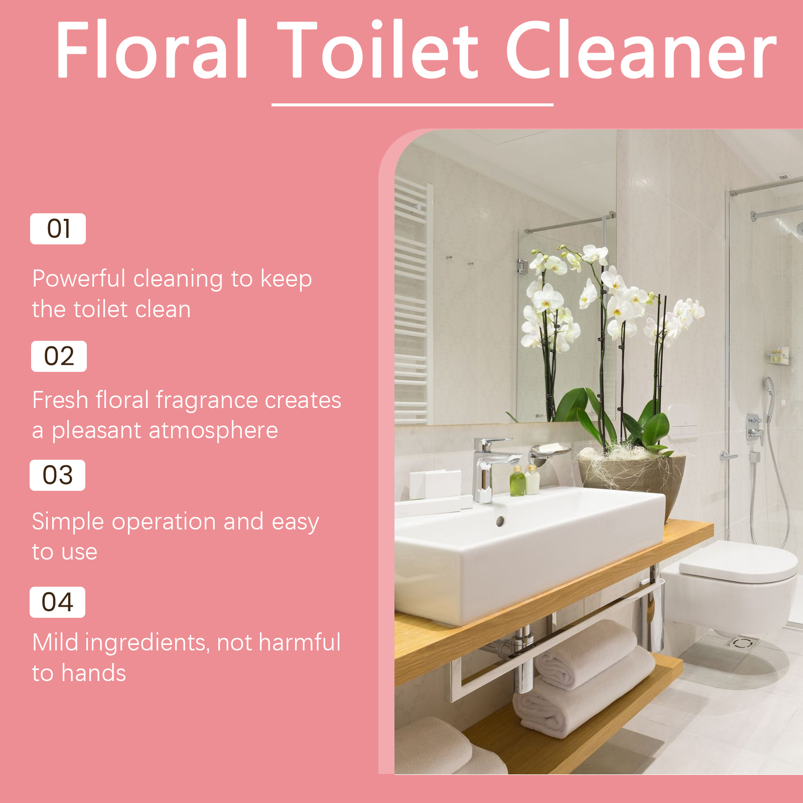 我们的花香洁厕液含有异丙醇、丙二醇丁醚。它清新的花香让清洁过程更加愉悦。有效处理污垢,保持厕所干净如新。它的使用方法很简单:将本品喷于污渍表面。等5分钟,等待深度分解。用马桶刷洗干净后,用清水冲洗干净。并且本品具有持久的花香,清洗后能给洗手间留下持久的清新花香,增强洗手间气氛。