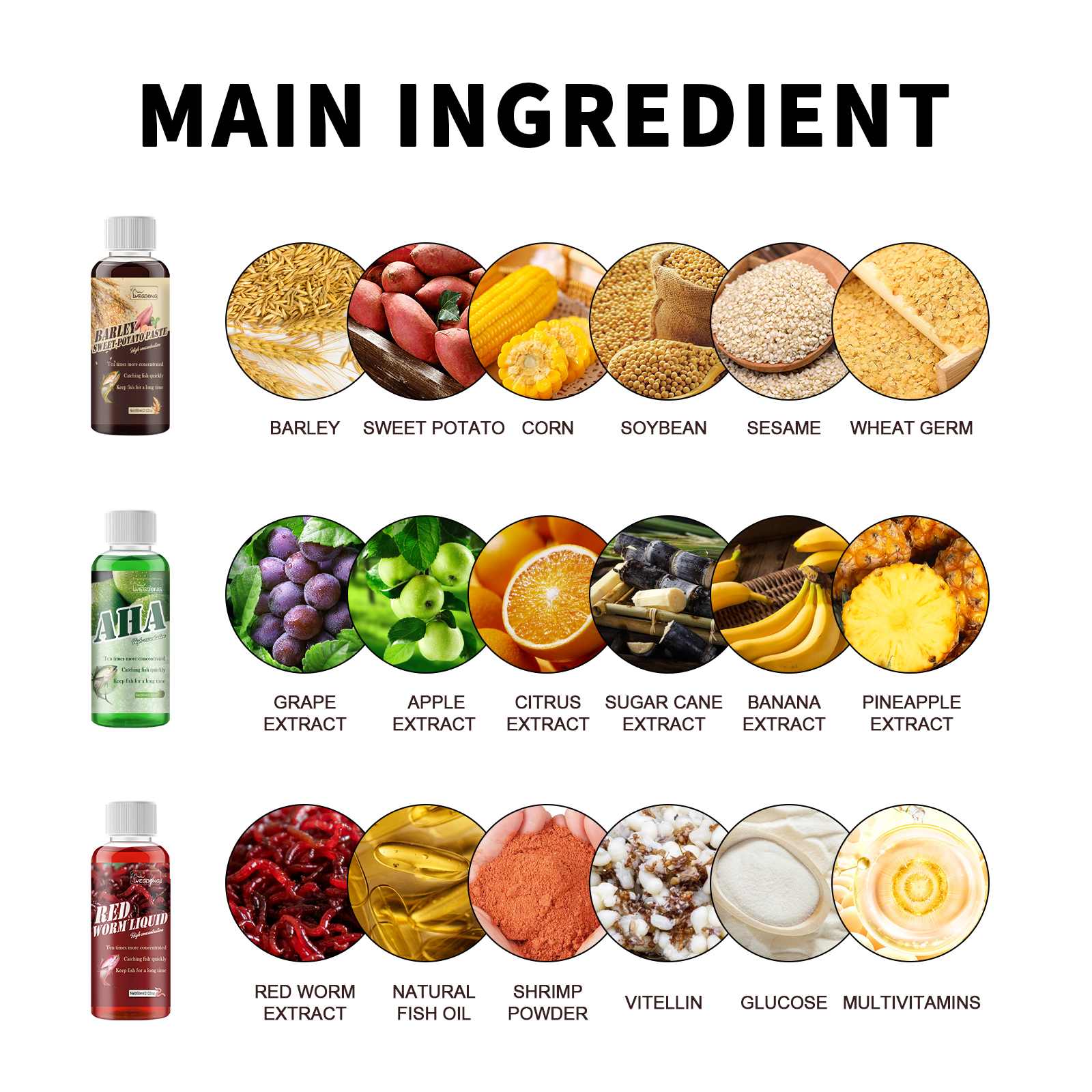我们的鱼诱剂含有葡萄提取物、红虫提取物、小麦胚芽。它可以散发出使鱼无法抗拒香味,增加了鱼的食欲,吸引鱼靠近,增加了鱼咬鱼的可能性。它的使用方法很简单:每100克鱼饵或巢中加入2-5毫升本品料,并根据情况增减用量捕捞前根据具体水域的鱼况。使用后鱼群会快速被吸引过来,大大增加你获得鱼的数量,让你收获满满。