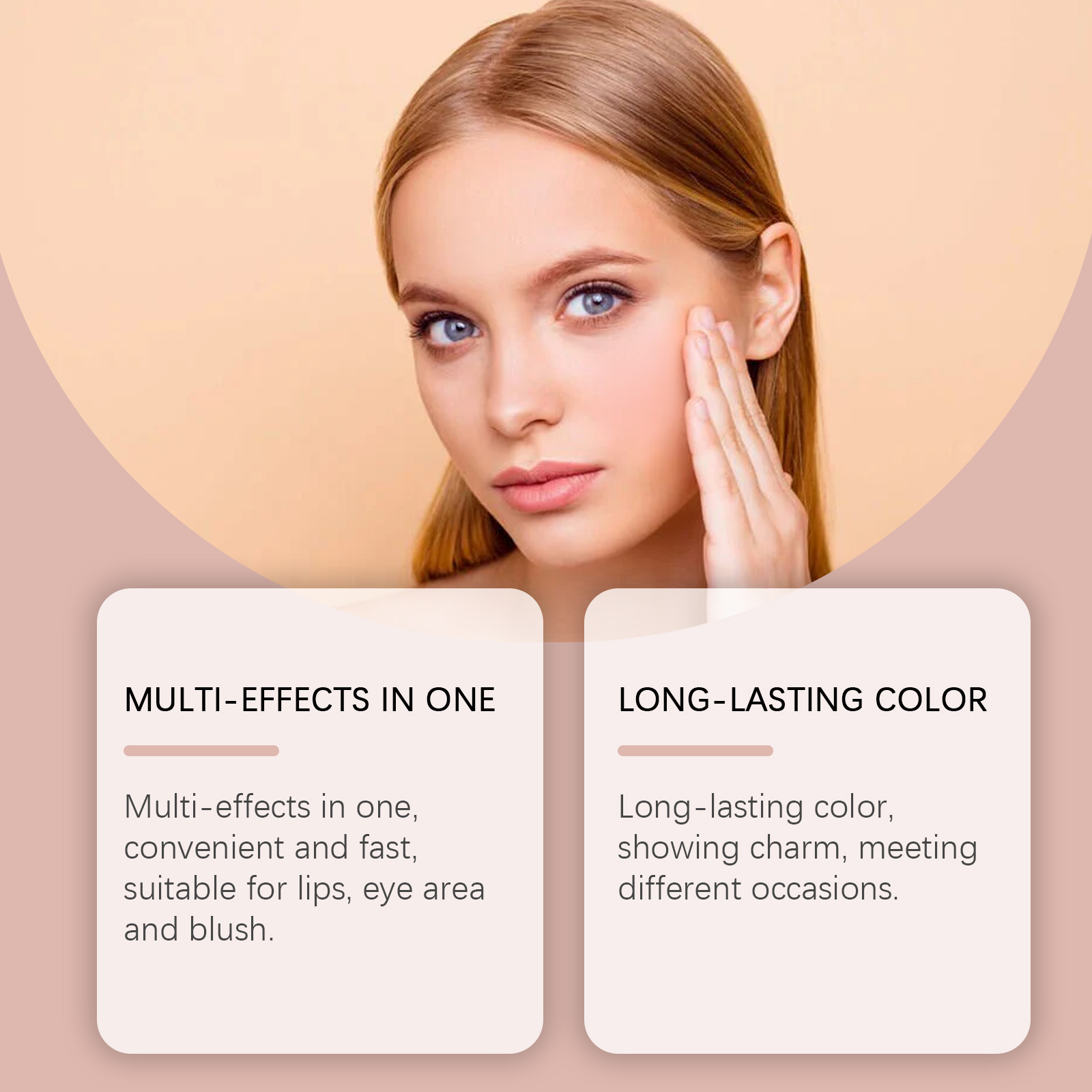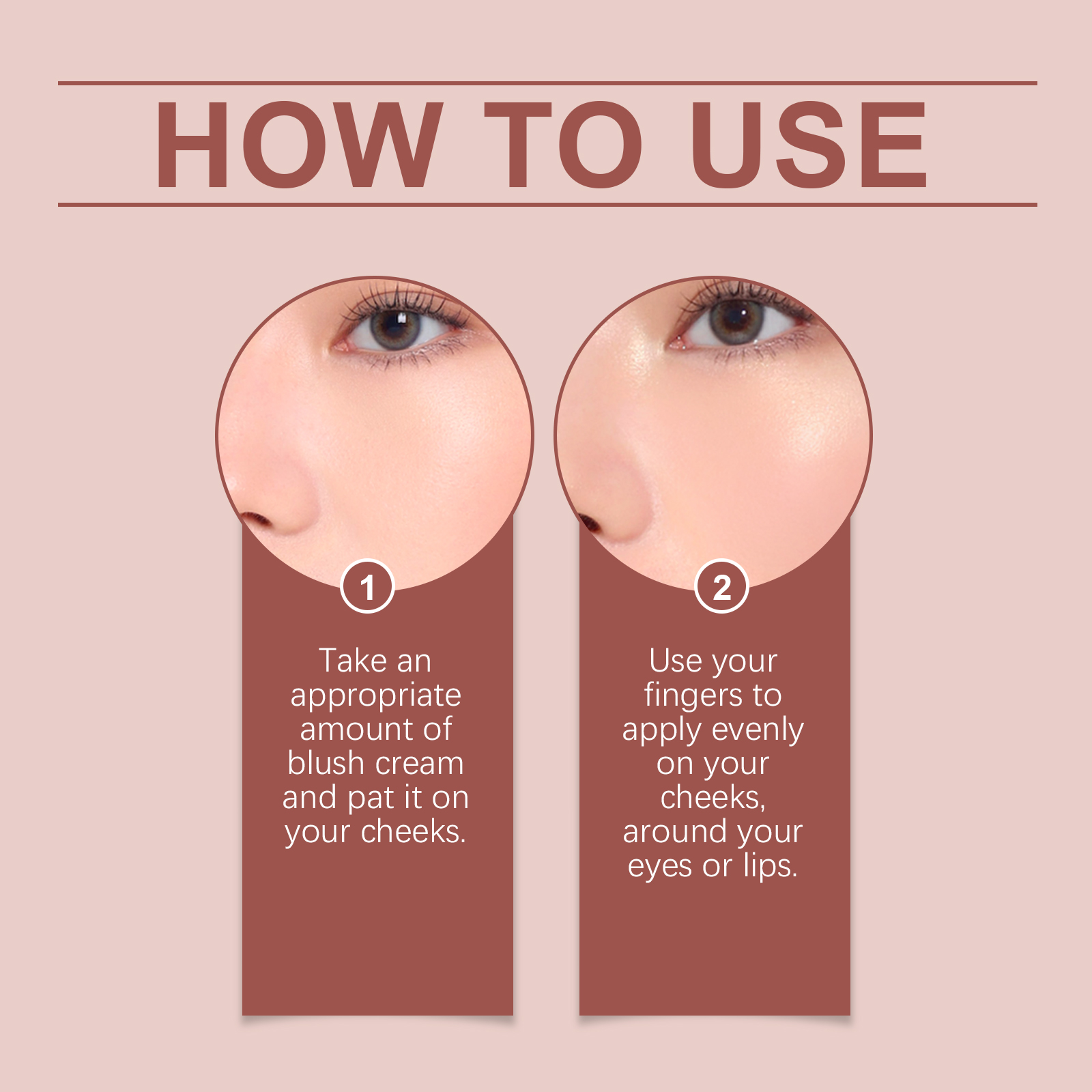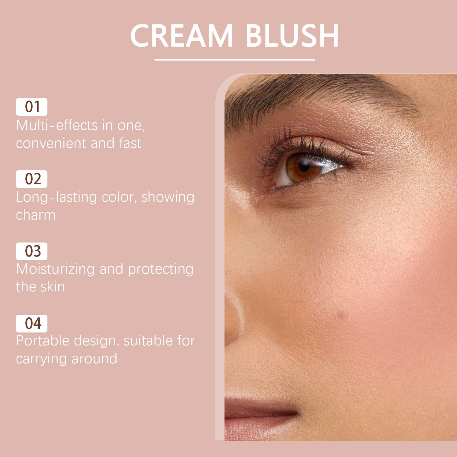 我们的腮红霜含有胶原、生育酚(维生素E)。它可以保湿,呵护肌肤,提高肌肤柔软度。它的使用方法很简单:取适量腮红膏,轻拍在脸颊上。用手指均匀涂抹在脸颊、眼睛或嘴唇周围。并且可以适用于唇部、眼部及腮红。