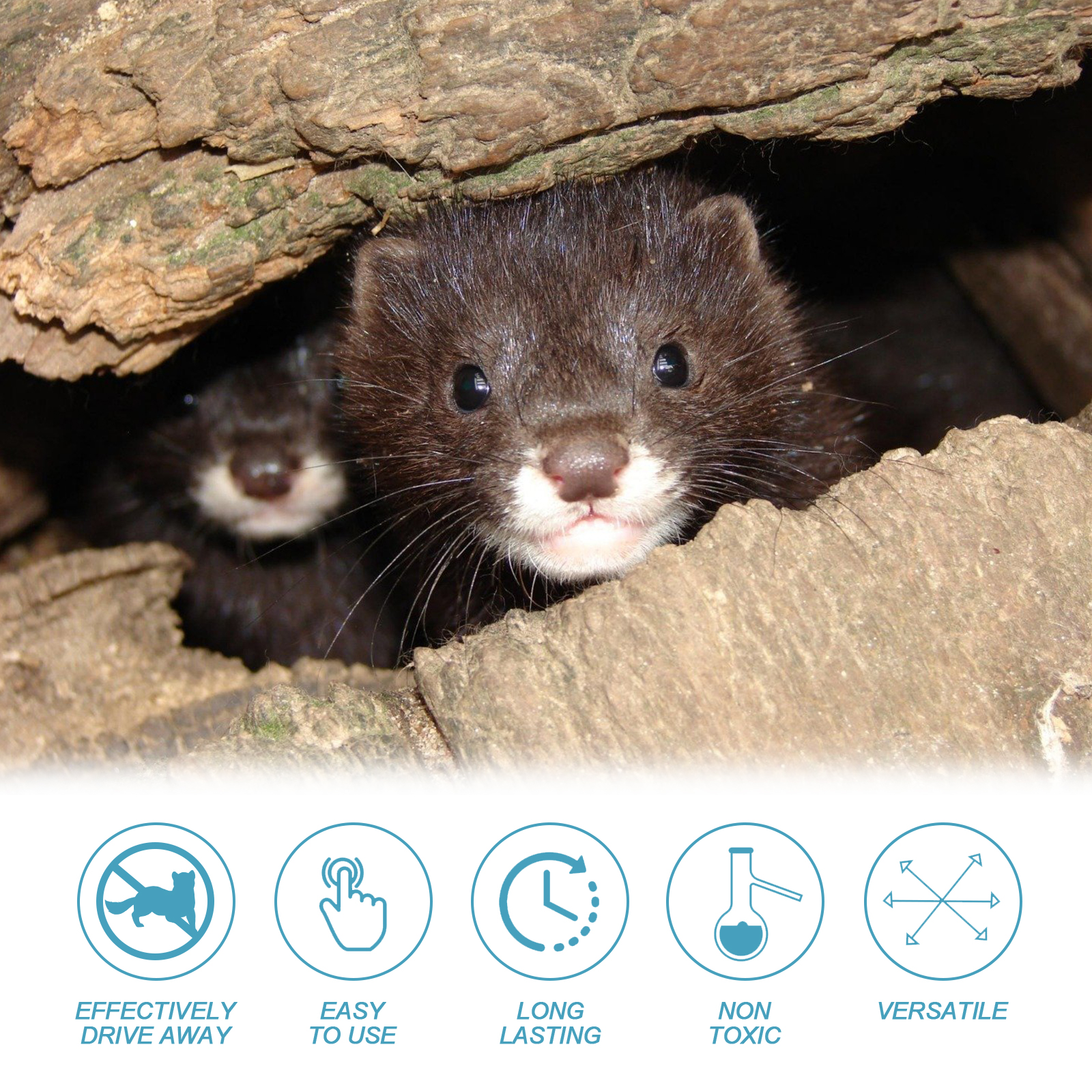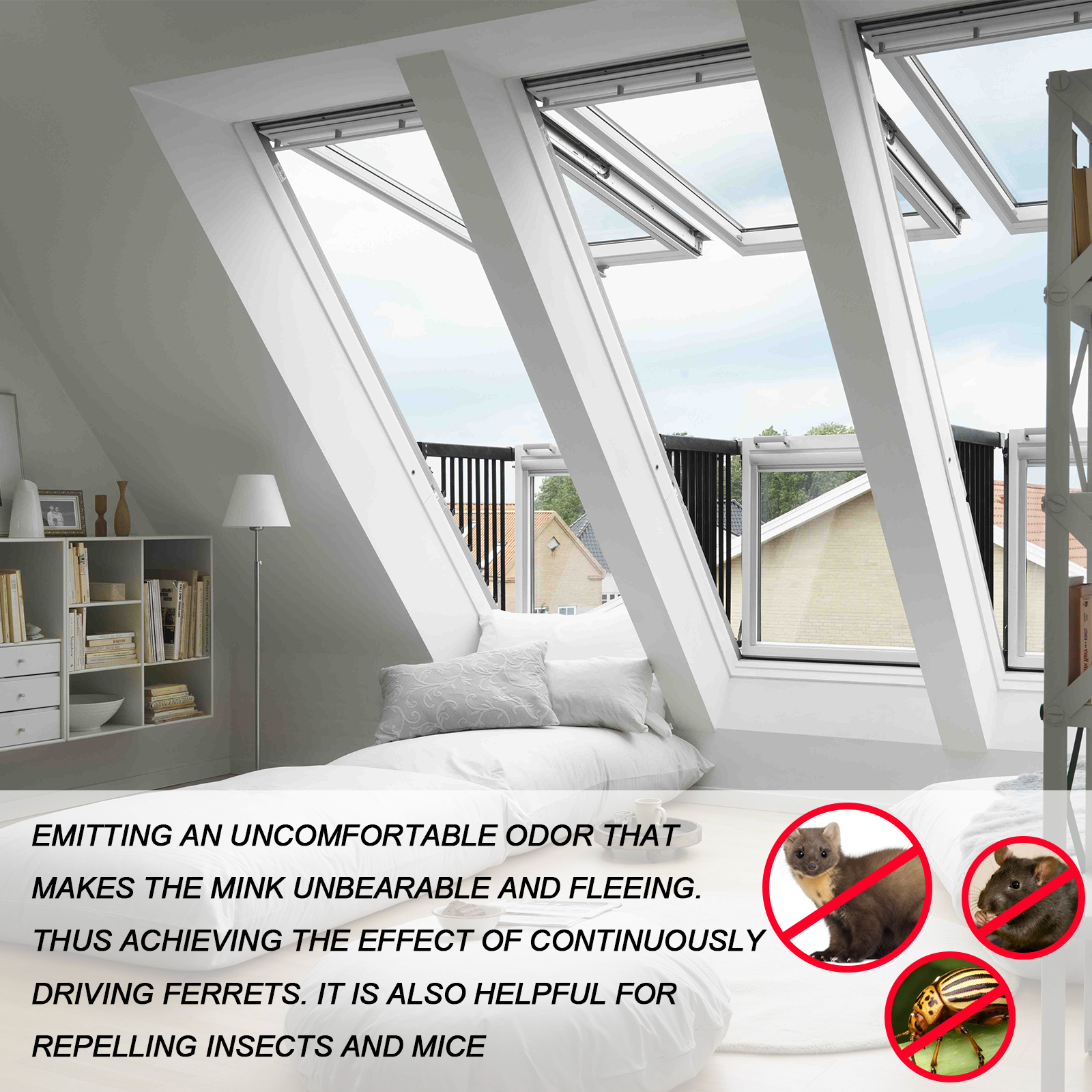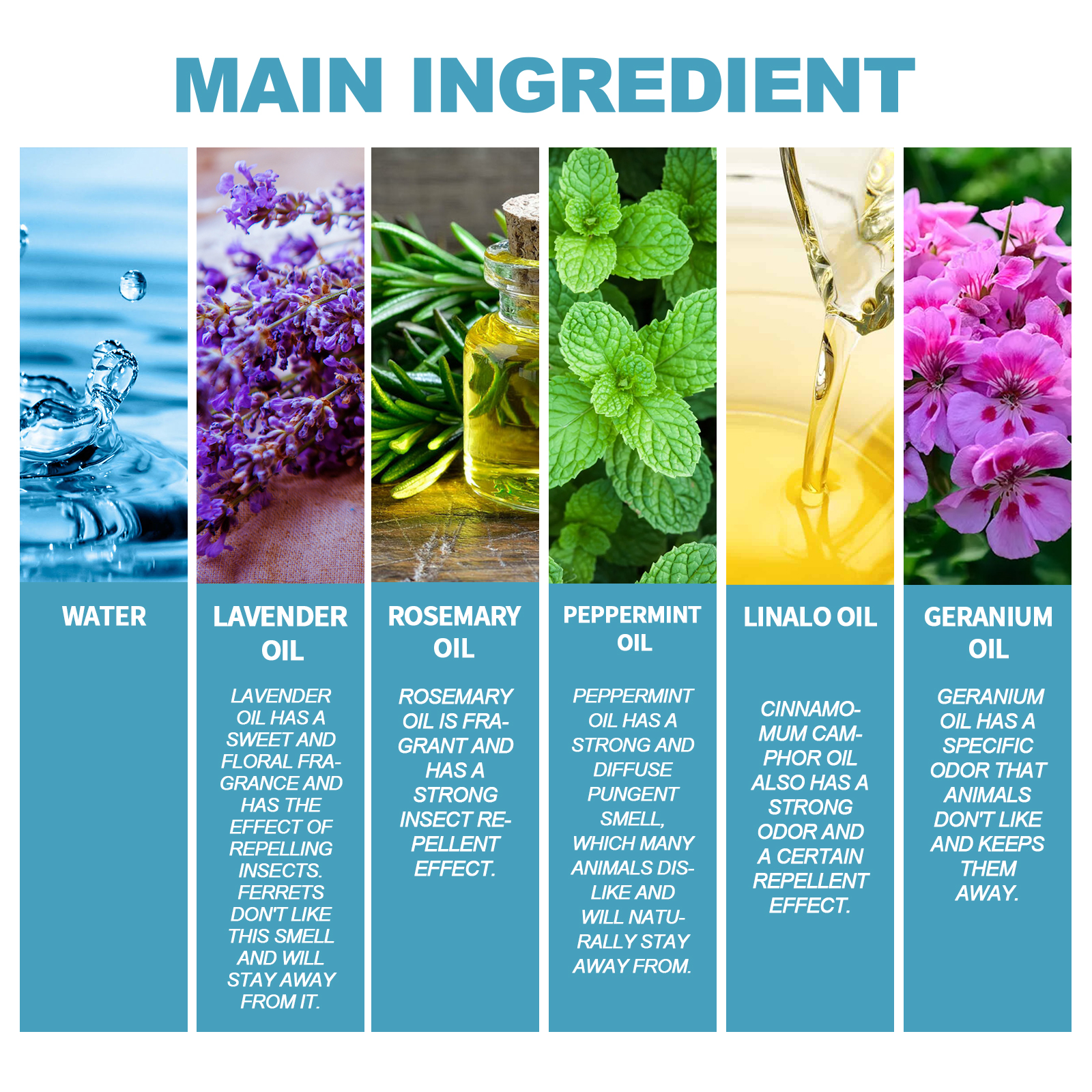 我们的驱貂喷雾含有薰衣草油、迷迭香油、薄荷油。它可以在各种情况下击退水貂。包括天花板顶部、汽车发动机、仓库角落等严密的地方。同时,还有助于驱虫、驱鼠。它的使用方法很简单:首先在房屋周围或容易出现害虫的地方喷洒1-2次,可以温和友好地击退任何可能接近的动物。使用后可以驱逐水貂,使水貂感到不舒服,使其难以忍受而逃跑,加深水貂的厌恶记忆,从而达到持续的效果排斥水貂。