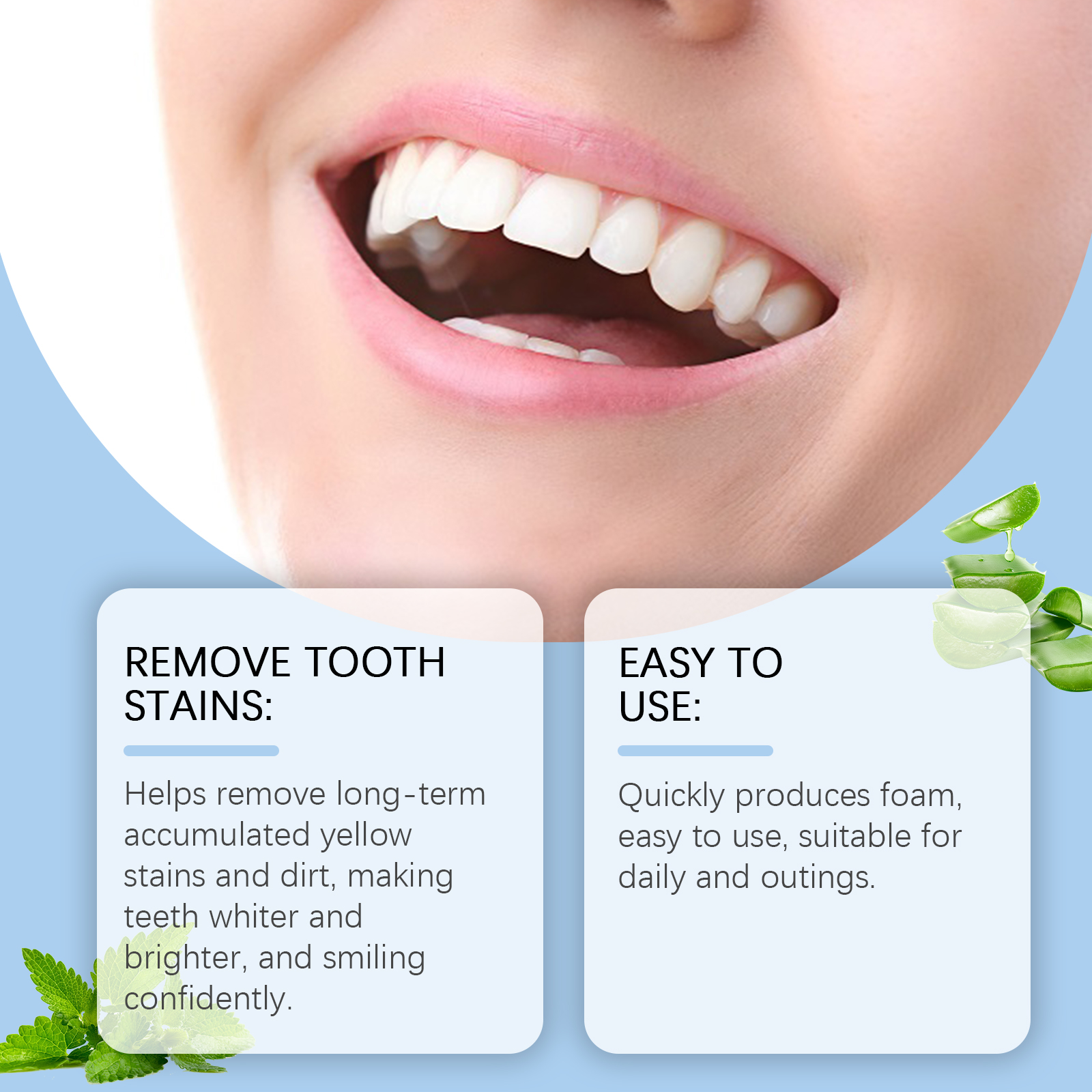 我们的薄荷清新牙膏片含有薄荷叶提取物、芦荟叶提取物、木糖醇。它可以去除长期积累的黄色污渍和污垢,使牙齿更白更亮,自信地微笑。它的使用方法很简单:拿出一片产品,放进嘴里。用水浸湿后咀嚼至完全溶解。像往常一样刷牙,最后漱口。并且可以快速产生泡沫,使用方便,适合日常和郊游。