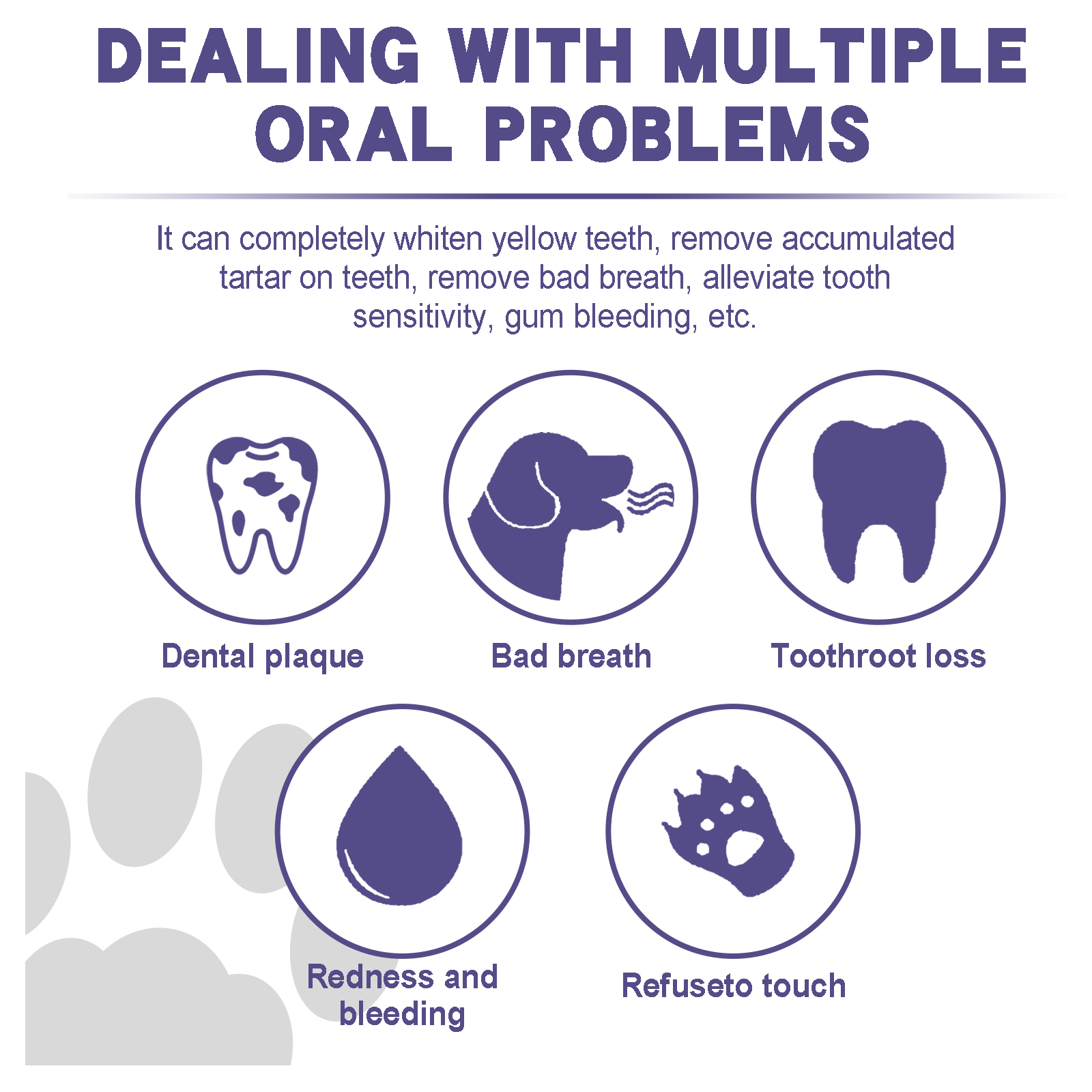 我们的宠物口腔修护凝胶含有小苏打、柠檬提取物、薄荷提取物。它可以去除宠物的口臭,保持口腔和牙齿健康,适合不爱刷牙的宠物,使用携带非常方便。它的使用方法很简单:首先轻轻打开宠物的上下颚,取适量凝胶,均匀涂抹在宠物嘴上,使用后一小时内不要让宠物吃或喝,日常使用可以得到更好的效果。使用后可以彻底美白宠物黄牙,清除宠物牙齿上堆积的牙垢,去除口臭,缓解牙齿敏感、牙龈出血等。