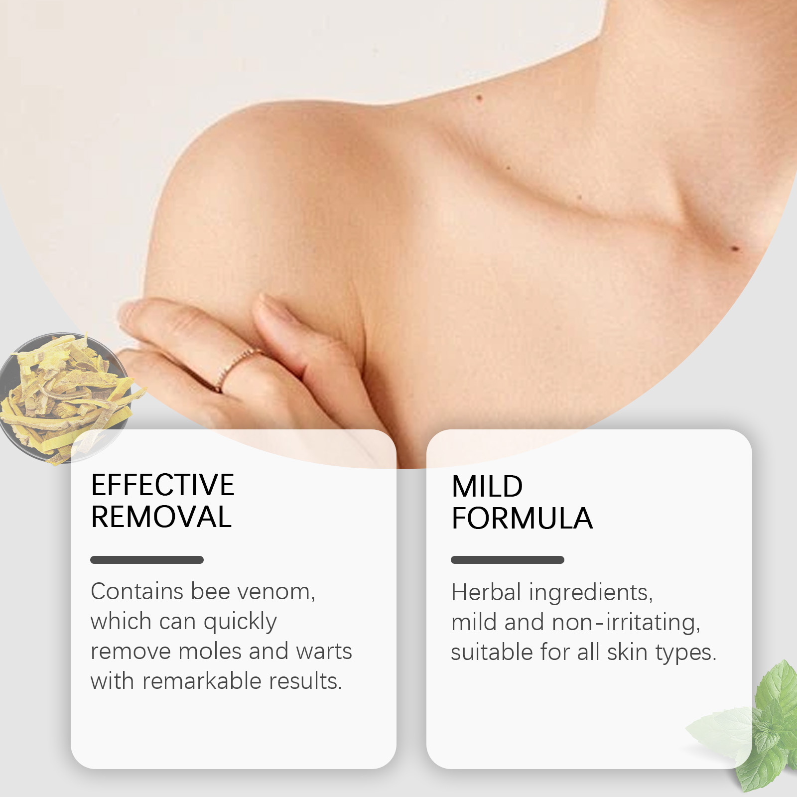 我们的蜂毒皮肤修护精华液含有黄柏提取物、茶树油。它可以快速去除痣和疣,效果显著。它的使用方法很简单:彻底清洁皮肤并先擦干。将适量本品涂抹于有痣、疣、皮赘等的皮肤上。轻轻按摩至完全吸收。并且采用草本成分,温和无刺激,适合所有肤质。