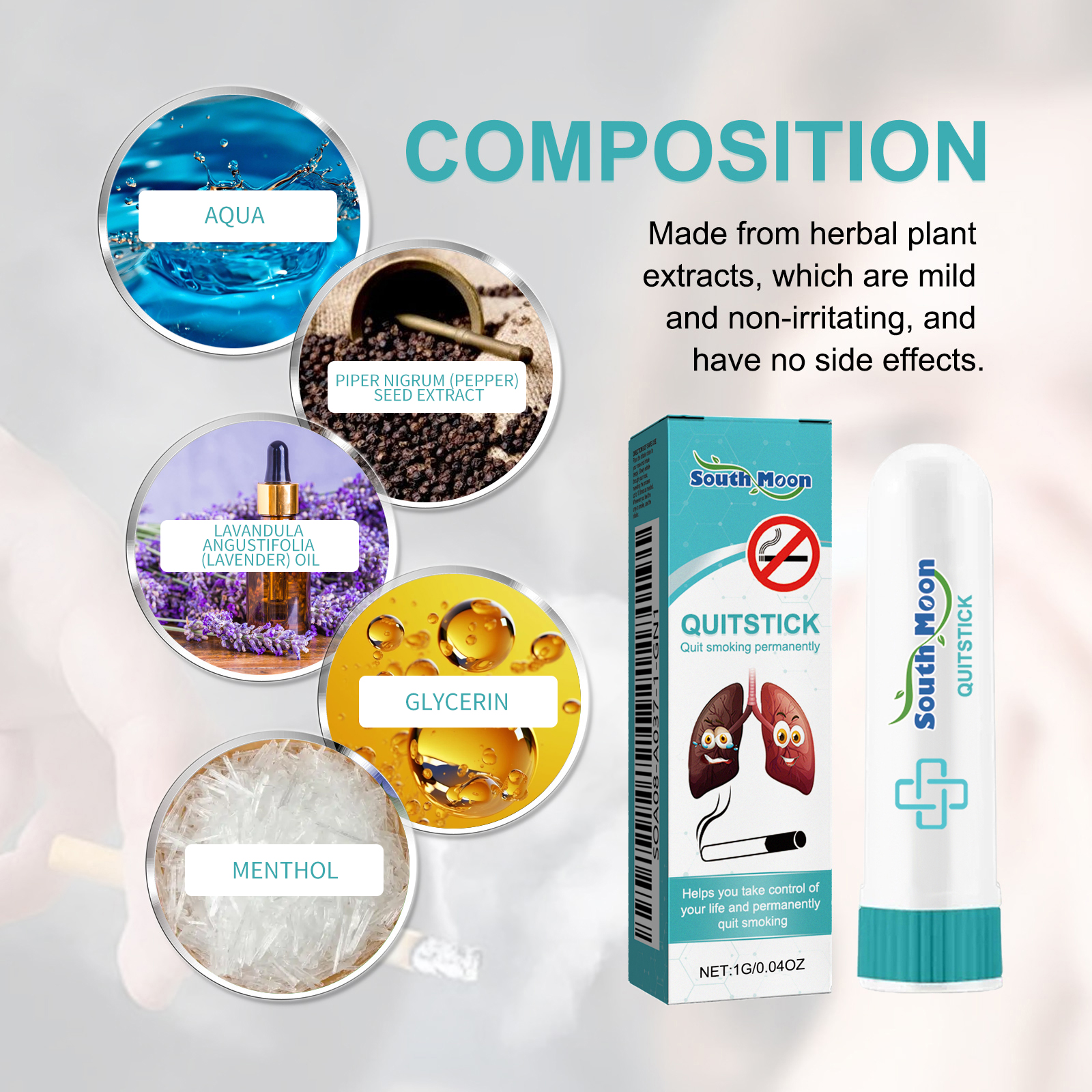 我们的通鼻棒含有黑胡椒精油、薰衣草精油、半边莲提取物。它可以改变尼古丁的消耗方式,无畏戒断反应,摆脱顽固的成瘾控制,逐步减少尼古丁摄入量,戒除生理烟瘾,协助戒除心理依赖,实现全面戒烟。它的使用方法很简单:将本产品靠近鼻子并深吸气,通过鼻子缓慢地呼气,根据需要重复该过程多达10次,每当你有吸烟的冲动时,请使用本产品。帮助你控制自己的生活,永久戒烟。