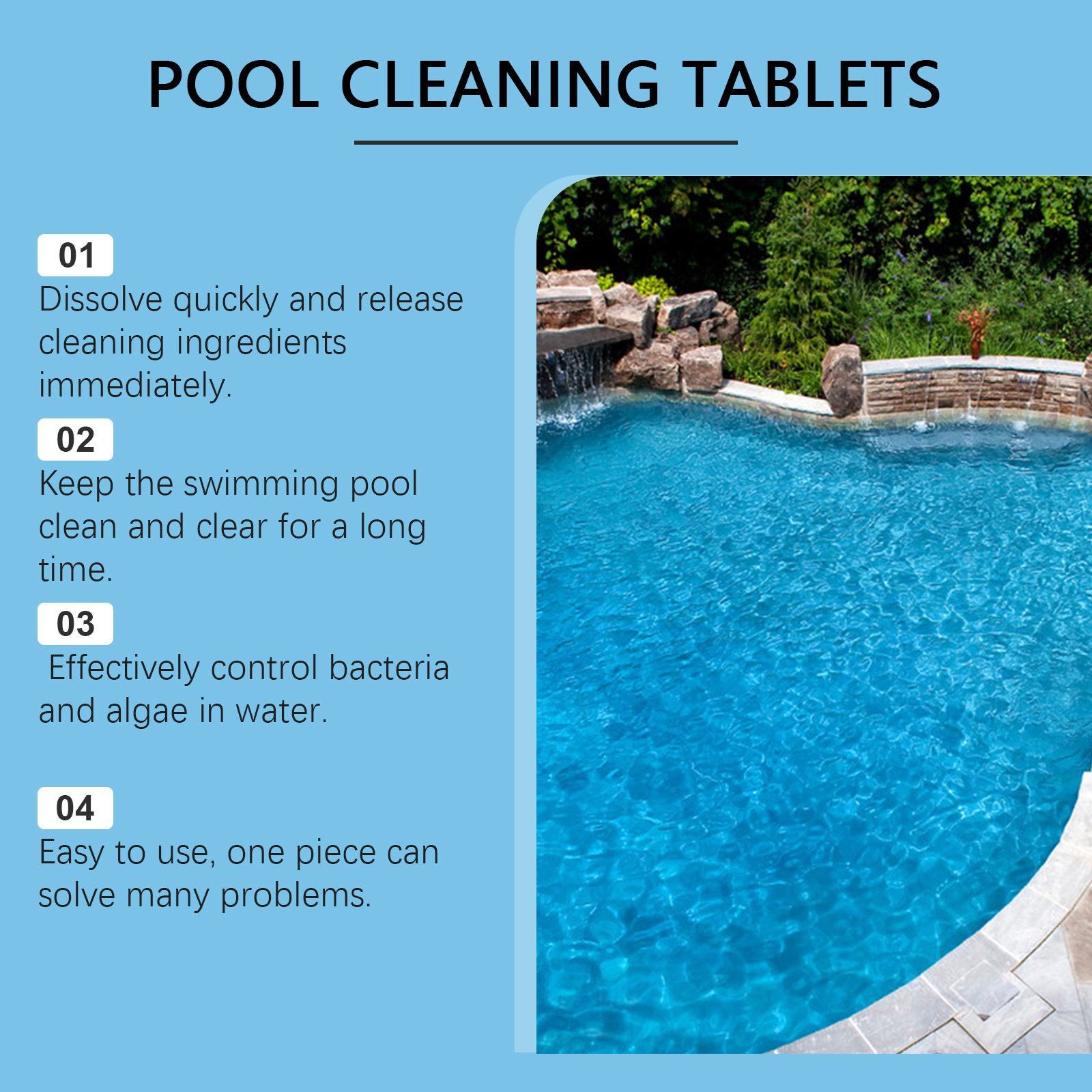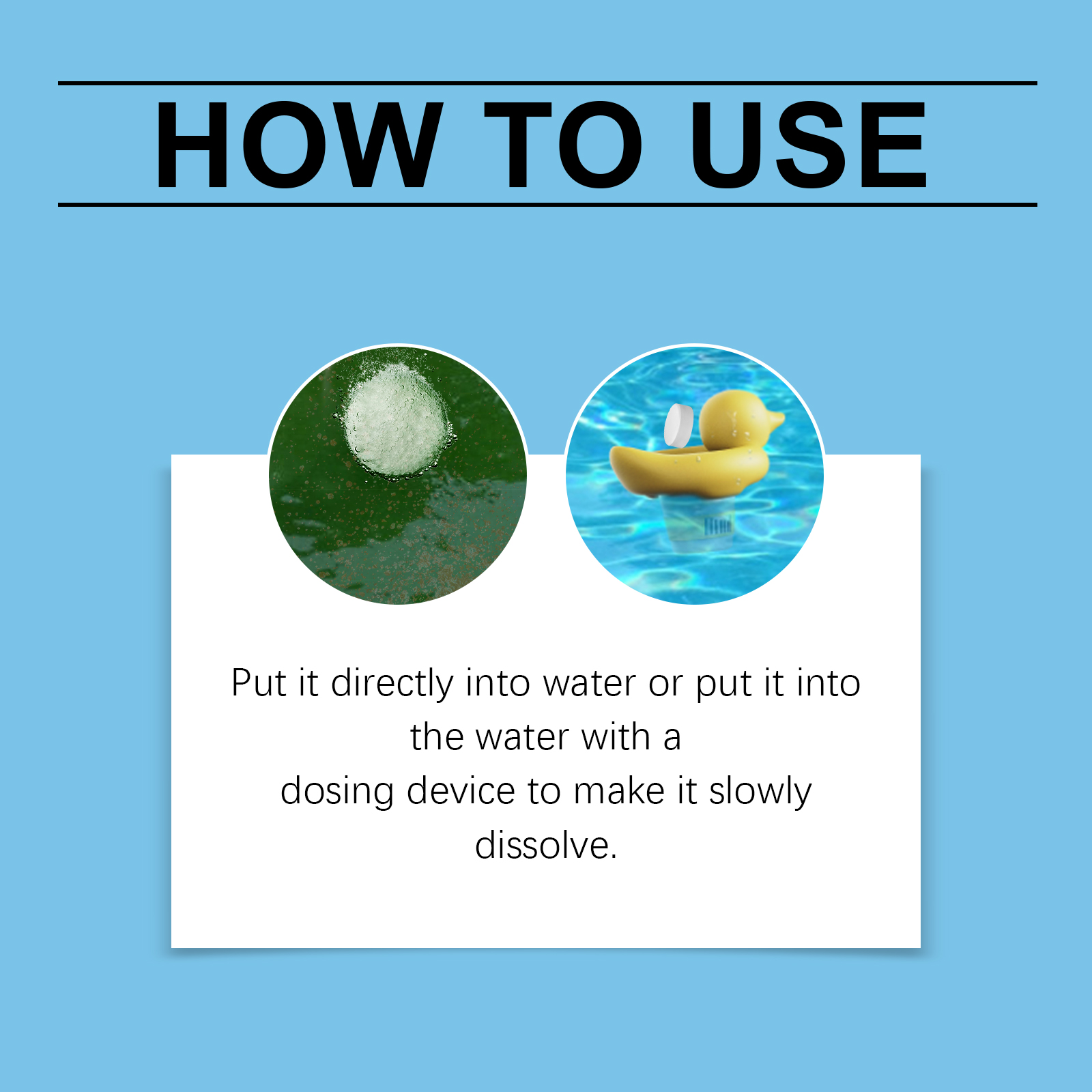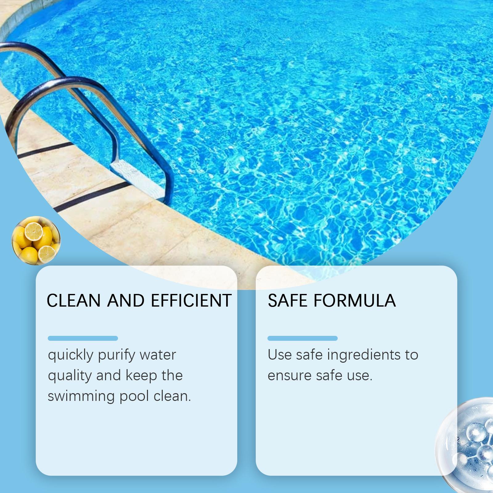 我们的泳池清洁泡腾片含有十二烷基苯磺酸钠、EDTA 二钠。它可以保持泳池水的清洁和新鲜,更愉快的游泳空间。它的使用方法很简单:直接放入水中或用加药装置放入水中,使其慢慢溶解。并且可以澄清水质,使用方便。