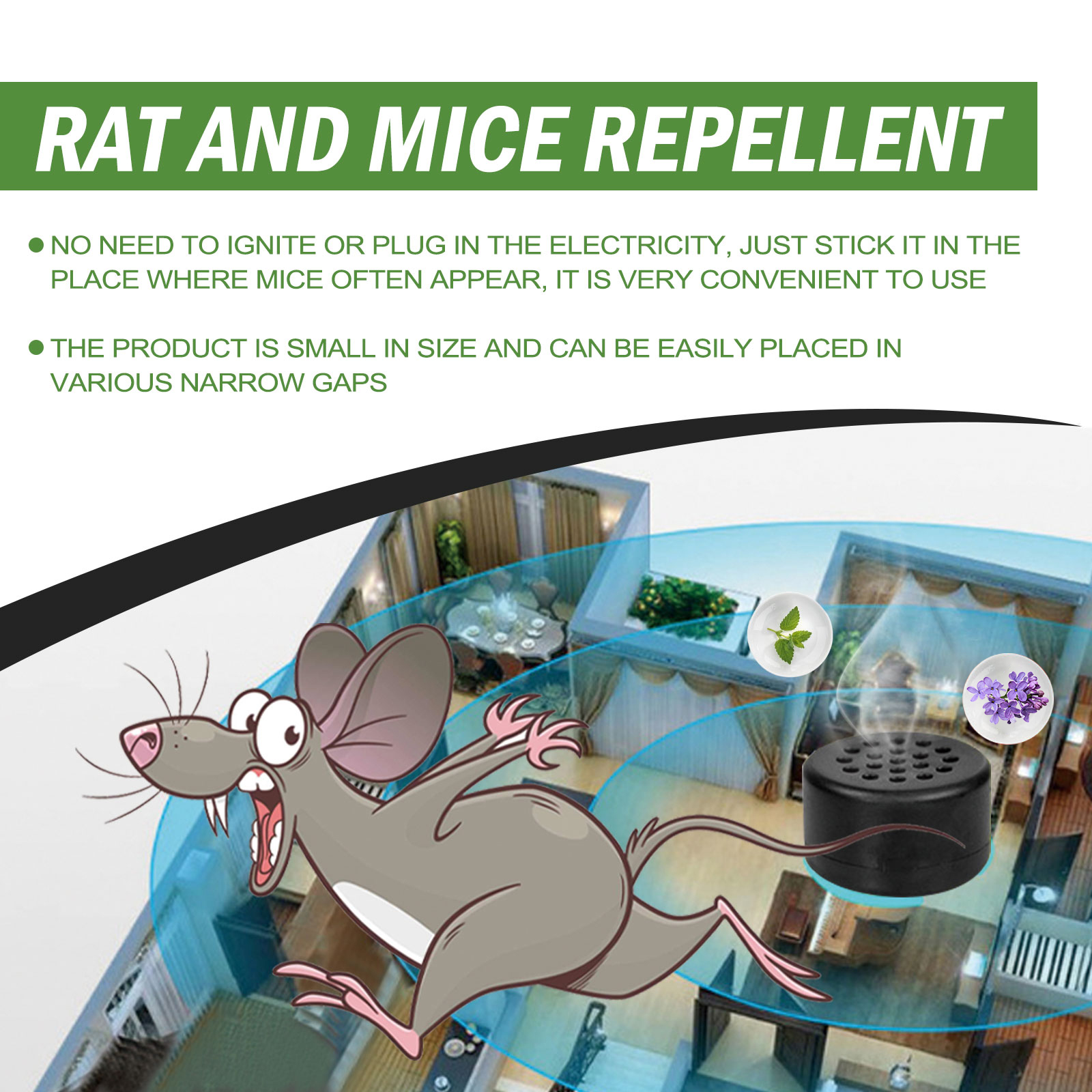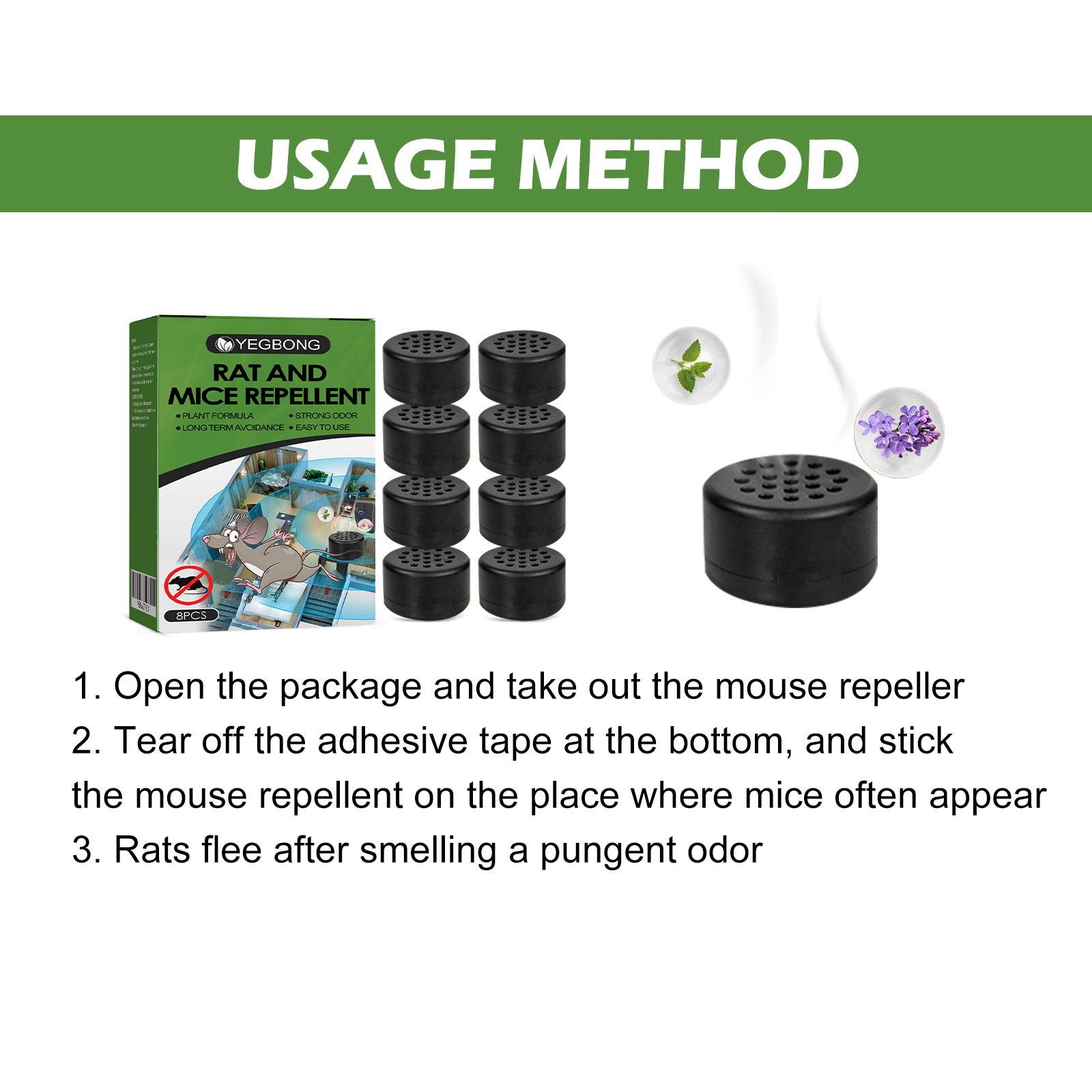 我们的老鼠趋避丸含有薄荷、大蒜、辣椒。它可以驱逐老鼠,让老鼠闻到味道而不敢出现,使用方便,长期有效。它的使用方法很简单:首先打开包装,取出驱鼠器,撕掉底部的胶带,粘住将驱鼠剂贴在老鼠经常出现的地方,之后老鼠闻到刺鼻气味后逃跑。使用后老鼠数量会渐渐减少,最后直到完全消失,让你不再被老鼠困扰。
