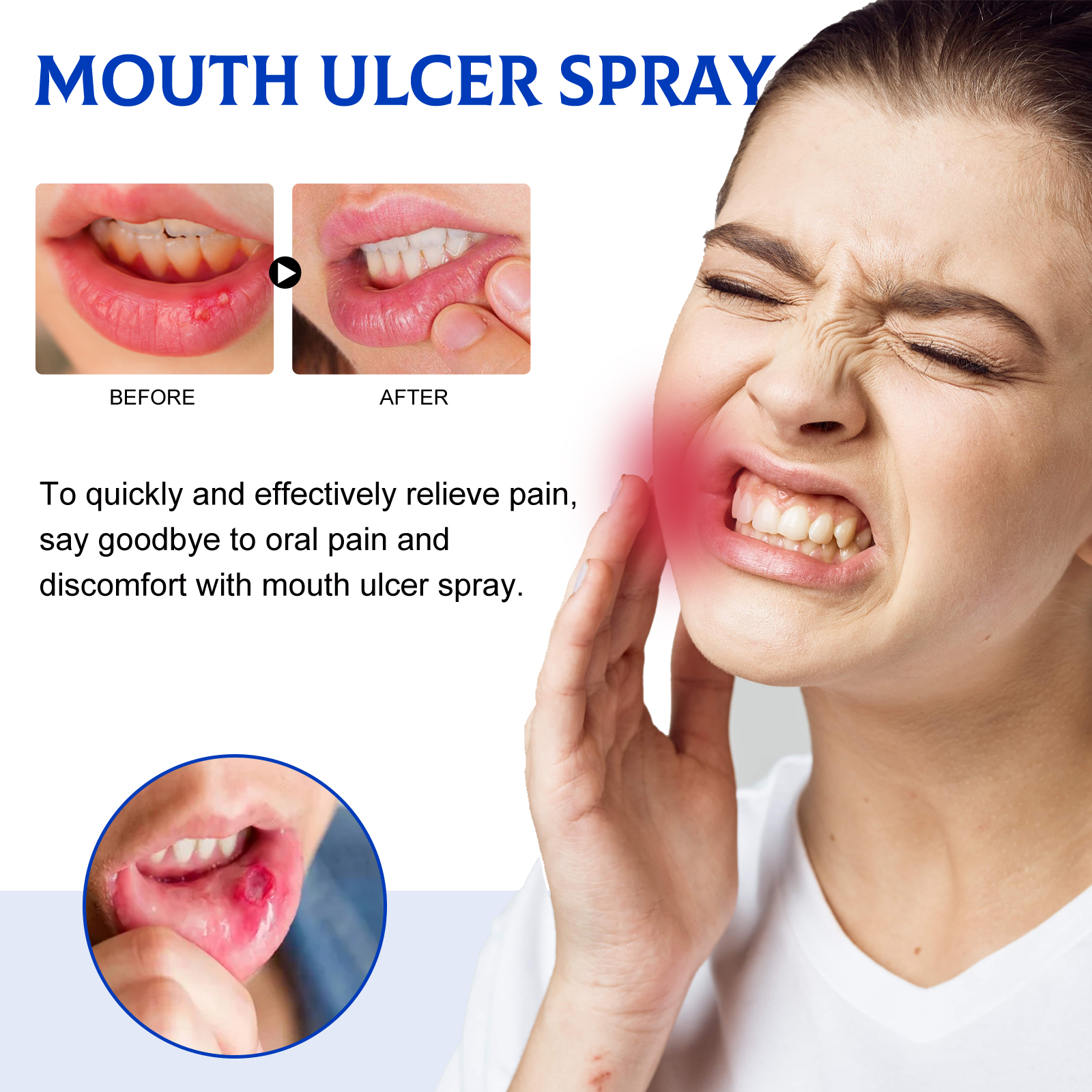 我们的口腔修护喷雾剂含有洋甘菊油、丁香油。它可以快速有效地缓解疼痛,用口腔溃疡喷雾告别口腔疼痛和不适。它的使用方法很简单:1.清洁口腔和手。2.按1-2个泵喷洒到口腔溃疡处。3.日常使用可以得到更好的效果。并且可以缓解和缓解口腔炎,减少炎症和肿胀,减轻疼痛和不适。