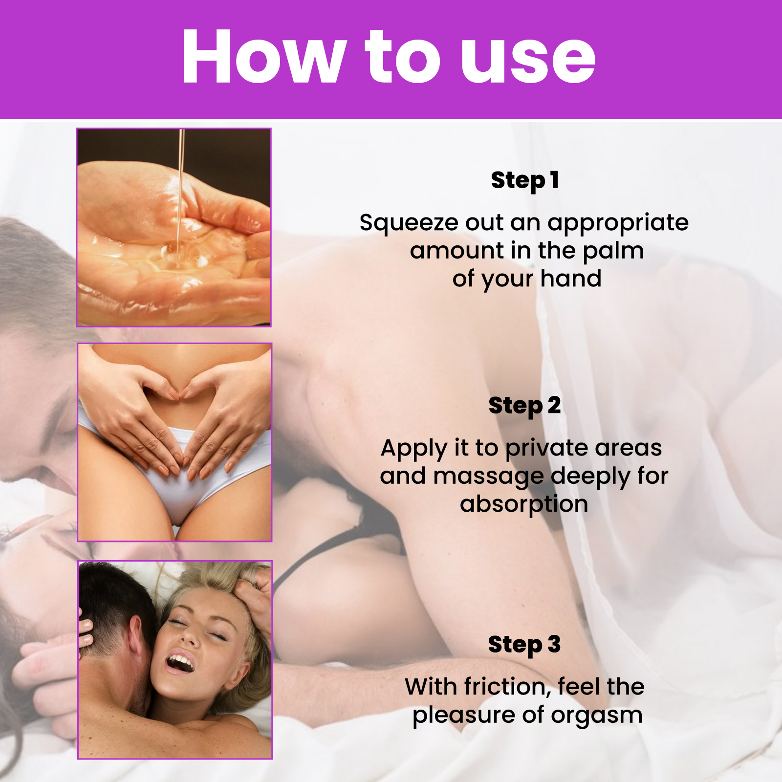我们的女士护理液含有透明质酸、甘油、玫瑰花油。它可以深入渗透到私密部位的肌肉基础,振奋私密部位敏感神经。它的使用方法很简单:步骤1,在手掌中挤出适量本产品;步骤2,涂抹在私密部位并深层按摩以吸收;步骤3,通过摩擦,感受高潮的快感。并且可以增加灵敏度,无副作用。