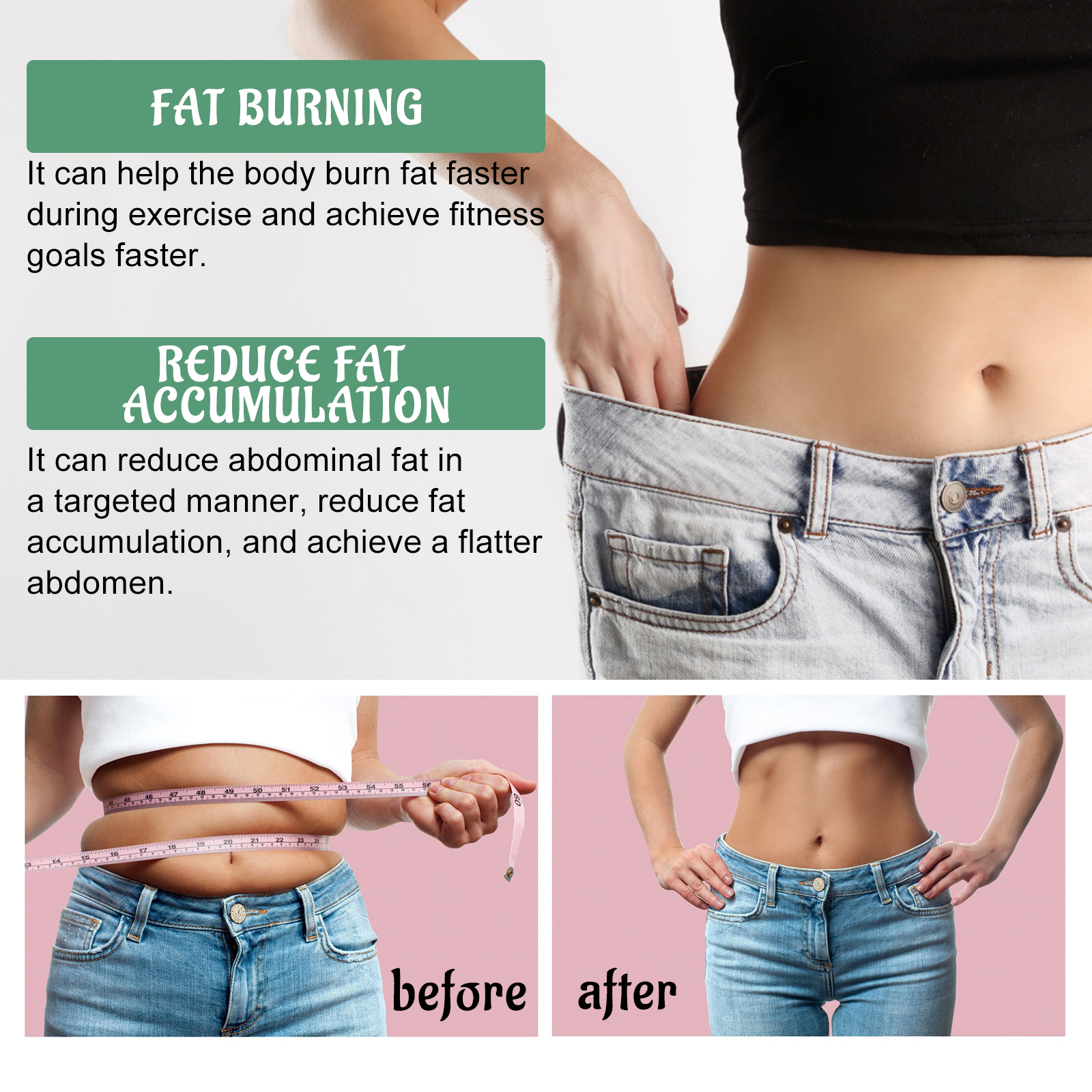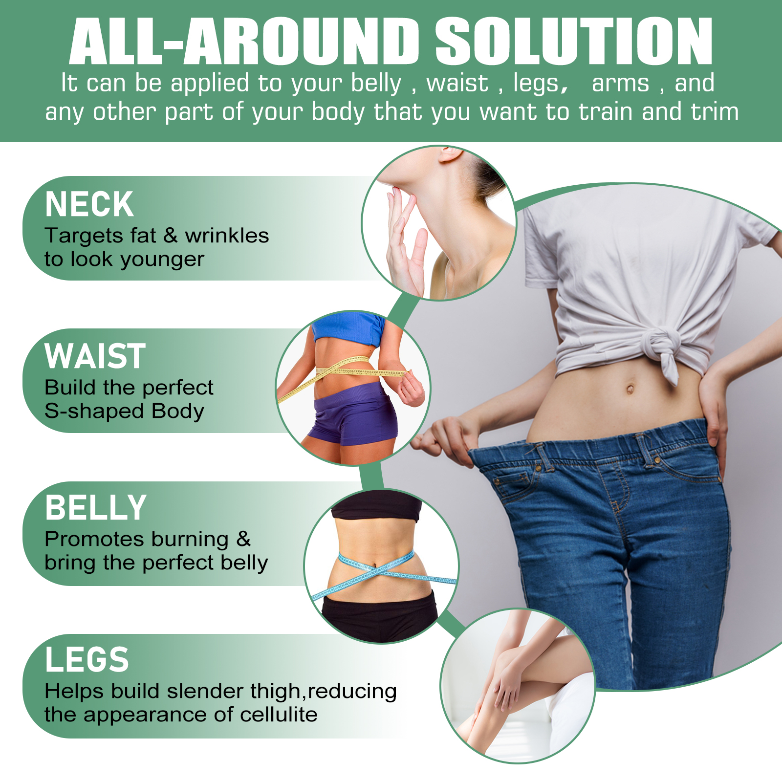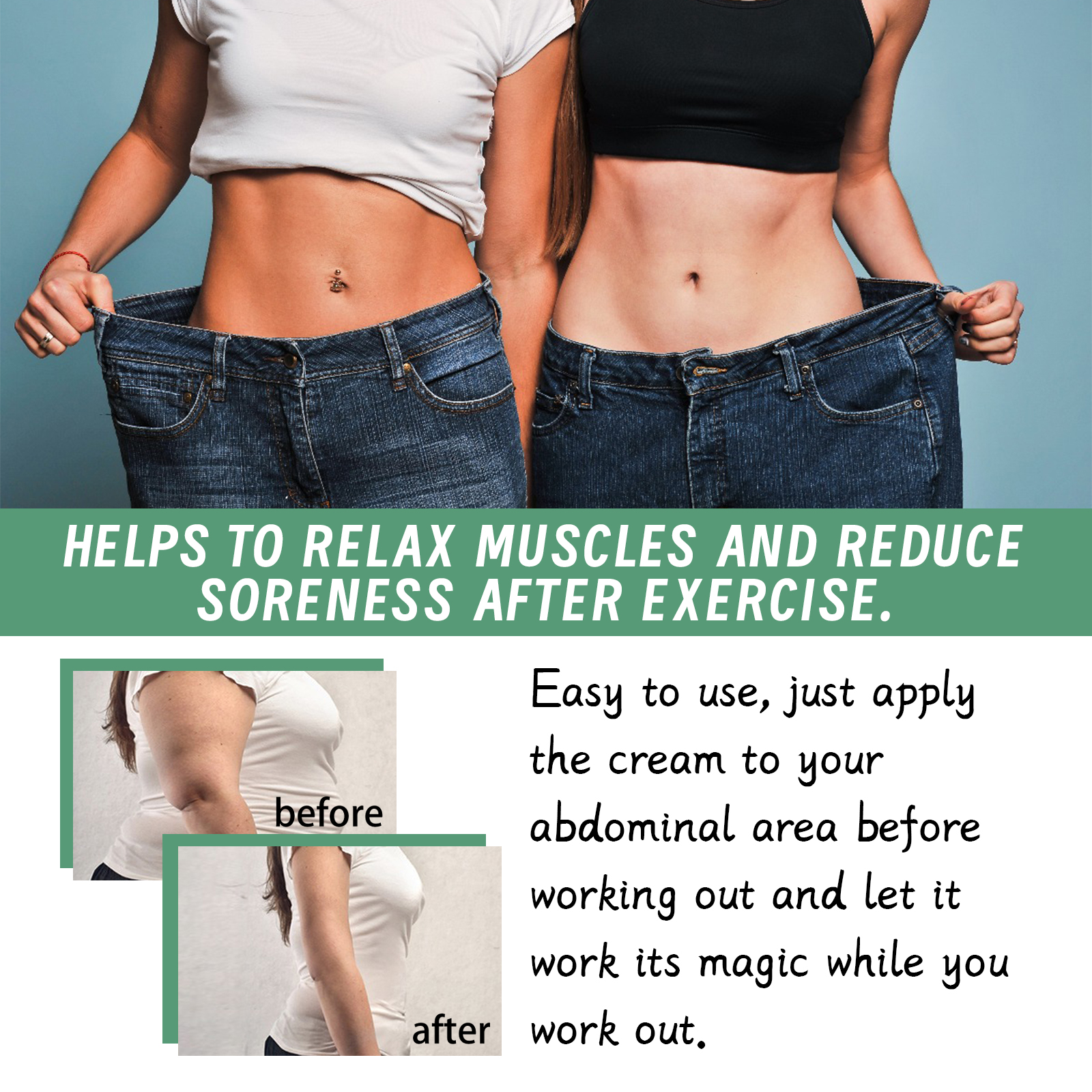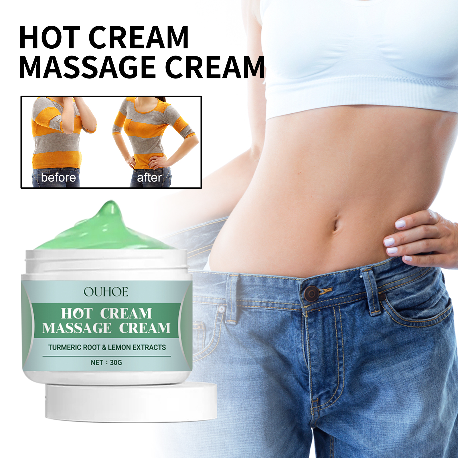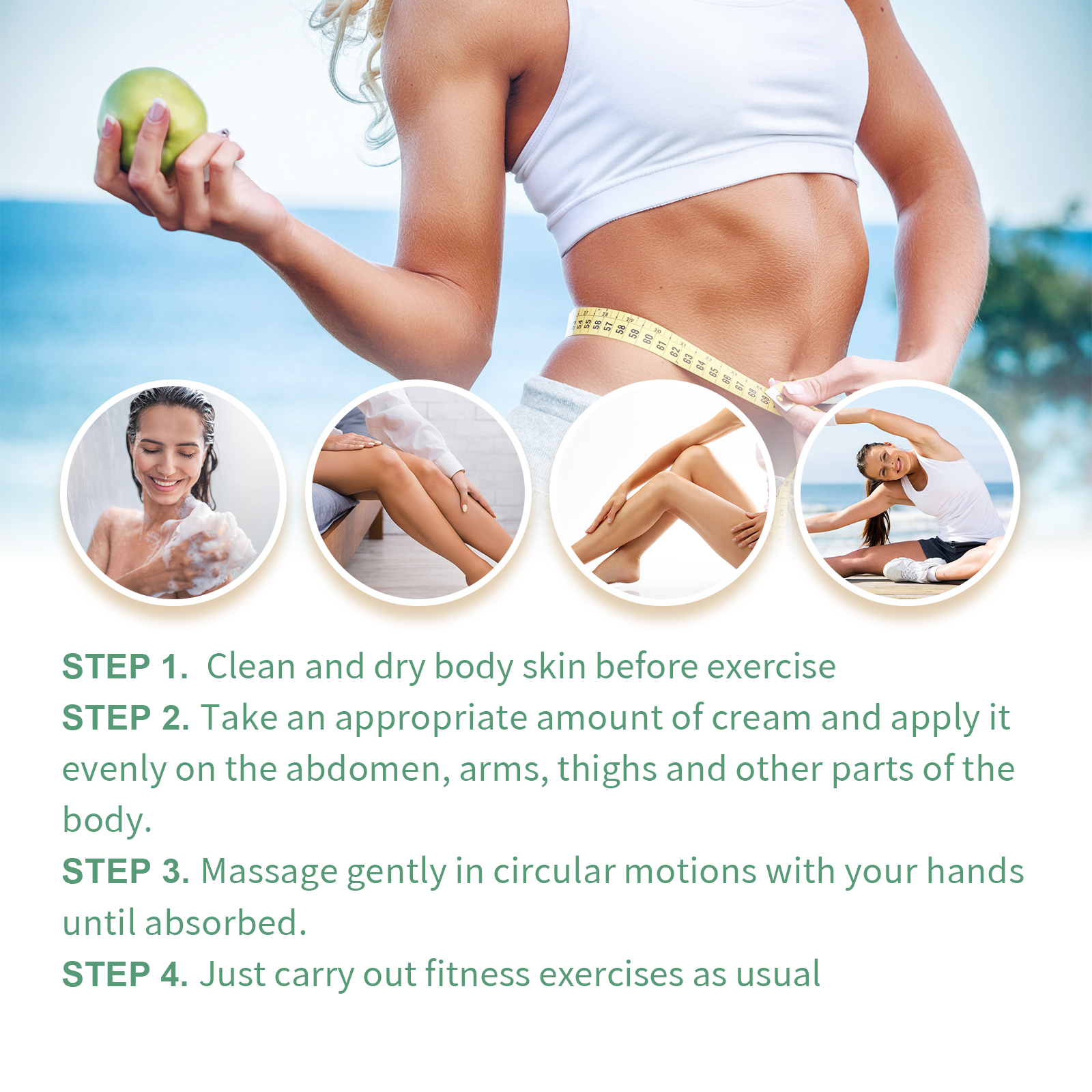 我们的塑身纤体霜含有姜黄根提取物、神经酰胺NP。它可以减少水分保留,增强代谢能力,促进脂肪燃烧。它的使用方法很简单:1.运动前清洁干燥身体肌肤。2.取适量面霜均匀涂抹于腹部、手臂、大腿及身体其他部位。3.用手轻轻打圈按摩,直到吸收。4.像往常一样进行健身锻炼。并且可以应用于你的腹部、腰部、腿部、手臂,以及你想训练和修剪的身体任何其他部位。