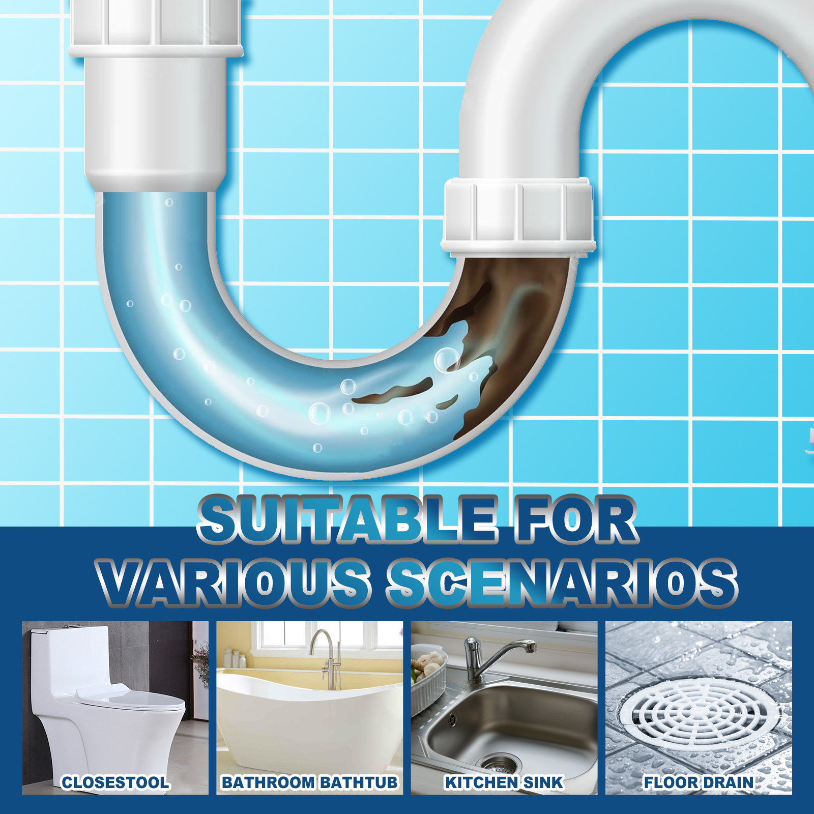 我们的排水管堵塞泡腾片含有小苏打,柠檬提取物,次氯酸钠。它可以快速降解头发、食物垃圾、油脂和卫生纸无毒,不含漂白剂或刺激性成分;不会产生刺鼻气味、刺激性烟雾或飞溅物;适用于厨房水槽、浴室浴缸、地漏、小便池等;只需每月使用一次,以保持管道畅通!它的使用方法很简单:打开包装,把泡腾片放进排水管里;向排水管中加入0.5升热水;等待10-15分钟,让泡腾片溶解,然后用大量清水冲洗。排水管堵塞泡腾片一次性清洗溶解的堵塞地方,打破顽固堵塞,无刺鼻气味,无水飞溅,疏通排水口、管道等,无毒易使用。