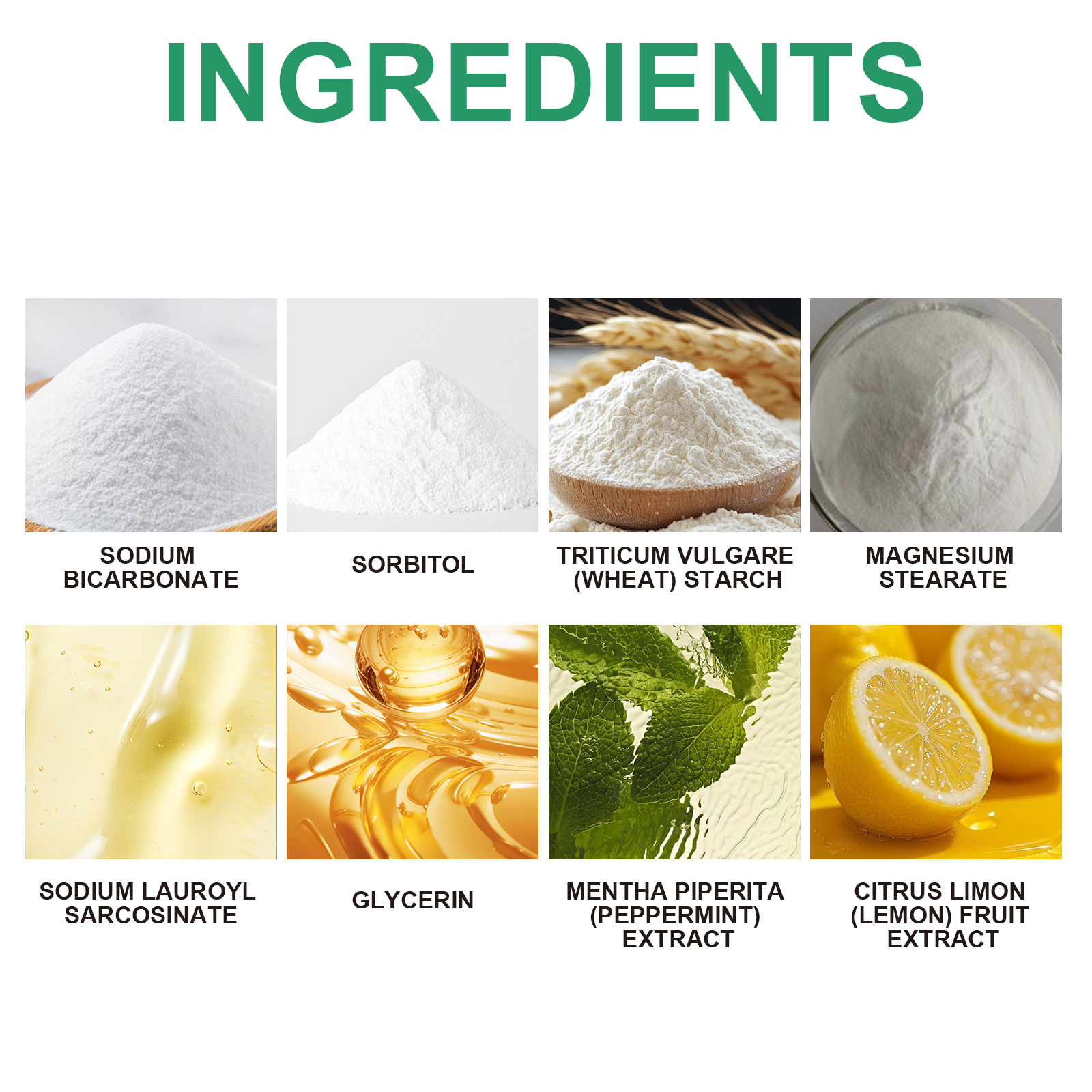 我们的牙齿洁白粉含有碳酸氢钠、山梨糖醇。它可以做到牙渍去除术,美白牙齿,清新口气,牙齿美白。它的使用方法很简单:将牙粉涂在牙刷上;像平常一样刷牙2-3分钟;用水漱口。并且使用过后牙齿白亮,牙垢脱落,拥有光彩照人的甜美笑容。