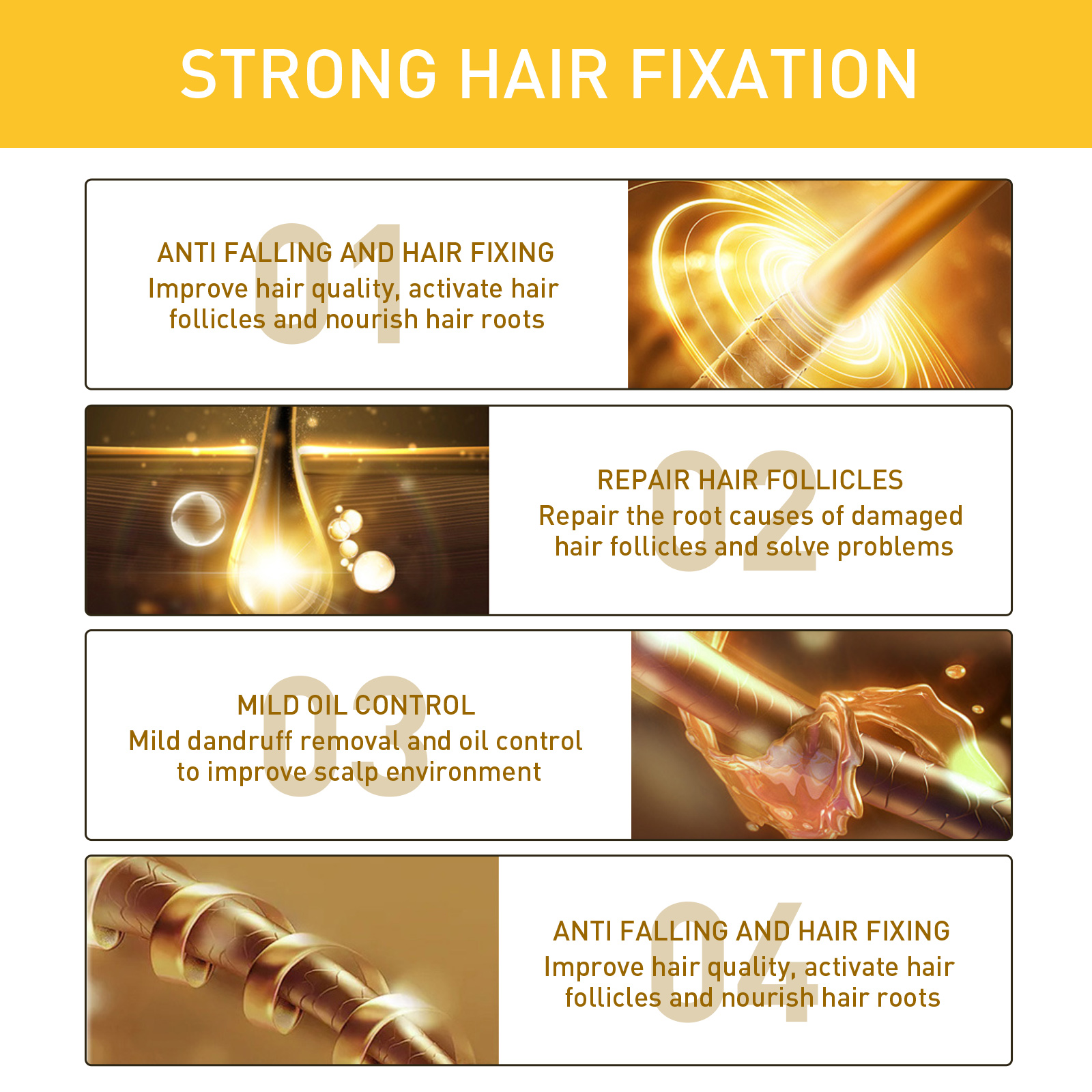 我们的生姜头发密发护发膏含有生姜油、荷荷巴油。它可以防止头发脱落,活化毛囊,滋养发根,温和去屑、控油,改善头皮环境,修复受损毛囊。它的使用方法很简单:试着把它涂在头皮上。用指腹按摩2-3分钟至吸收(无需清洗)。每天使用2-3次,效果较好。深度唤醒休眠的毛囊,促进新毛发的生长,使毛发更加健康浓密。