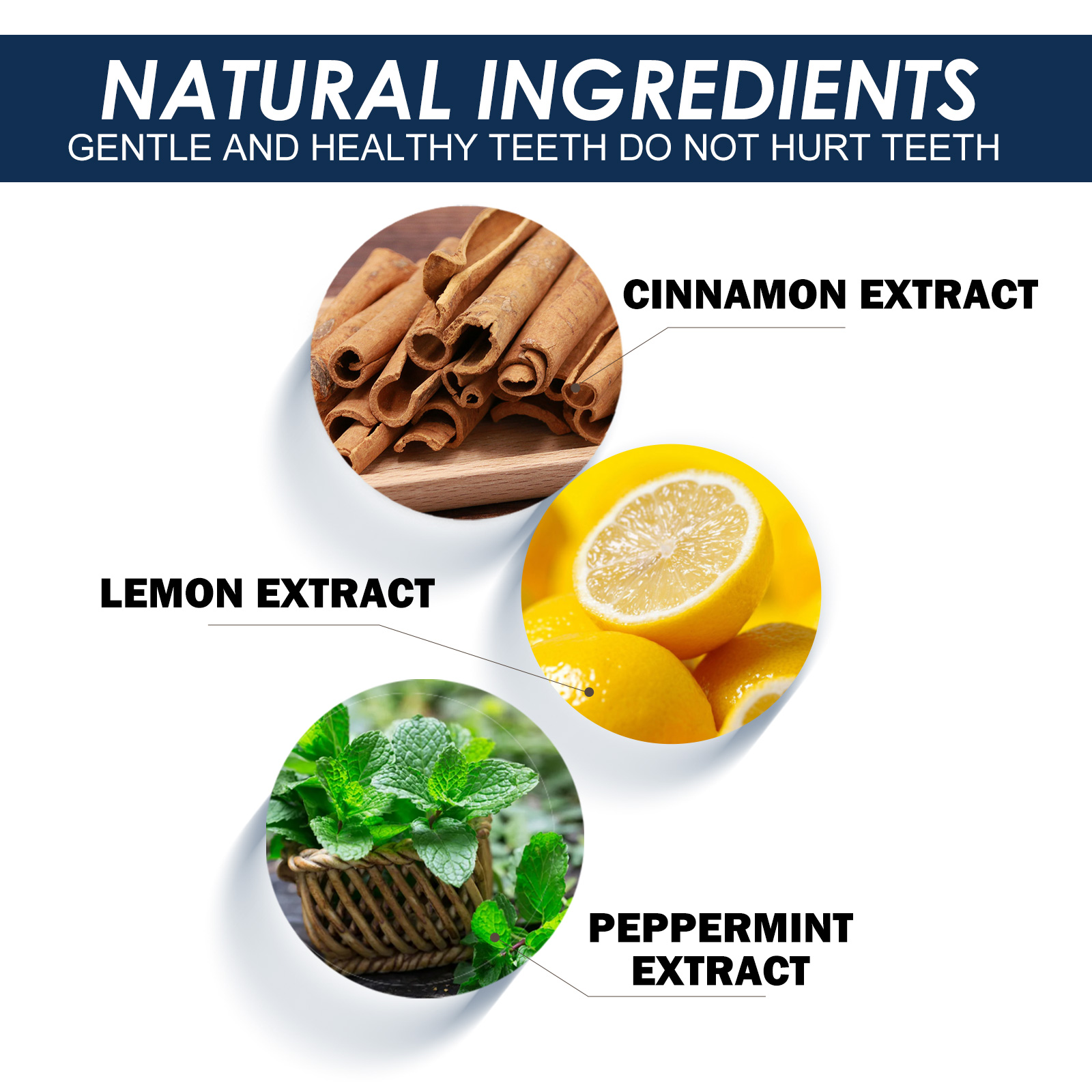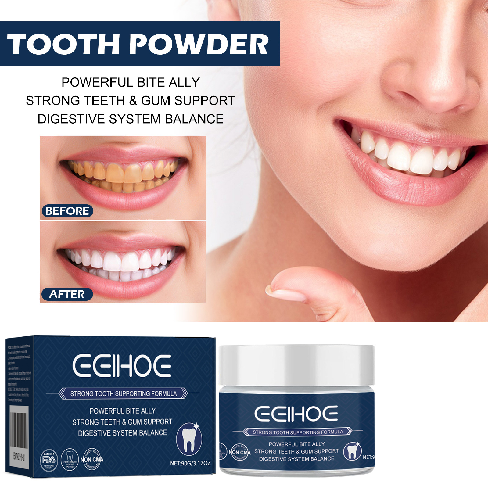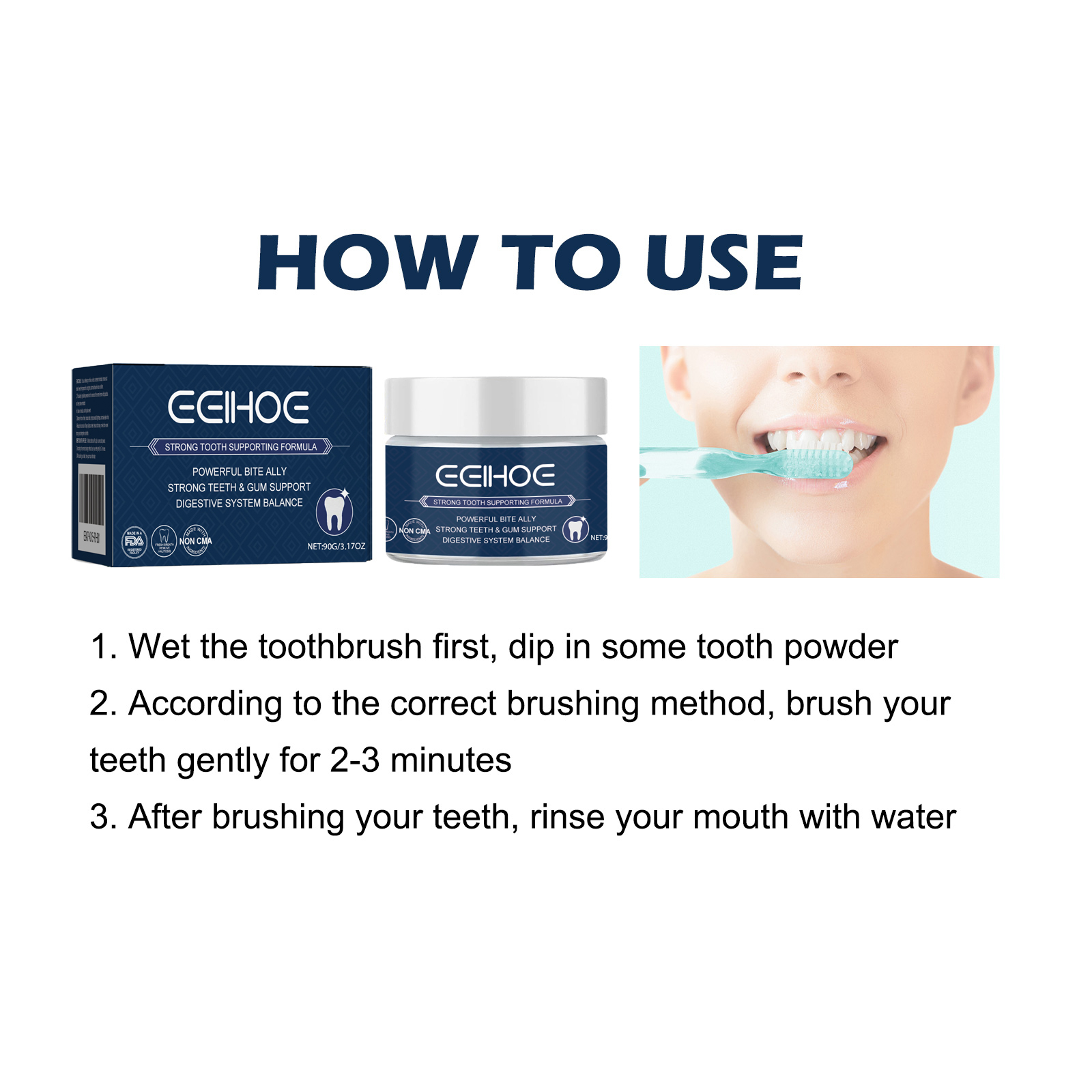 我们的牙齿焕白粉含有水合硅石、小苏打、肉桂提取物等,有效的牙齿保护修复牙龈,有效去除牙渍提亮牙齿,改善口腔异味清新口气。它的使用方法很简单 :先把牙刷弄湿,沾上一些牙粉,按照正确的刷牙方法,轻轻刷牙2一3分钟,刷牙后,用清水漱口。使用过后牙齿白亮,牙垢脱落,拥有光彩照人的甜美笑容。