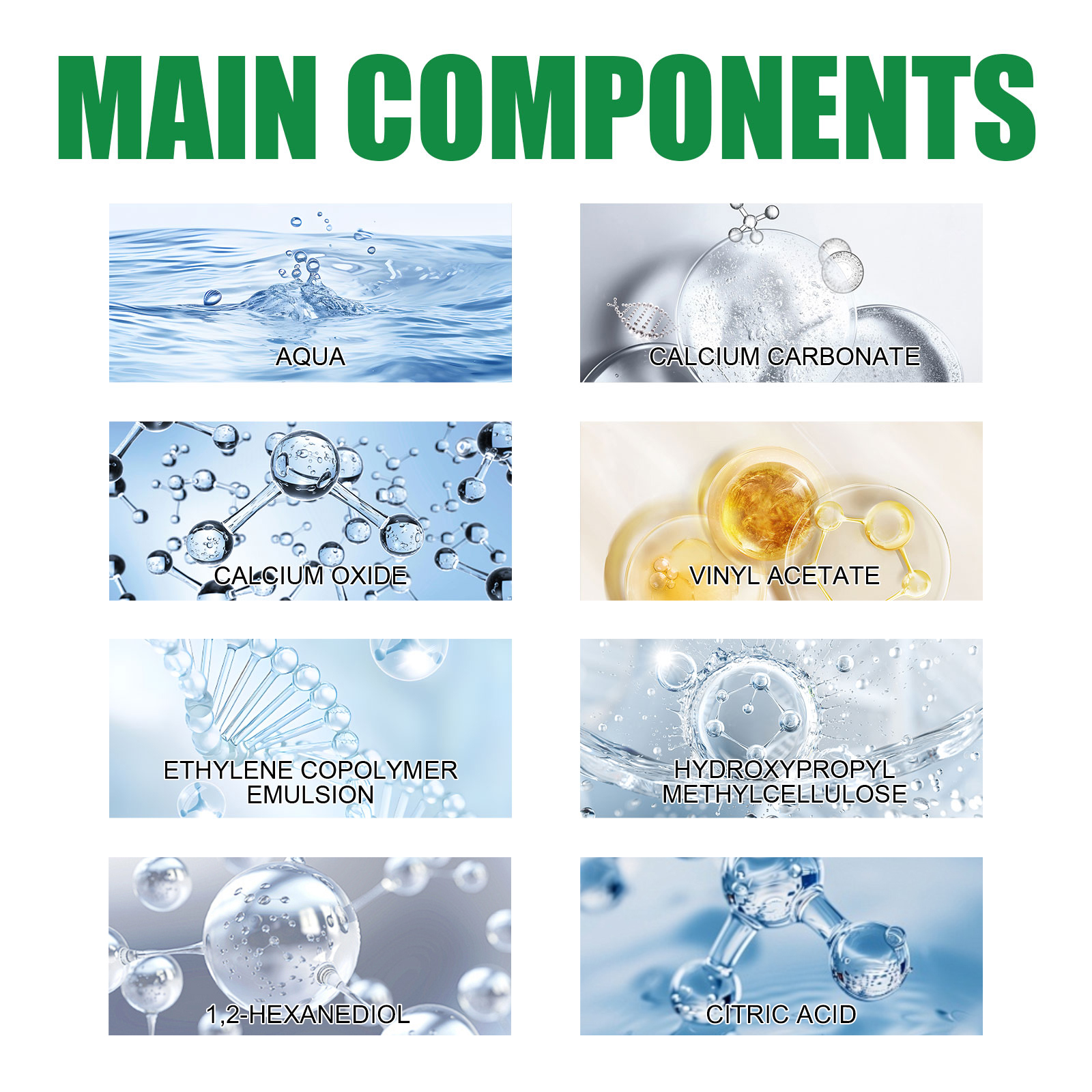 我们的补墙膏含有碳酸钙、氧化钙。它可以帮助你告别难看的裂缝、洞和污点,覆盖着污迹斑斑的涂鸦,得到一个光滑干净的墙壁;防水抗裂,耐碱、耐霉,快速干燥,环保。它的使用方法很简单:清除墙壁残留物;在患处挤适量的修护剂;用刮刀刮平直至均匀分布;晾干后将墙面抹平。补墙膏细腻光滑,修补后附着力强,与墙面牢固结合,经久耐用如新,使用方便,无论是小的钉孔还是较大的裂缝,都可以轻松修复,不留任何痕迹。