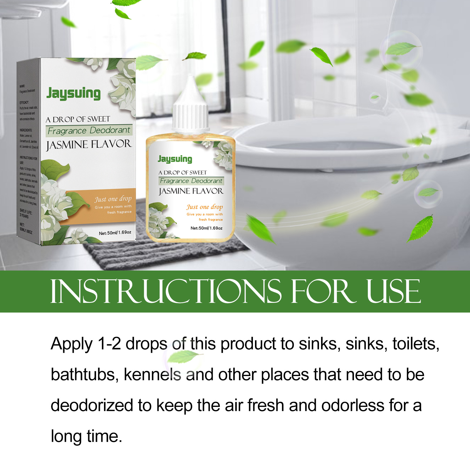 我们的香水除臭剂含有柠檬油,桂花油,茉莉油。它可以减少浴室的气味,使环境更清新,气味更干净,持久留香去异味,空气自然清新;它的使用方法很简单:将本品1-2滴涂抹于水槽、水槽、马桶、浴缸、狗舍等需要除臭的场所,可长期保持空气清新无臭。香水除臭剂注入茉莉花精油,香气清新浓郁,能净化清新空气,营造健康的生活环境。