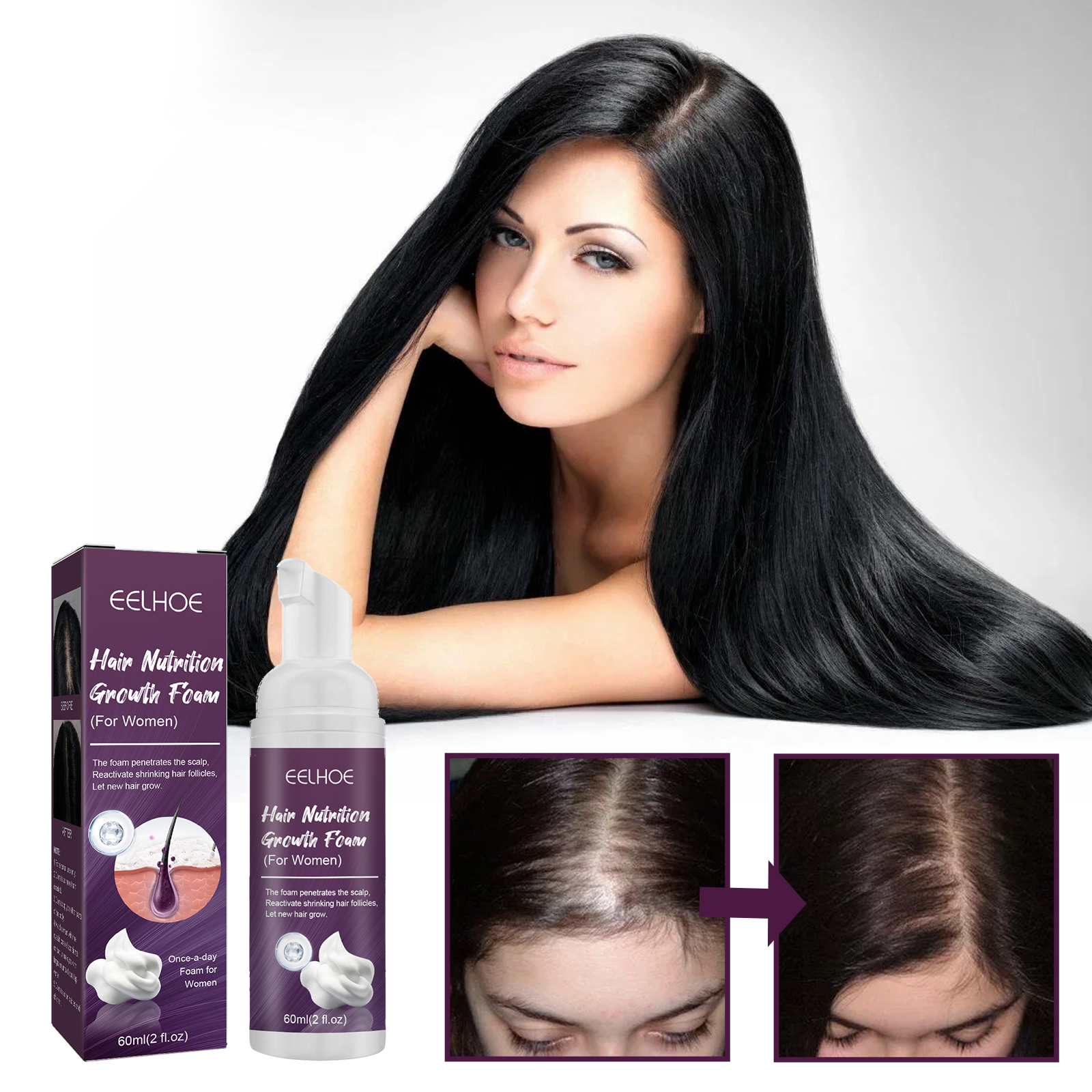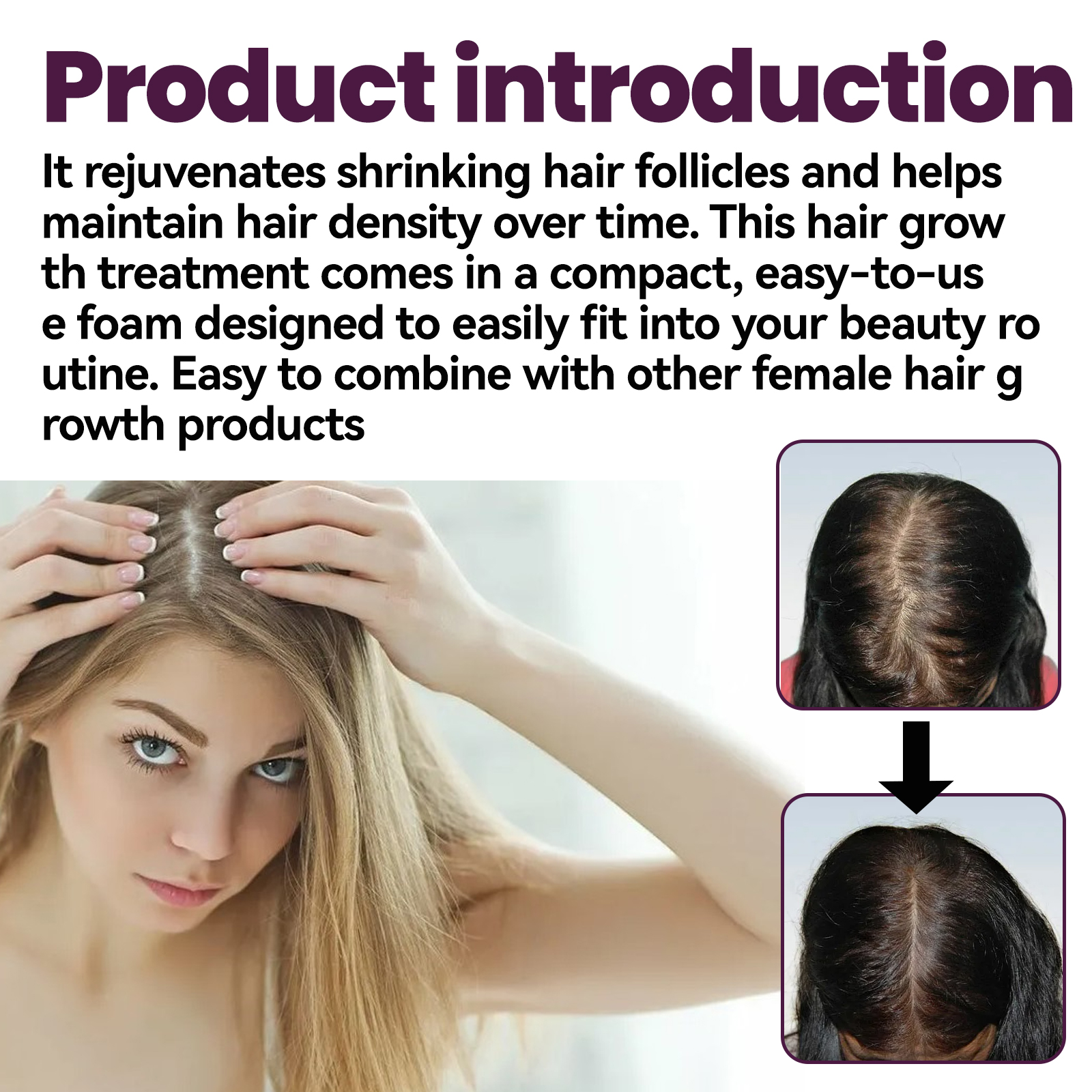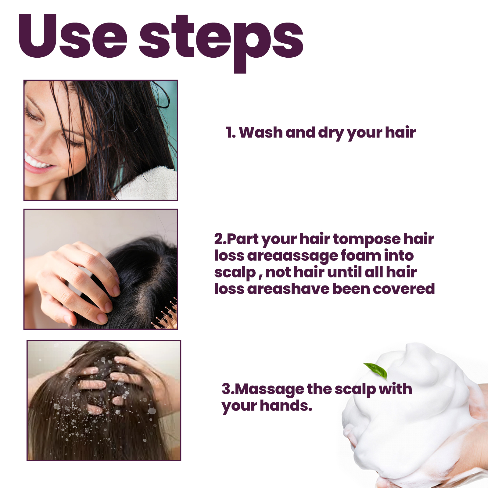 我们的泡沫柔顺发丝呵护含有生物素、人参根提取物。它可以使萎缩的毛囊恢复活力,帮助维持头发密度。它的使用方法很简单:洗净并吹干头发。把头发分开,把泡沫按摩到头皮上,而不是头发上,直到所有的脱发区域都被覆盖。在头发稀疏的头皮上按摩。头发乌黑浓密,修复毛囊,促进头发生长。