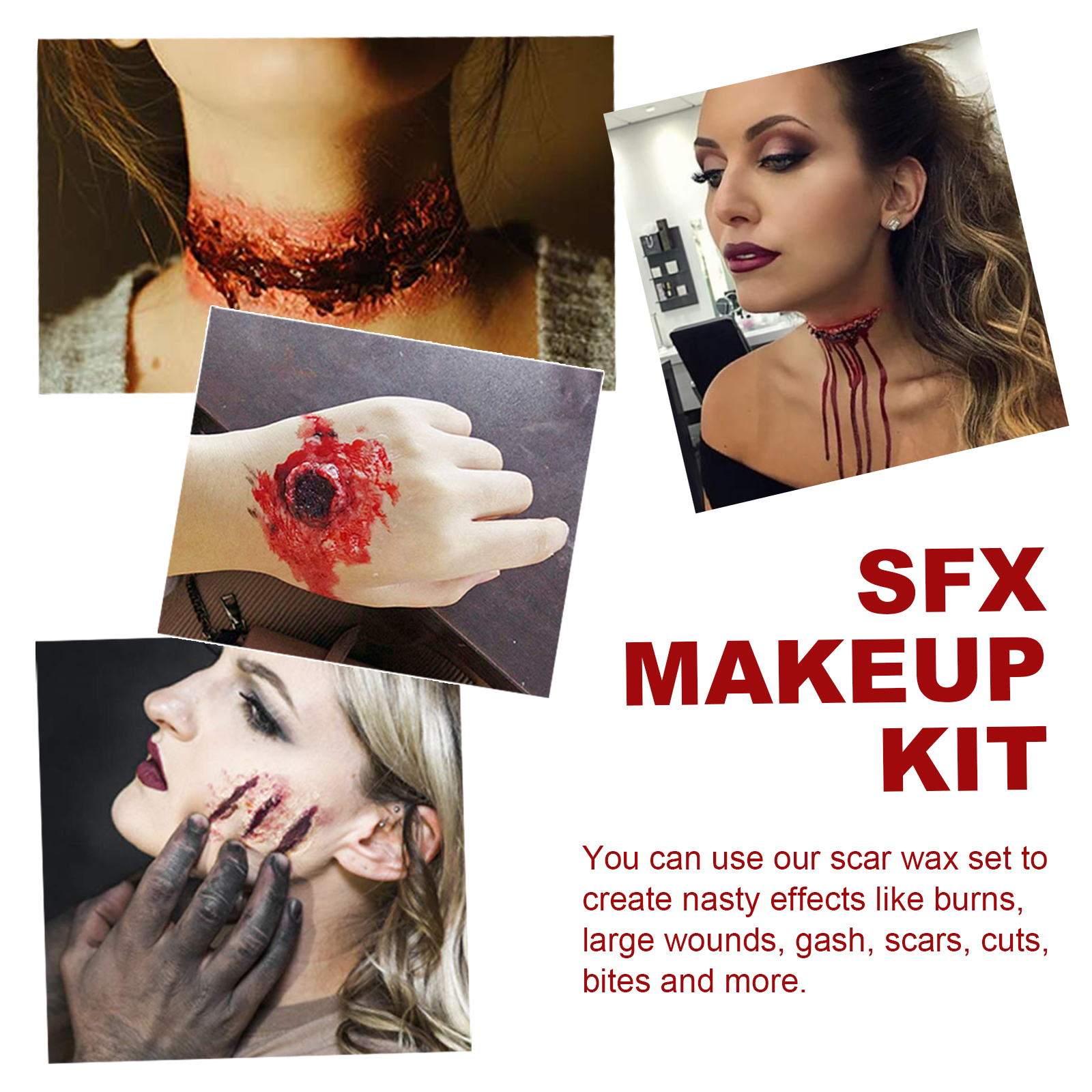 我们的万圣节肤蜡血浆化妆套装含有淀粉、食用色素、肤蜡。它可以制作不同的真实伤口效果,如划痕,飞溅。它的使用方法很简单:用双头刮刀挖出疤痕蜡,加热双手软化配方。想用哪儿就用哪儿。用我们的双头刮刀来切开伤口。然后涂上吸血鬼的血。可以一层一层慢慢刮掉,然后用卸妆水卸妆清洁。洗脸后,你可以用洗面奶洗脸。造成令人讨厌的效果,如烧伤,大伤口,裂口,疤痕,割伤,咬伤等。