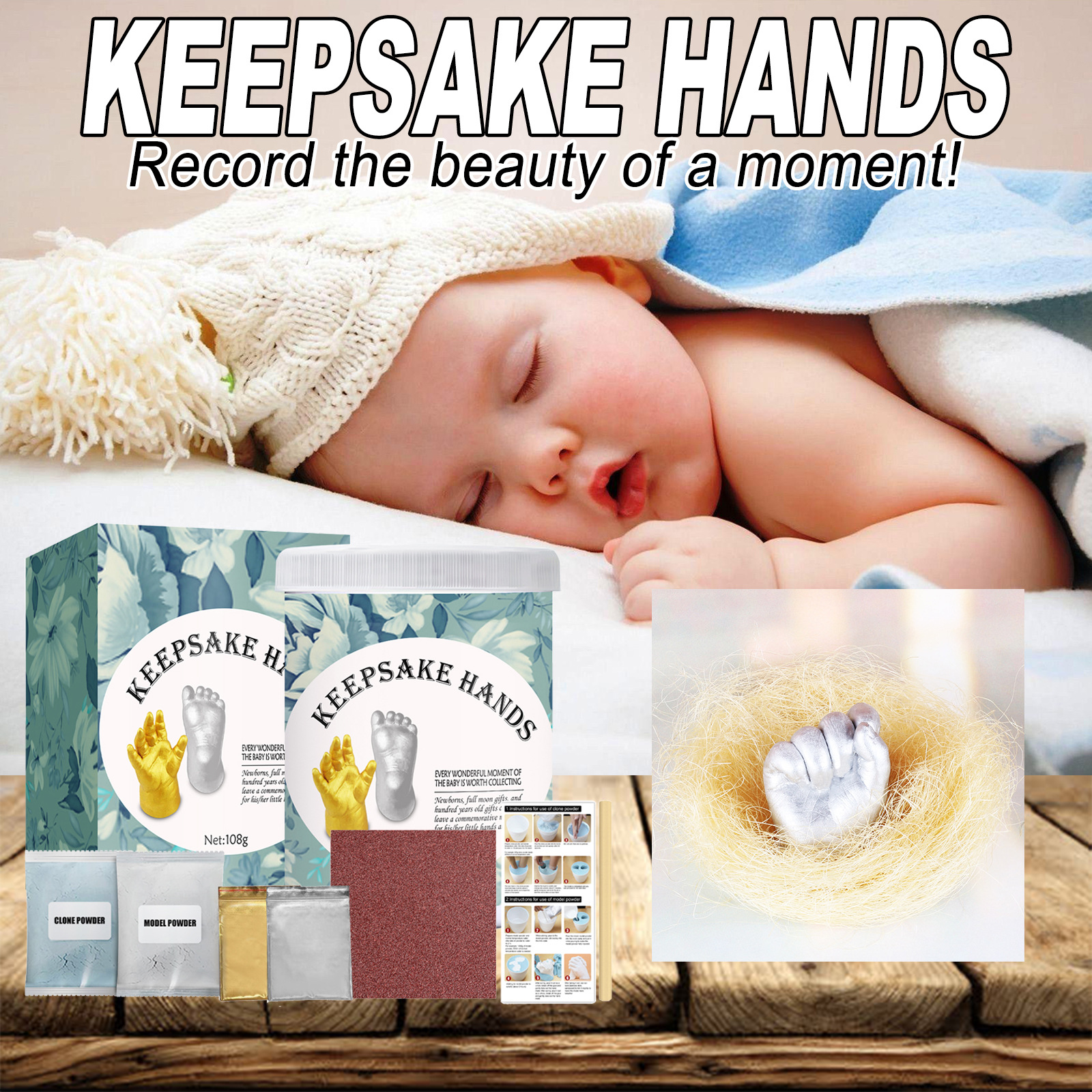 我们的婴儿手模粉套装含有金粉:稳定剂,填充剂;硅胶粉:云母粉,水泥助剂;克隆粉:海藻提取物,石膏粉;型号粉末:石膏粉,缓凝剂。它可以记录成长历程,精细捕捉每一条细纹和指纹,让您打造的产品更加完美,是一种爱的见证。它的使用方法很简单:1.预先准备克隆粉和一定比例的水,模型粉和一定比重的水,避免仓促;2.克降粉胶体的固化时间与温度成正比,水温越高固化越快,建议使用室温水。如果水温过高,克降粉会固化过快,如果混合不均匀,可能会出现豆腐渣;3.记得涂一些润肤露,可以去除皮肤上的气泡,使其更容易脱模,还可以护理娇嫩的皮肤;4.克隆粉胶体固化后,请将其置于胶体中约4分半钟,这样克降效果会更好;5.在填充模型粉末时,速度必须慢。倒一点。在摇晃的情况下,你可以敲击桌上可能产生的气体。并且适合青少年,成年人,情侣和朋友一起创造无价的回忆,是送礼的绝佳选择。