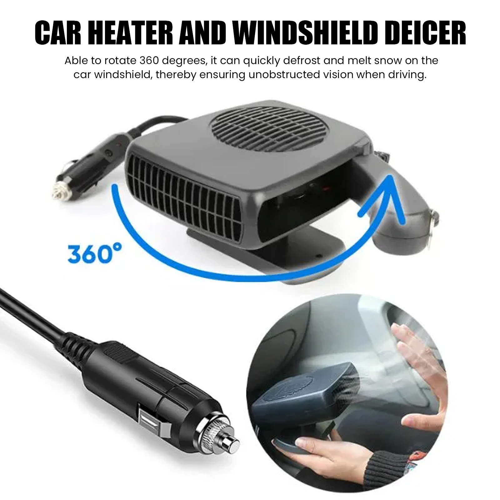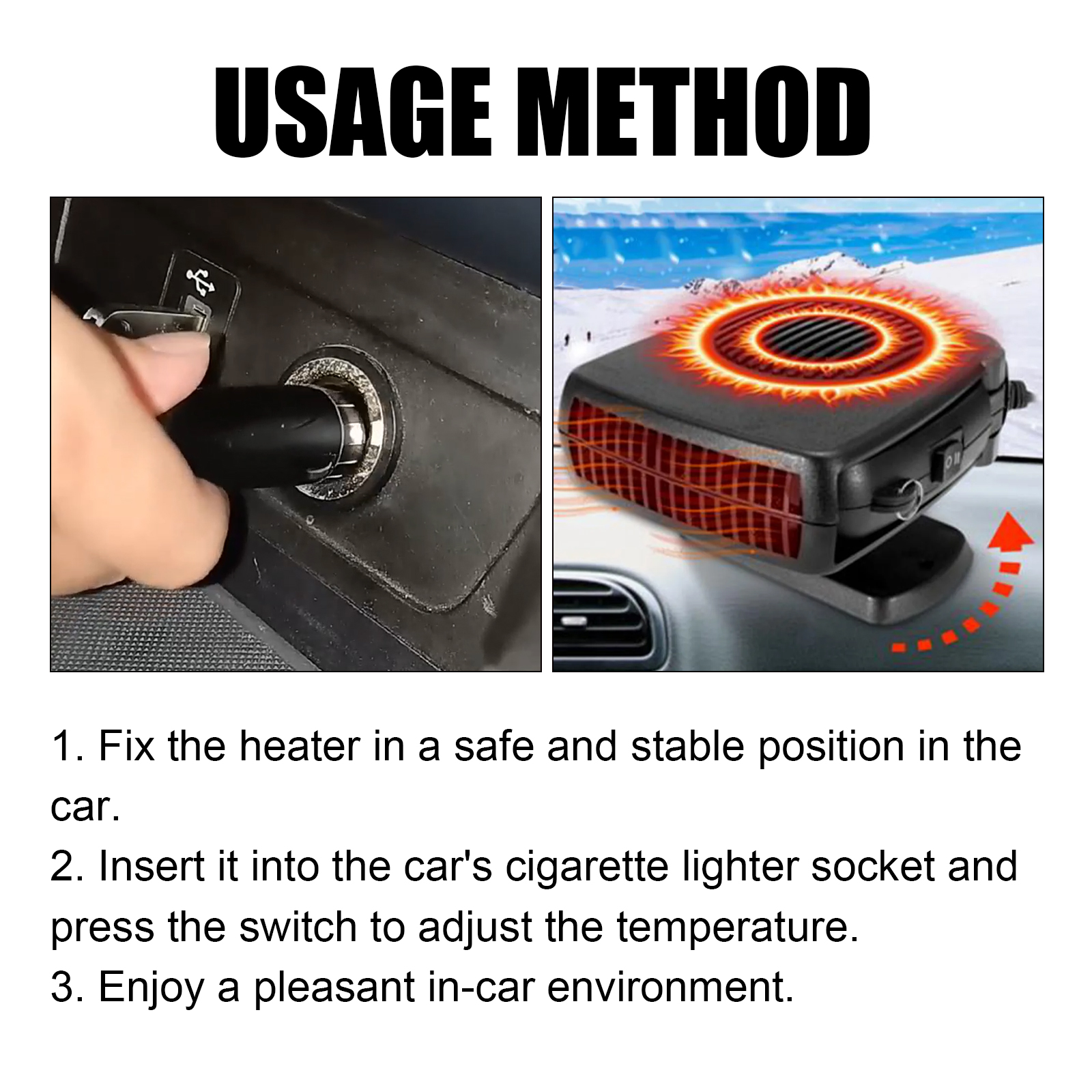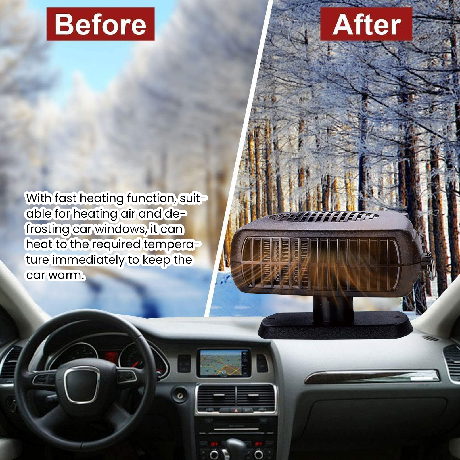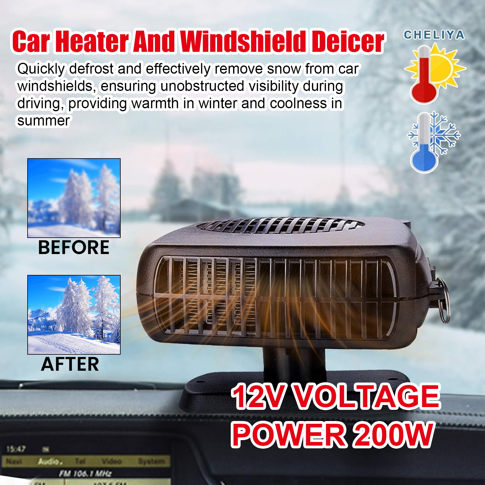 我们的车载暖风机。它可以快速除霜融化汽车挡风玻璃上的积雪,确保驾驶时视野畅通,同时对空气进行冷却,保证车内冬暖夏凉。它的电压: 12V,功率: 200W。它的使用方法很简单:首先将加热器固定在车内安全稳定的位置,将其插入汽车点烟器插座,按下开关即可调节温度,之后即可享受舒适的车内环境。使用后加热空气和除霜车窗,可立即加热到所需温度,保持车内温暖,快速除霜,有效清除汽车挡风玻璃上的积雪,让出行更加安全。