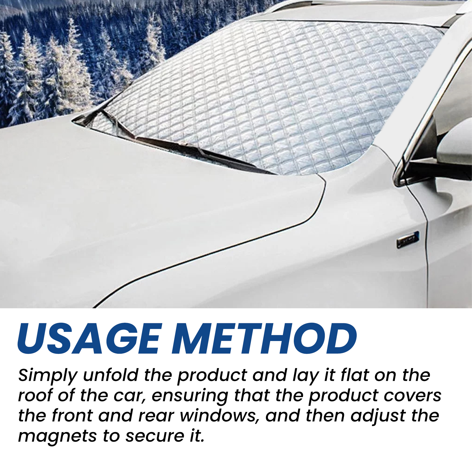 我们的遮雪罩含有铝膜、植绒、无纺布。它可以保护汽车不受冰、霜、雪的侵害,采用5块磁铁和弹性边设计,将篷布牢固地固定在车顶上,防止强风吹走。它的使用方法很简单:首先只需将产品展开平放于车顶上,确保产品覆盖前后车窗,然后调整磁铁固定即可。使用后可以为汽车增添一层保护,为汽车挡住树叶、阳光直射、鸟类粪便、积雪等各种有损汽车表面的物质。