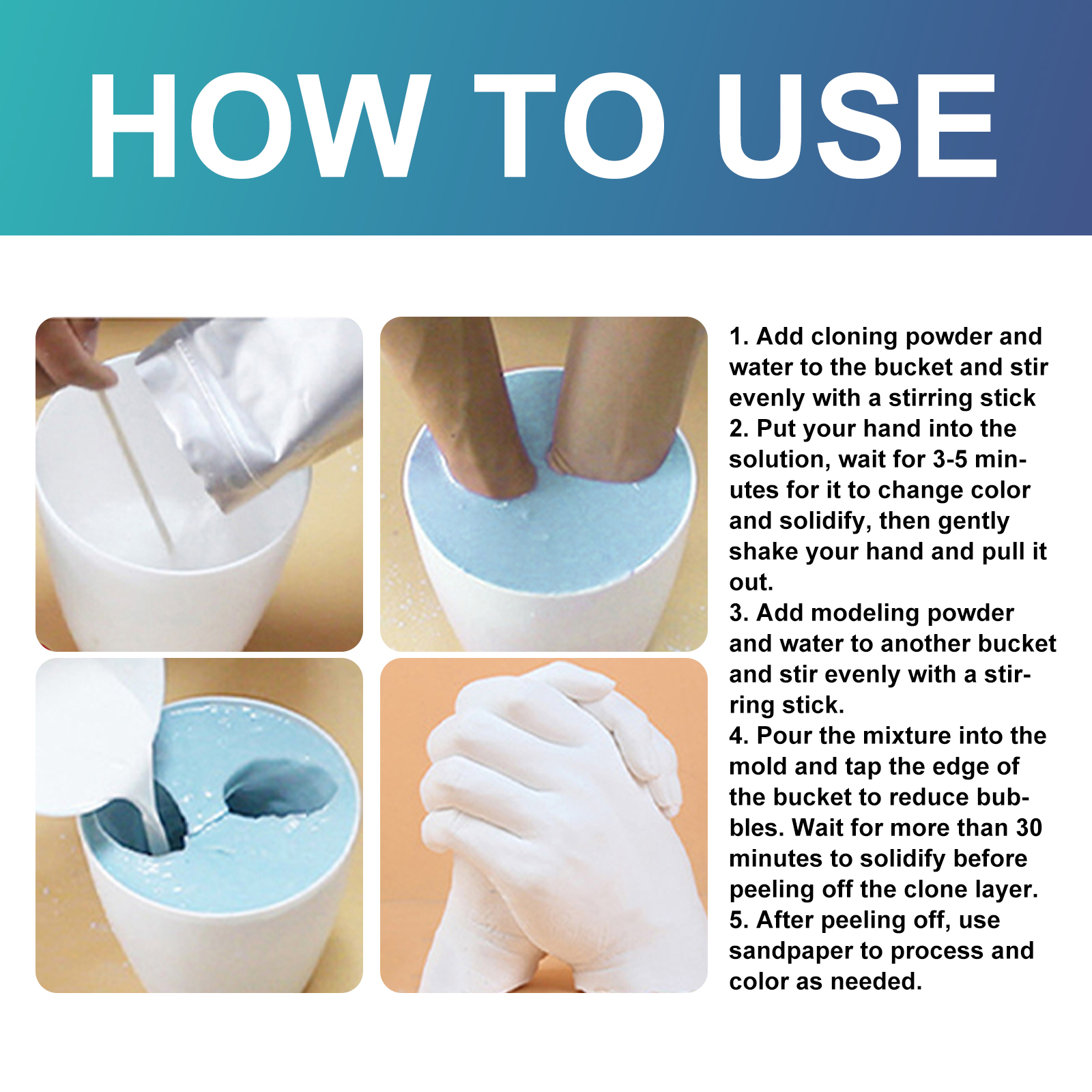 我们的DIY石膏模具雕塑套件含有藻酸盐,胶结剂,缓凝剂。它可以记录成长历程,精细捕捉每一条细纹和指纹,让您打造的产品更加完美,是一种爱的见证。它的使用方法很简单:在桶中加入克隆粉和水,用搅拌棒搅拌均匀;将手放入锅中,约5分钟,待其变色、凝固后,轻轻摇动手,将其拉出;在另一个桶中加入造型粉和水,用搅拌棒搅拌均匀;将混合物倒入模具中,轻敲桶的边缘以减少气泡。等待30分钟以上凝固后再剥去克隆层;剥落后,用砂纸加工,根据需要上色。适合青少年,成年人,情侣和朋友一起创造无价的回忆,它也是送礼的绝佳选择。