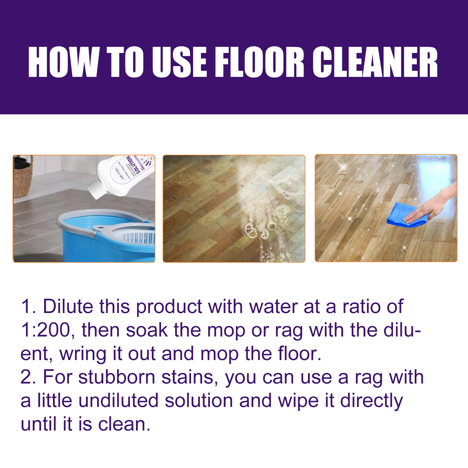 我们的木质地板清洁液含有表面活性剂、渗透剂、薰衣草提取物。它可以有效地分解各种污垢和油渍,使你干净的表面再次焕发光彩;强力去污,迅速渗透到清洁表面,分解污渍并产生废液。它的使用方法很简单:用水稀释本品,比例为1:200,然后用稀释剂浸泡拖把或抹布,拧干后用拖把拖地;对于顽固的污渍,你可以用抹布和少许未稀释的溶液直接擦拭,直到它是干净的。木质地板清洁液富含薰衣草香味,能去除清洁表面的异味,让您享受清洁后的清新气味;快干地板,干净如新。
