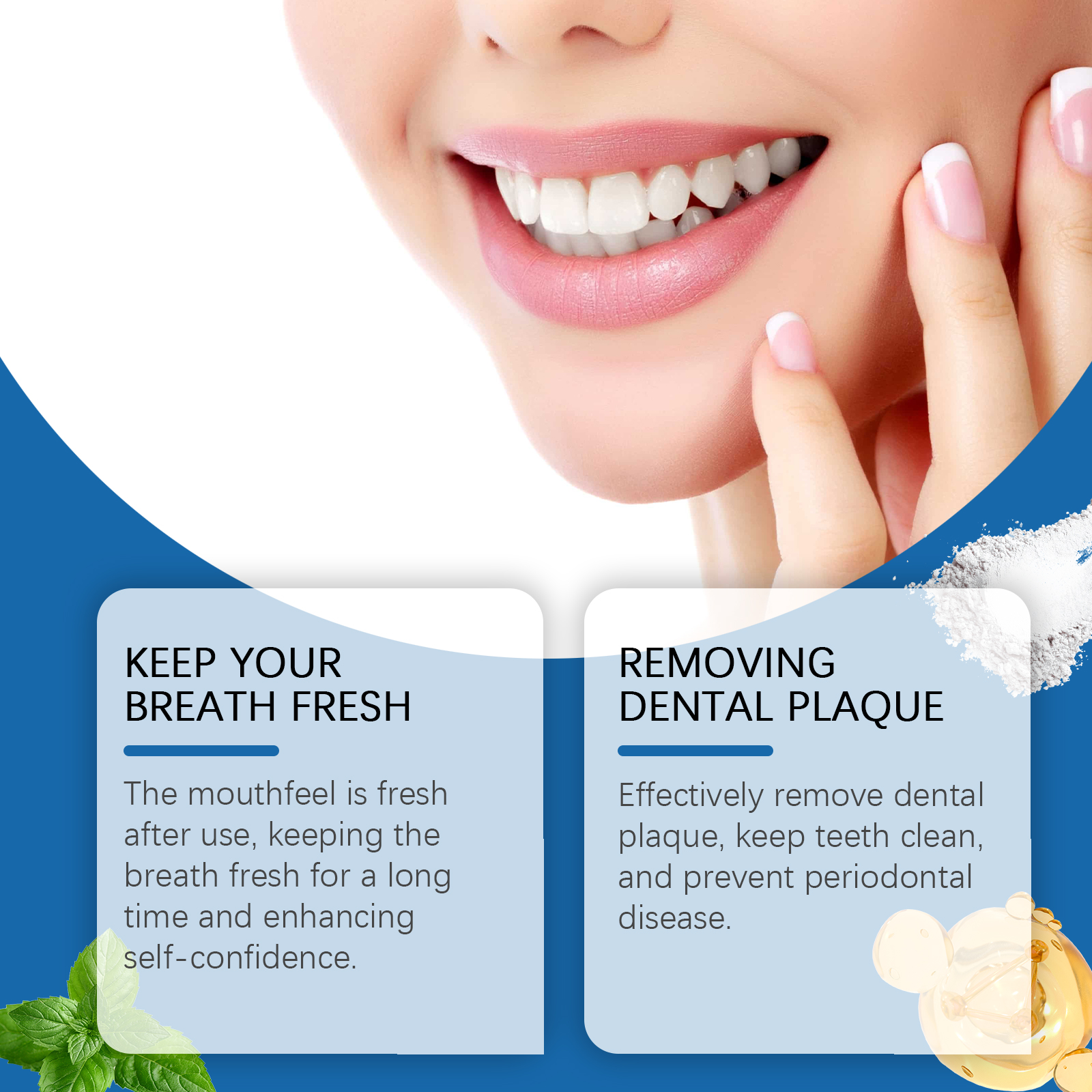 我们的洁牙粉含有辣薄荷提取物、薰衣草花提取物。它用后口感清爽,能长时间保持呼吸清新,增强自信心。有效清除牙菌斑,保持牙齿清洁,预防牙周病。它的使用方法很简单:取适量本品涂在牙刷上。用正确的刷牙方法轻轻刷牙3分钟。用水彻底冲洗口腔。并且可以随着持续使用,牙齿的颜色会明显改善,让你的笑容更自信,适合全家使用,全方位呵护口腔健康。