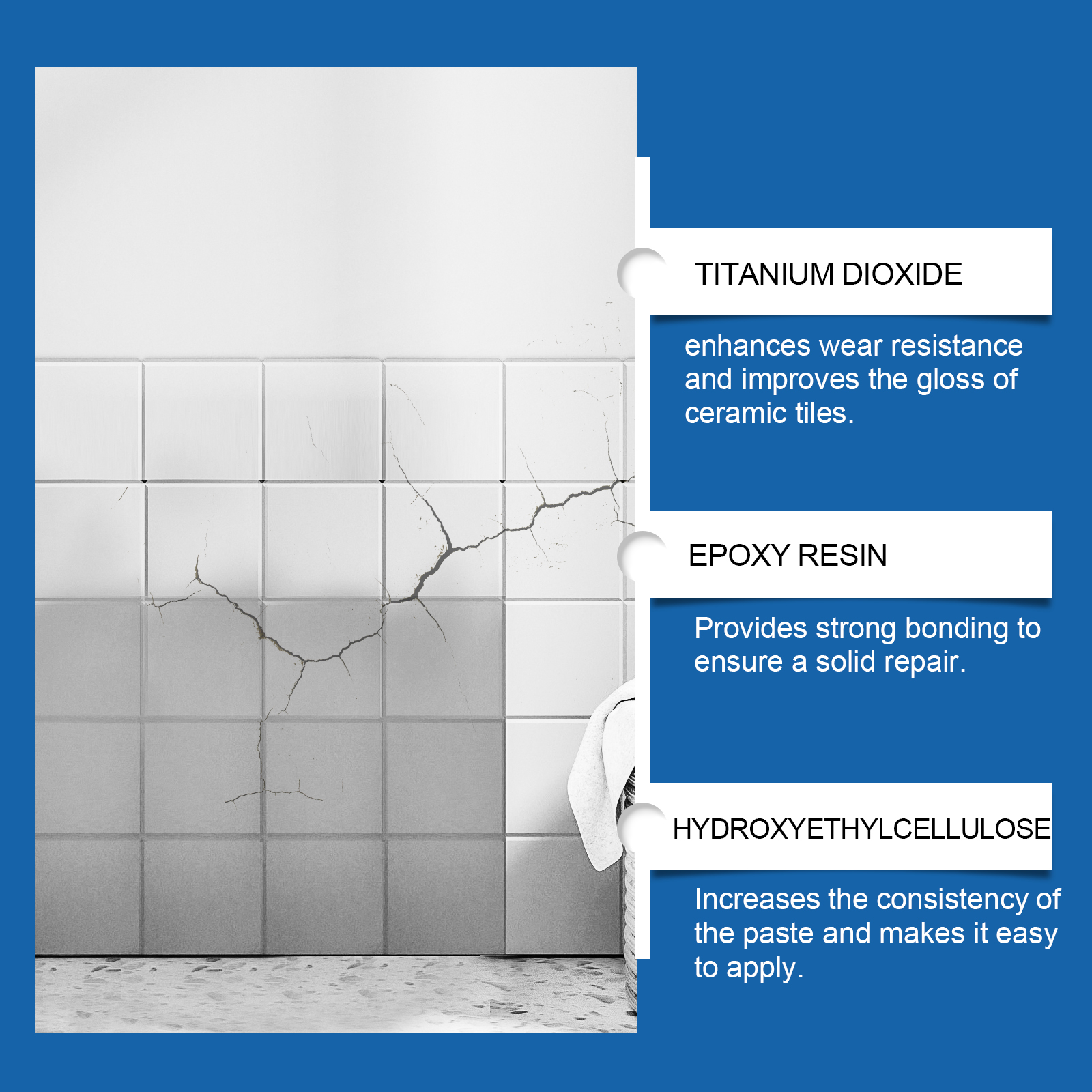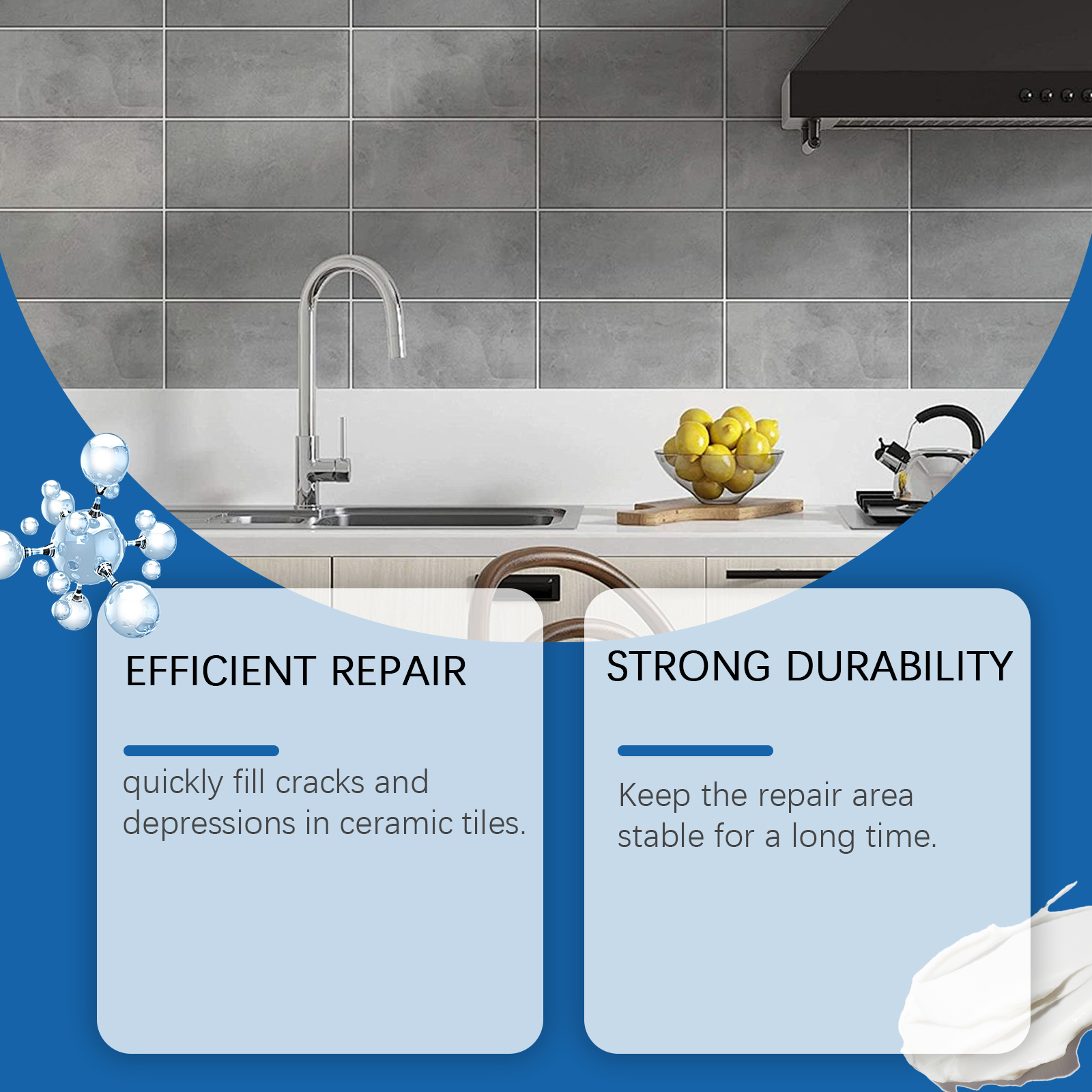 我们的瓷砖修补膏含有碳酸钙、氧化钙。它可以快速填补瓷砖中的裂缝和凹陷,保持维修区域长时间稳定。它的使用方法很简单:1.清洁需要修复的区域。2.将本品均匀挤压在瓷砖背面。3.用力按压瓷砖30秒。4.等待24小时固化。并且可以准确匹配瓷砖,以增强修复区域的强度,并确保持久的损坏。