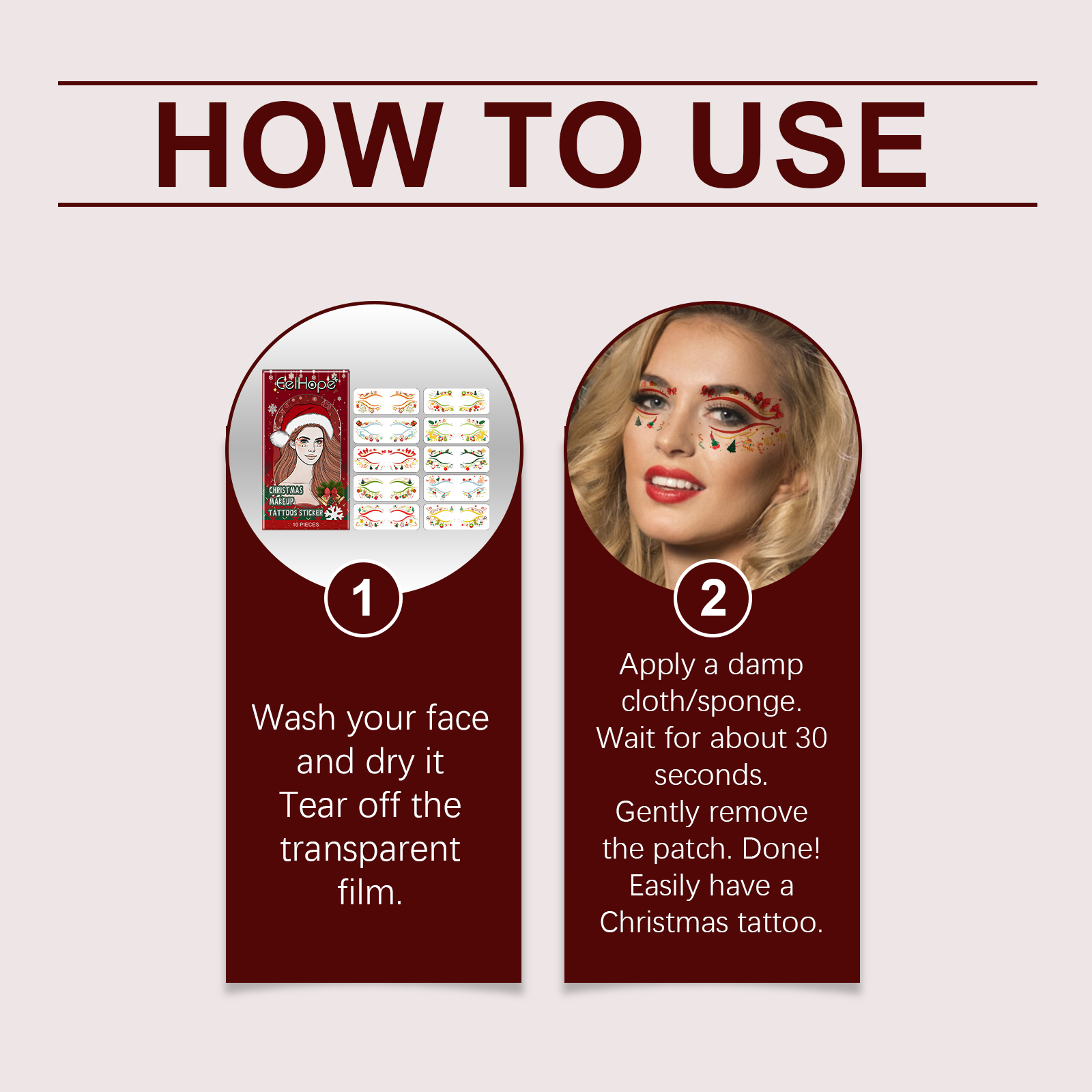 我们的圣诞节脸贴含有水转印纹身贴纸、PE膜,它可以快速贴合肌肤,适合所有脸型,无需额外的化妆工具。它的使用方法很简单:洗脸并擦干,撕掉透明的薄膜。涂抹湿布/海绵等待约30秒,轻轻去除贴片。完成!轻松拥有圣诞纹身。并且采用独特的设计,带来浓厚的圣诞气氛,并增强了节日着装的效果。