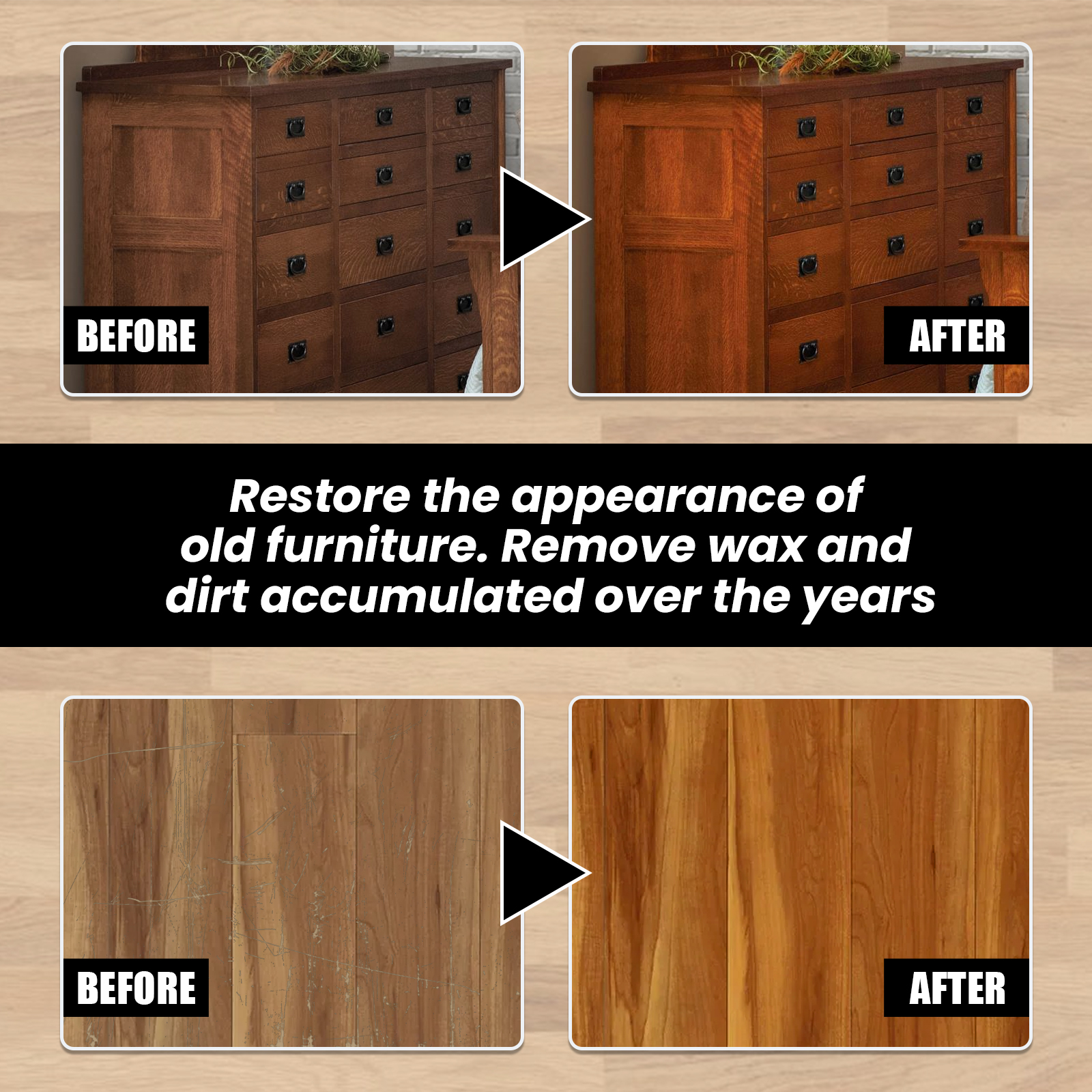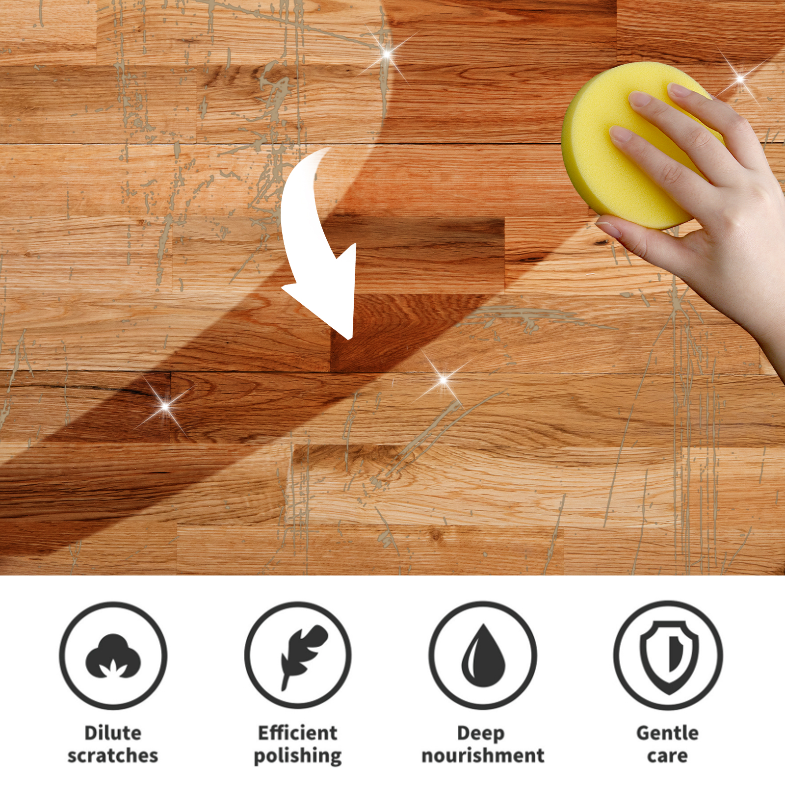 我们的木材抛光蜂蜡含有蜂蜡、鳄梨油。它可以去除木材表面的污垢,油脂和污垢,防止木材干燥和开裂,并使家具恢复生命,使其看起来干净;稀释划痕,有效抛光,给予木材深层营养。它的使用方法很简单:拧开本产品的盖子;将适量本品挤在木材上;用海绵或毛巾来回擦拭,使表面光亮。帮助清洁、护理、保湿木头,提供更好的保护;修复旧家具的外观,清除多年积累的蜡和污垢。