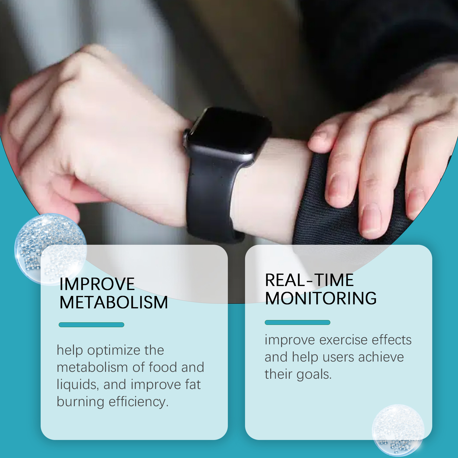 我们的减脂运动手表含有硅胶。它可以帮助优化食物和液体的新陈代谢,提高脂肪燃烧效率。它的使用方法很简单:只需将本产品直接戴在手腕上。并且可以提高锻炼效果,帮助使用者达成目标。