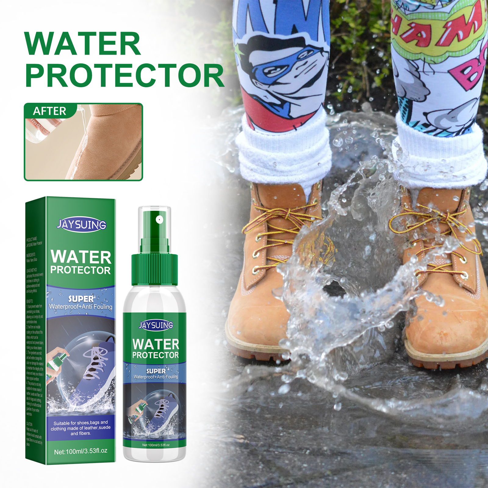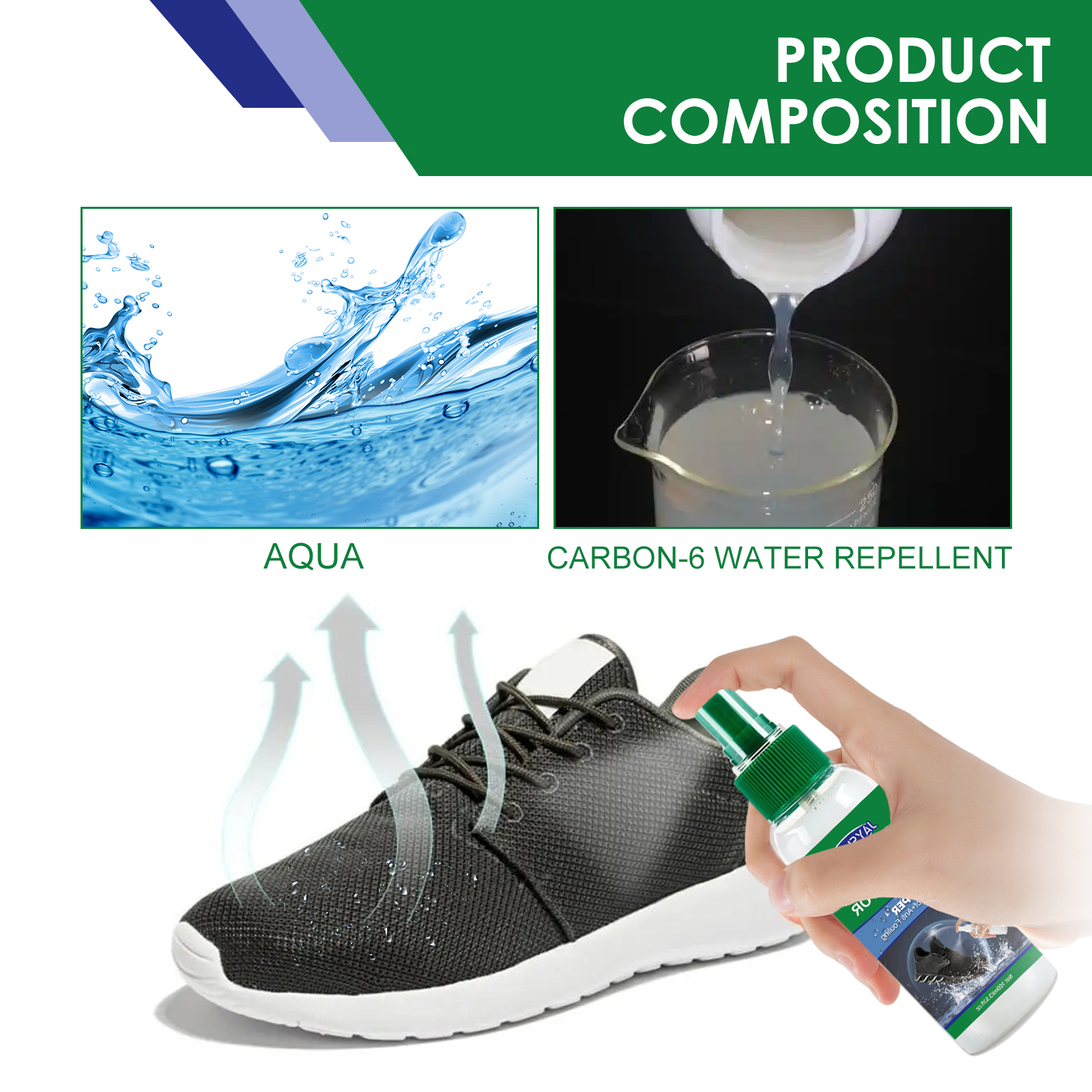 我们的鞋类防水喷雾含有水、碳6防水剂。它可以环保,晶莹剔透的污渍和溢出保护持续通过多次洗涤,不改变织物的颜色,质地或透气性;不易燃的,非喷雾剂:对您的宠物和环境都是安全的-易于使用,无需准备或个人防护设备,只需喷洒并晾干;使用安全,工作人员为您和您喷上它的一切提供最终的污点,污垢和防水防御的任何种类的鞋类,包括皮革和麂皮靴等。它的使用方法很简单:只需将本品均匀喷洒在鞋子或衣服上,即可达到防水防污的效果。鞋类防水喷雾创造无形的屏障,排斥液体。