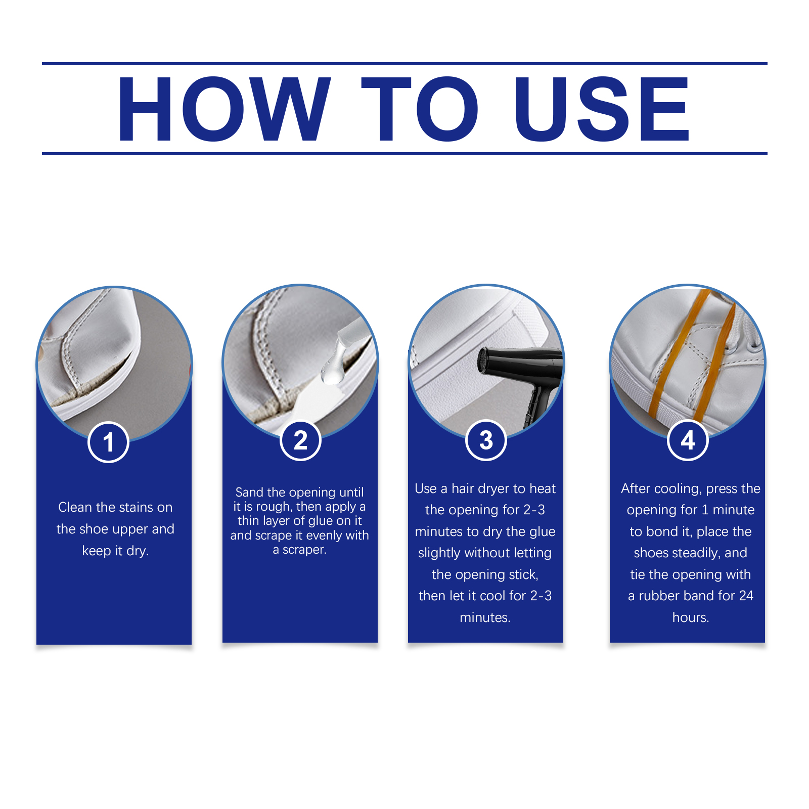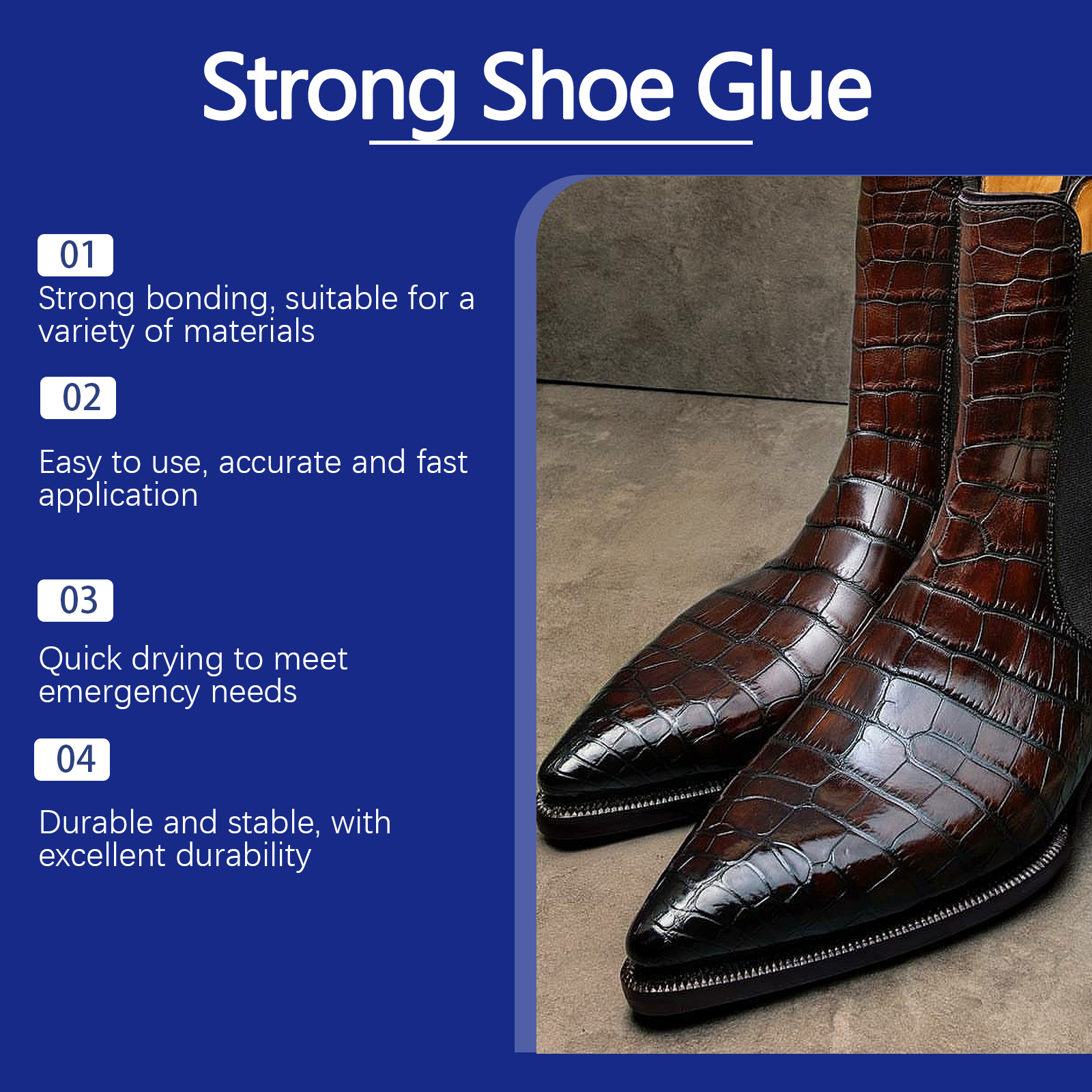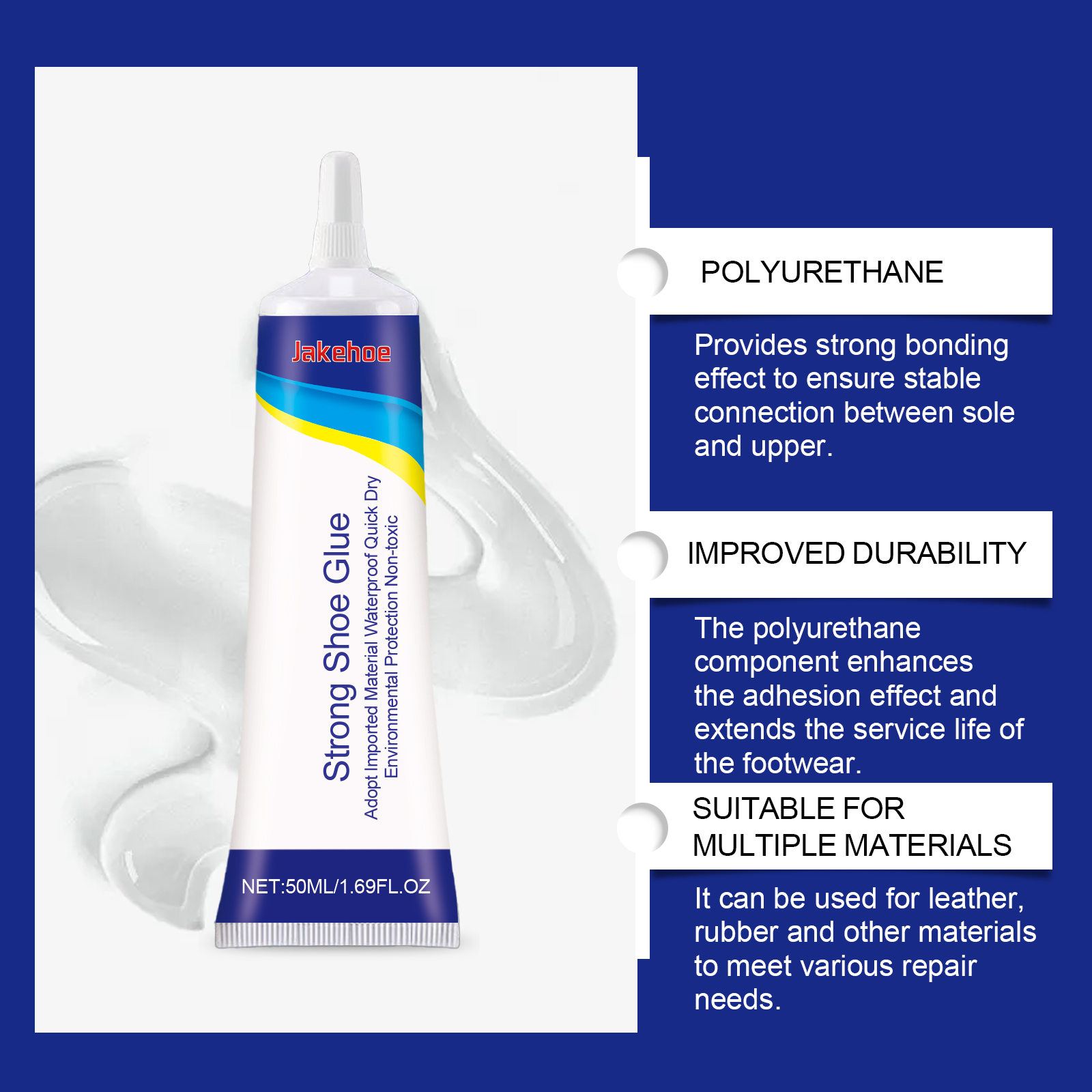 我们的多用途鞋胶含有聚氨酯。它可以独特的配方牢固固定鞋面和鞋底,延长使用寿命。它可以轻松应对皮革、帆布、橡胶等各种材料的维修需求。它的使用方法很简单:清洗鞋面上的污渍,并保持干燥,在开口处打磨,直到它粗糙,然后在上面涂上一层薄薄的胶水,用刮刀刮均匀。用吹风机将开口加热2-3分钟,使胶水稍微干燥,不让开口粘住,然后让它冷却2-3分钟。冷却后,按开口1分钟使其粘合,将鞋子稳固放置,并用橡皮筋将开口系上24小时。并且可以独特而强大的配方快速粘合鞋面和鞋底,确保稳定性和耐用性。