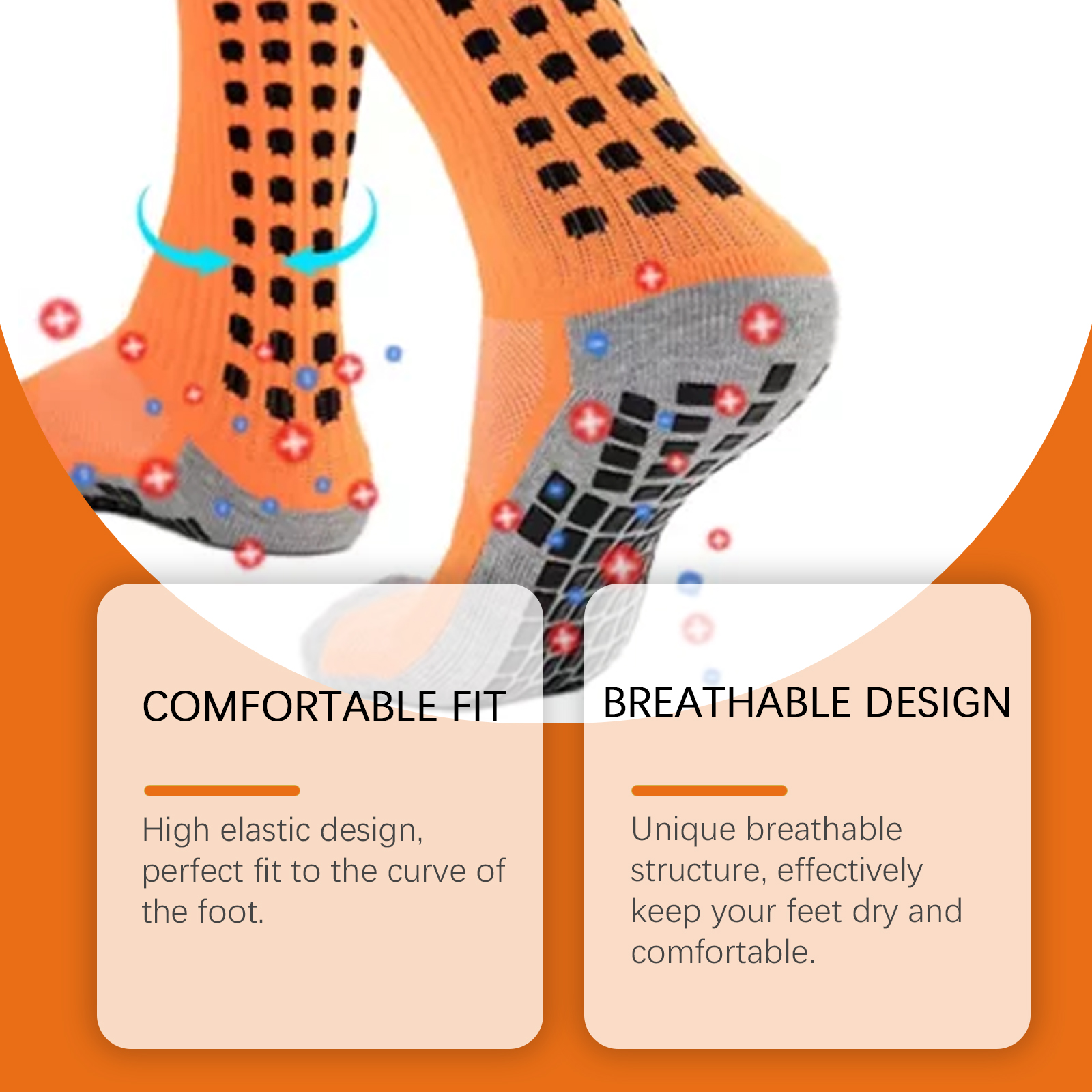 我们的运动点胶护理袜含有100%聚酯纤维。它可以完美贴合脚部曲线。它的使用方法很简单:只需将此产品直接穿在脚上。并且具有独特的透气结构,有效保持您的双脚干燥舒适。