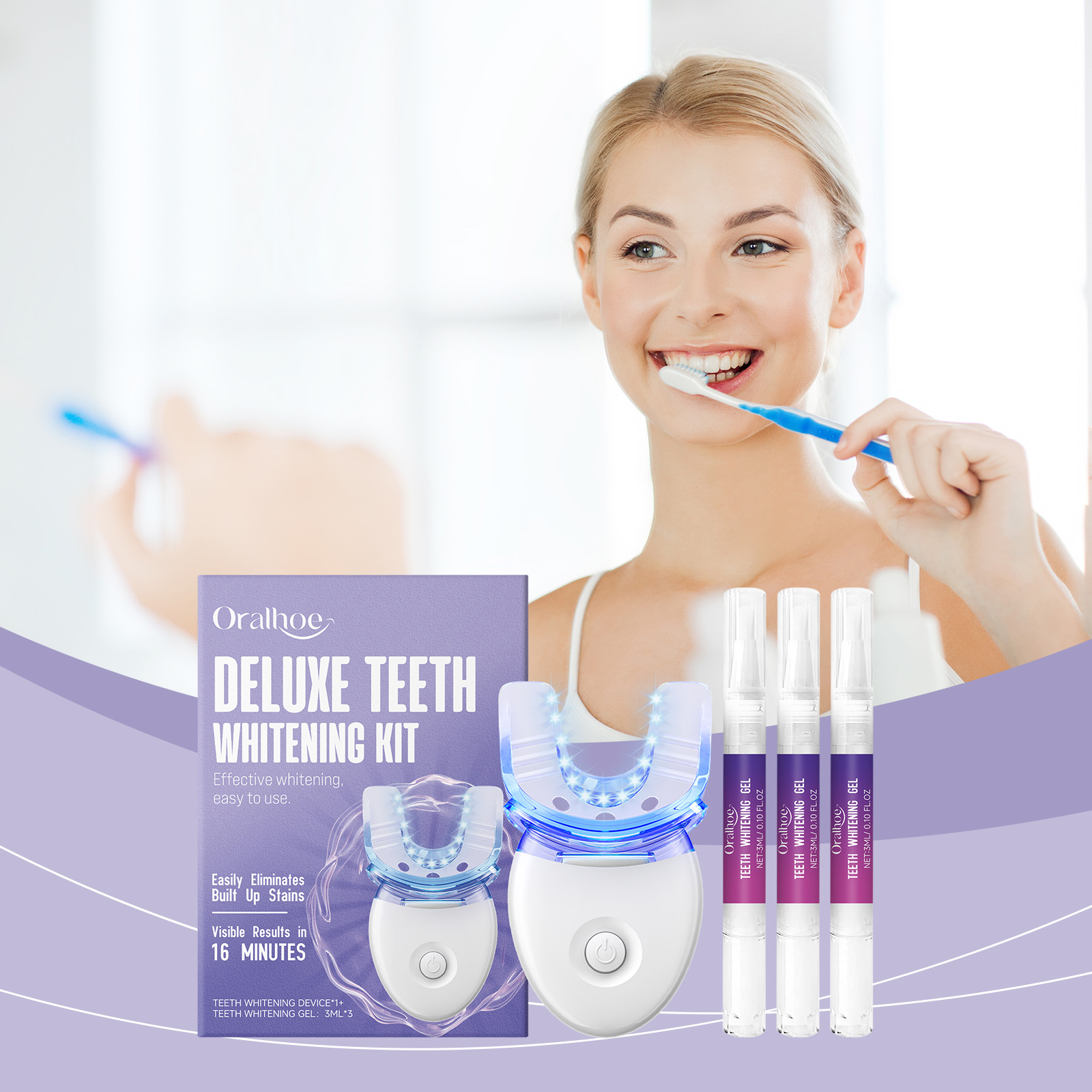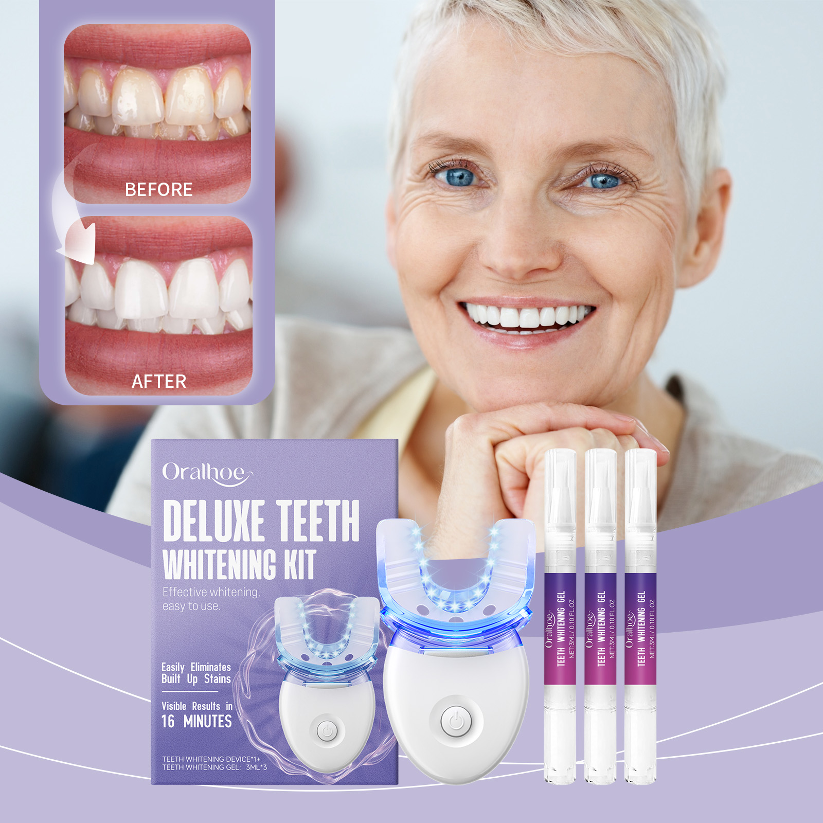 我们的牙齿护理套装含有山梨酸钾、卡波姆。它可以只需轻轻一抹即可瞬间变白,见证瞬间的炫目变化。笔形设计,精确定位污渍。它的使用方法很简单:在牙齿上涂一层薄薄的凝胶,避开牙龈和嘴唇。插入美白装置,咬下,打开装置。使用16分钟后,灯会自动熄灭。取出设备,漱口,用水清洗设备。并且可以高效美白、深层清洁,并即时改善牙齿的颜色。