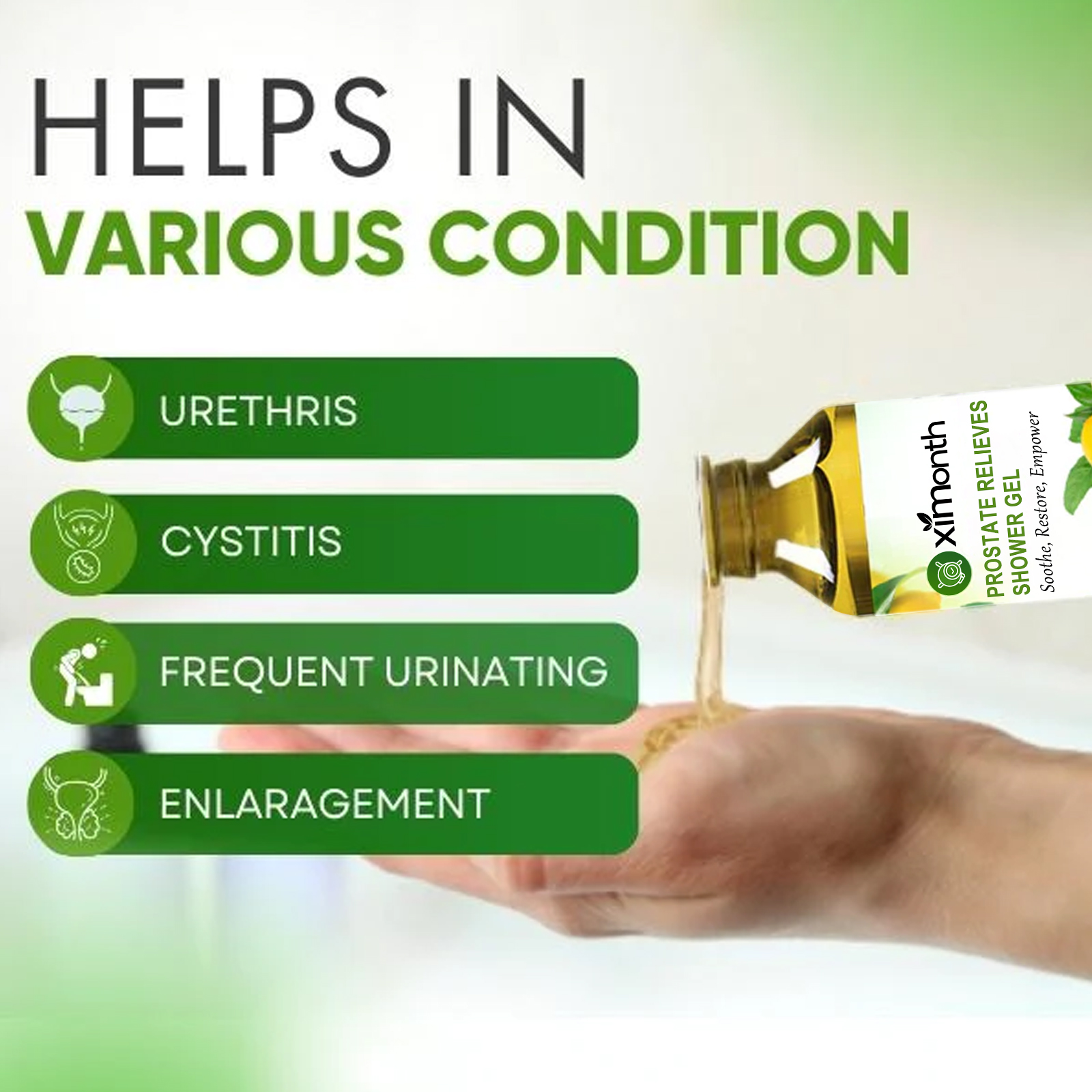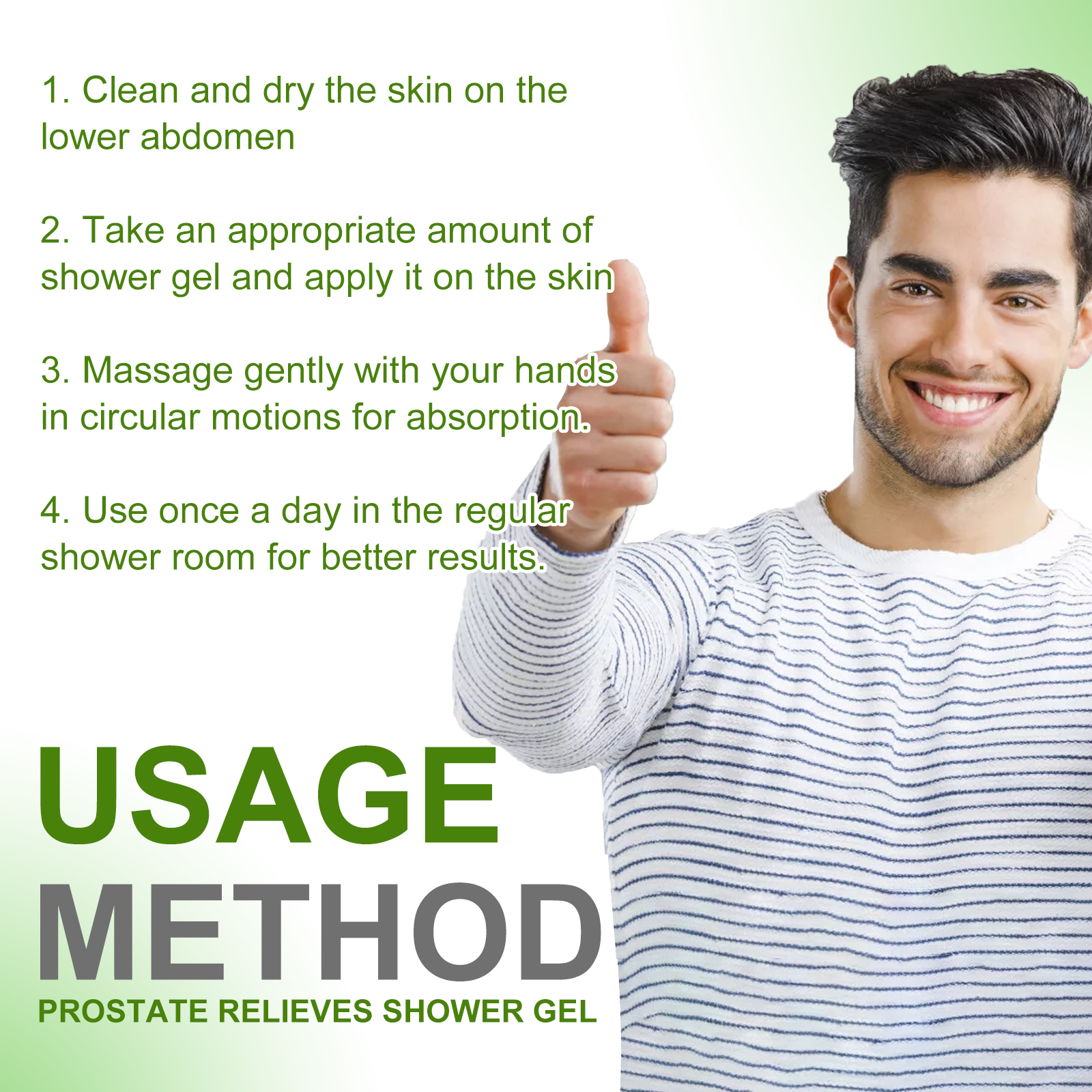 我们的男士沐浴露,含有柠檬提取物、七叶树提取物、洋甘菊提取物。它可以解前列腺不适,减少和维持正常的前列腺大小,加强膀胱控制减少尿频和尿急,增强前列腺功能,缓解由前列腺引起的压力。它的使用方法很简单:首先清洁并擦干小腹皮肤,取适量沐浴露涂抹在皮肤上,用手做圆周运动,轻轻按摩以吸收,每天在普通的淋浴间使用一次。有利于减少紧迫感,晚上使用浴室频率,改善小便流,缓解背痛。